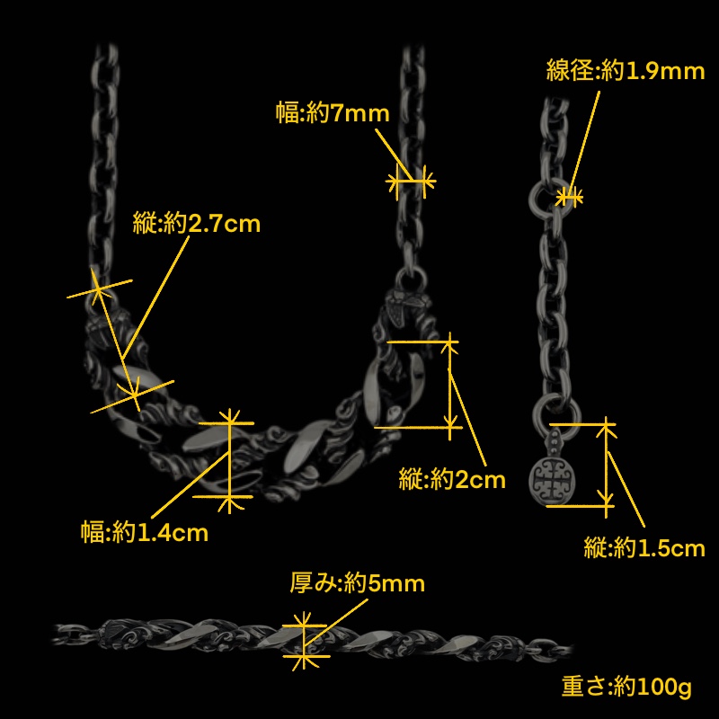 交互に連結させた両吊りの形で、着用した時に9連の喜平コマが正面にくるデ