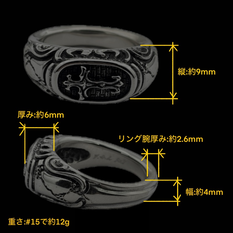 リングの中央にブラッドレスクロスモチーフを配置した印台型リング。「トゥーム