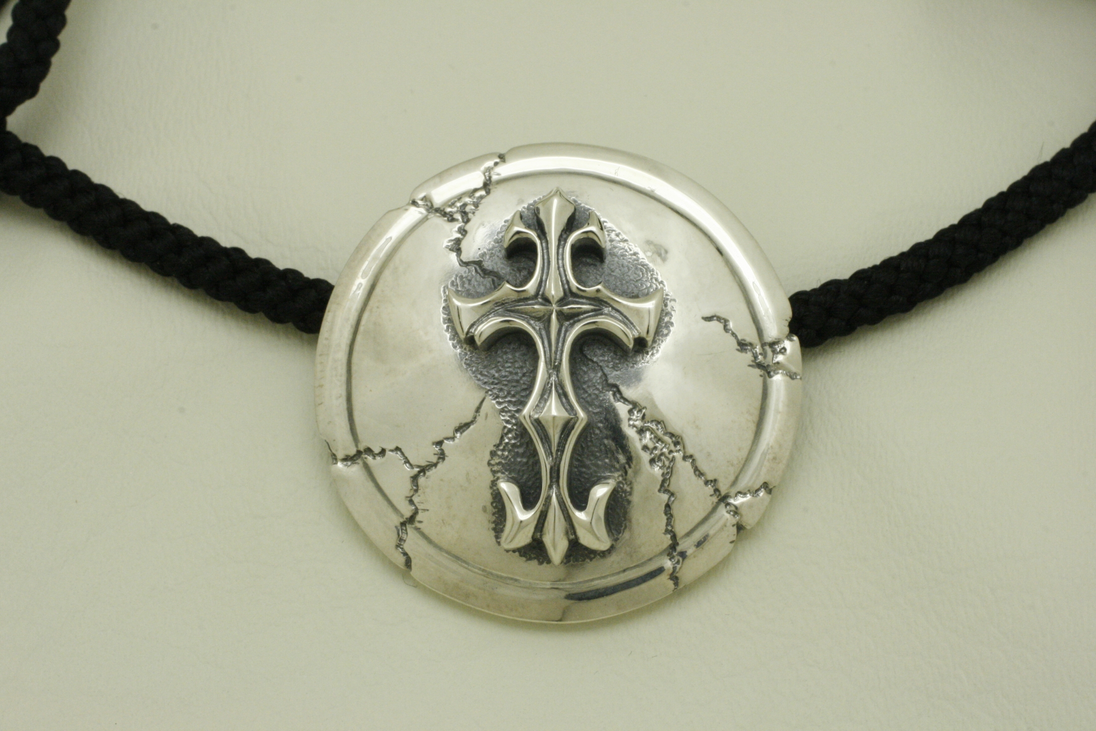 面にはクロスデザインが立体的に配置されており、周囲にはクラック模様が彫