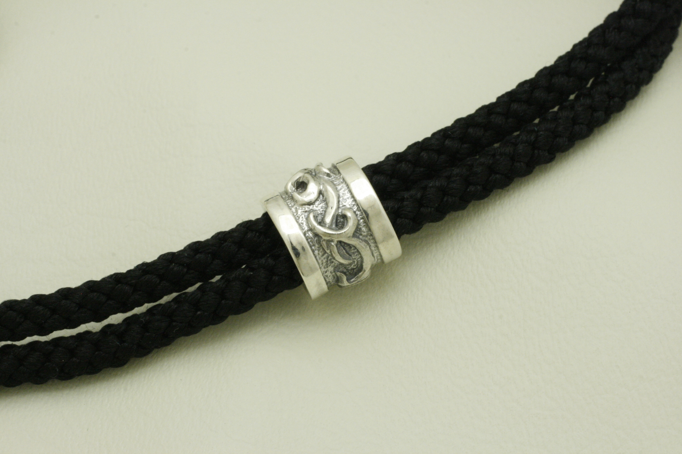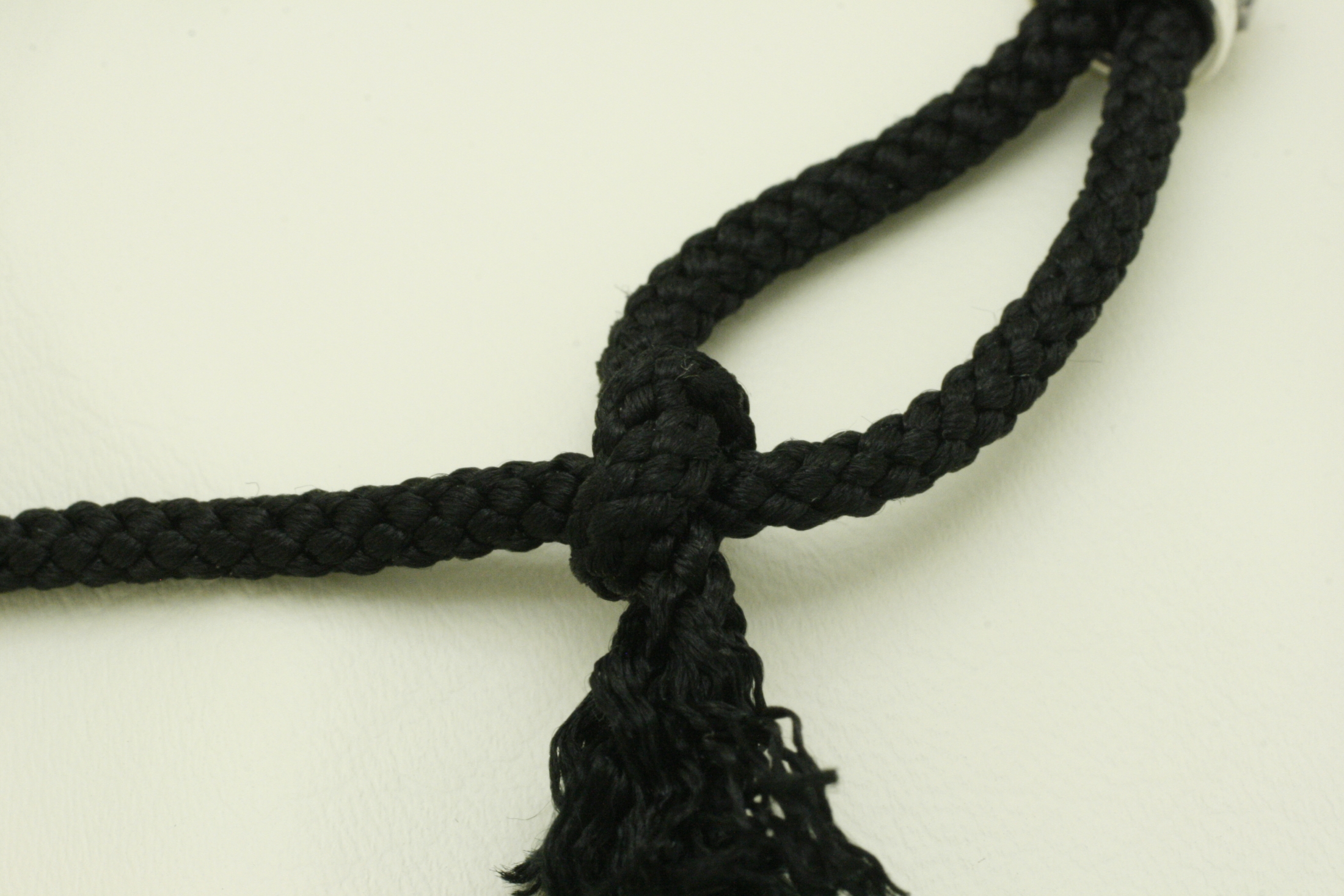 り込まれている。ブラックの組紐で構成し、両サイドの結び目をスライドさせる