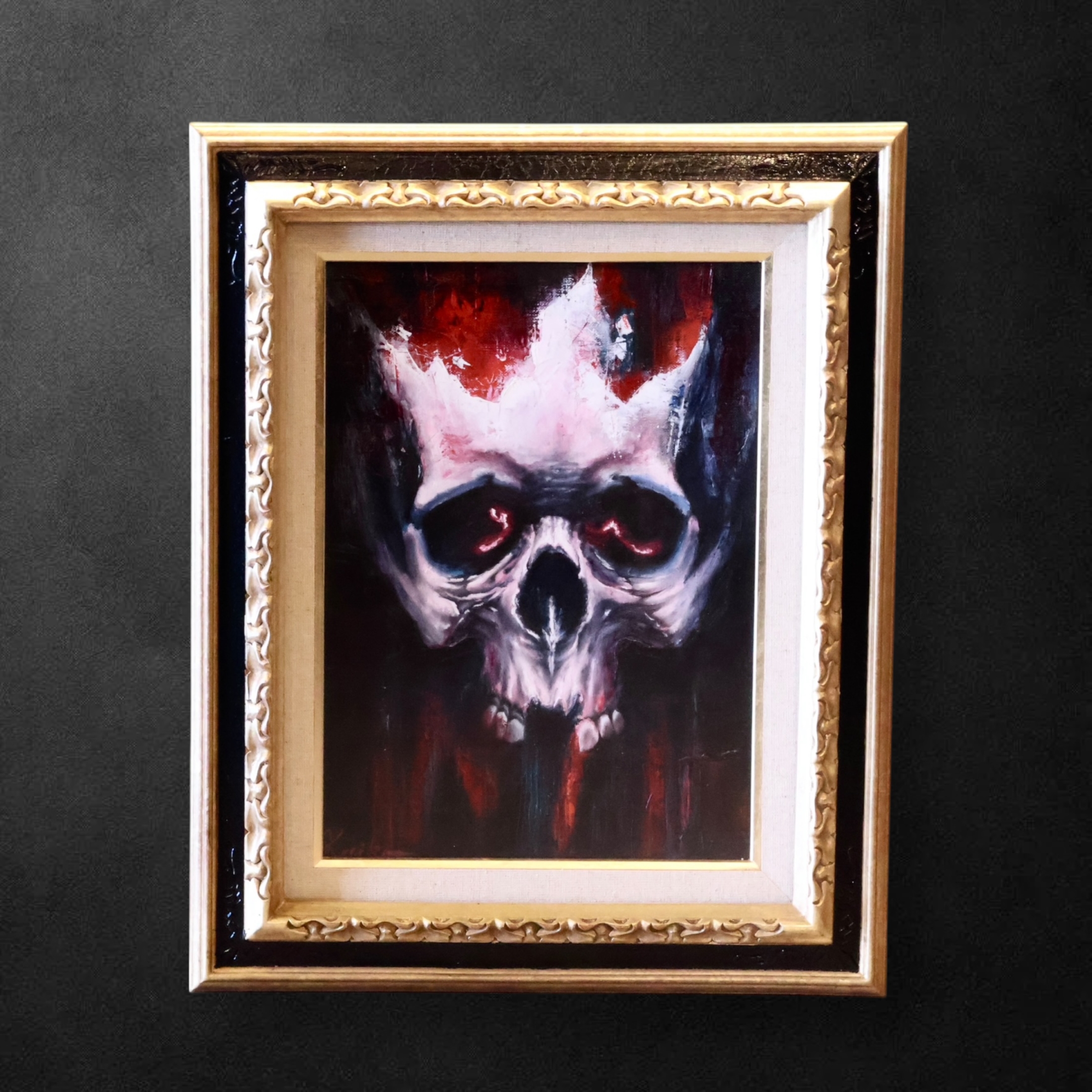 さを感じられる一枚。背景の黒色と赤色の中にも筆の流れがあり、油絵独特の
