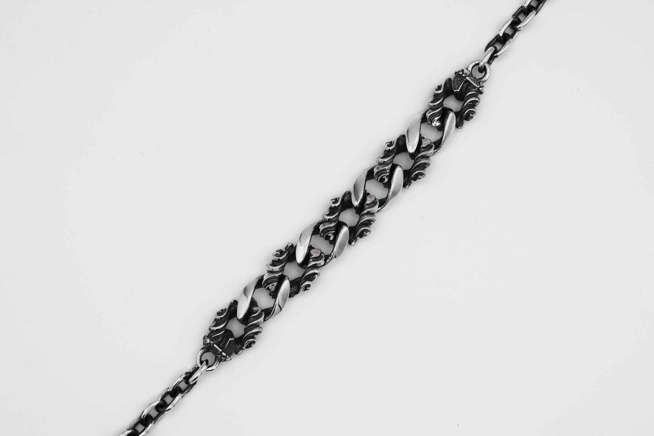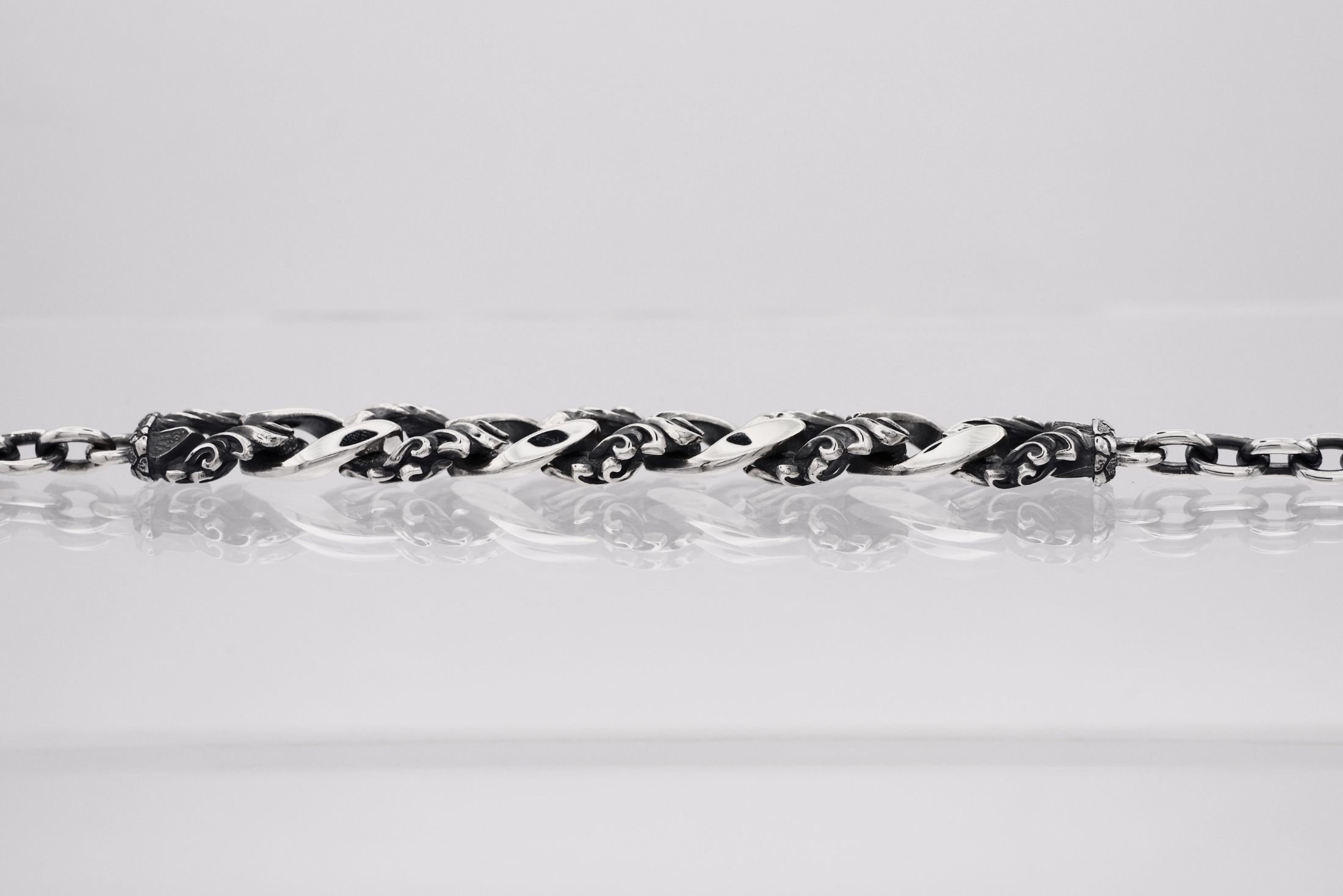 交互に連結させた両吊りの形で、着用した時に9連の喜平コマが正面にくるデ