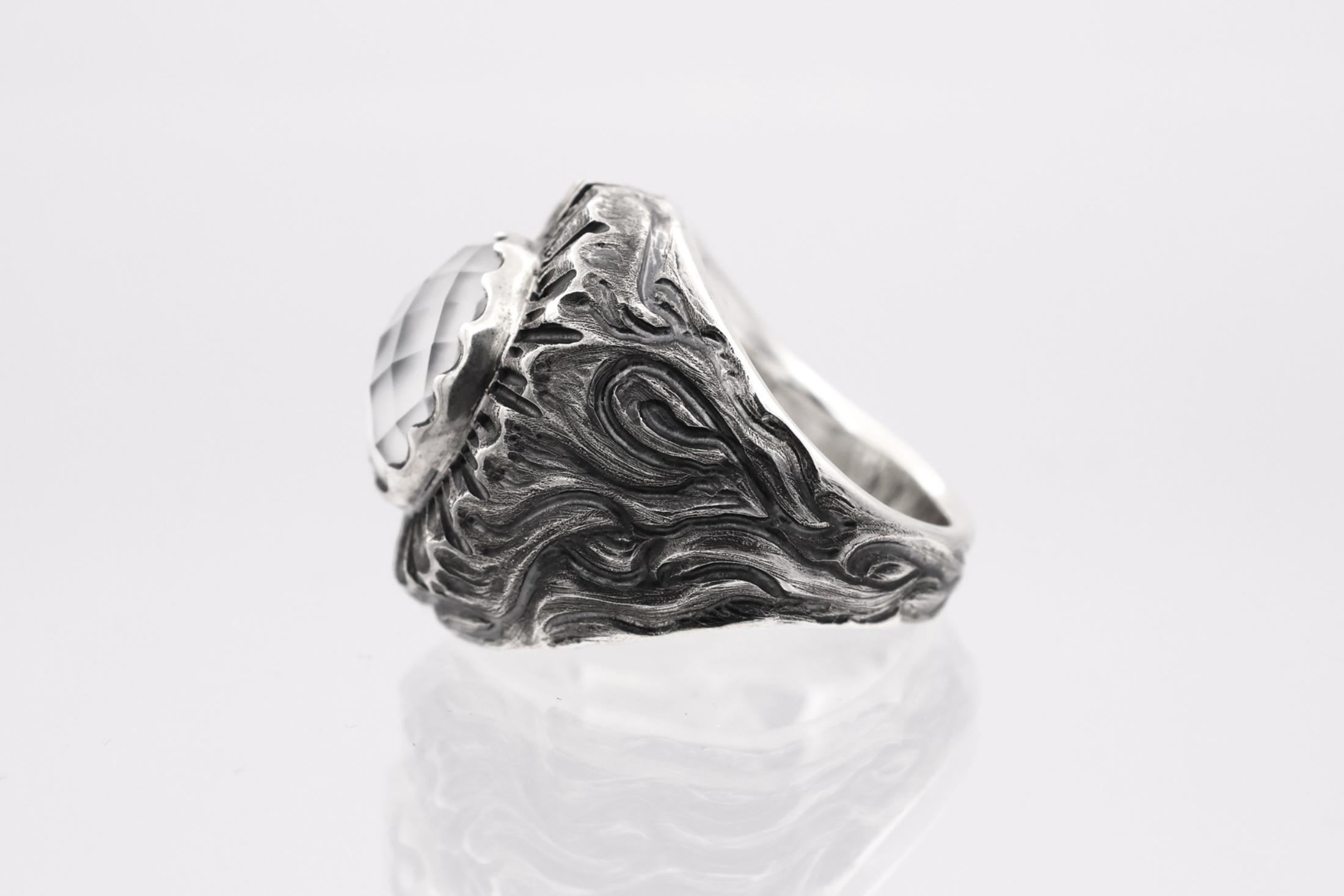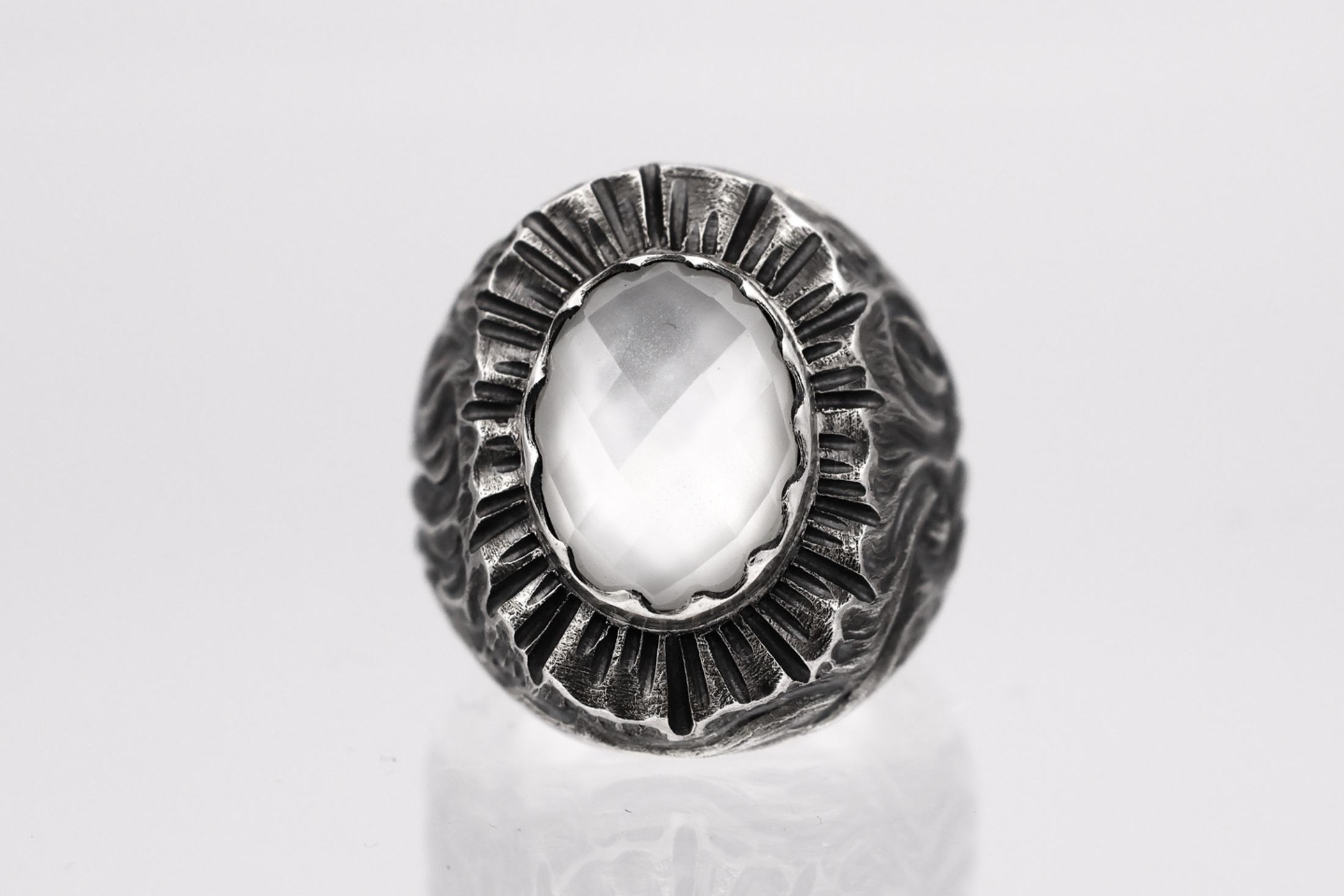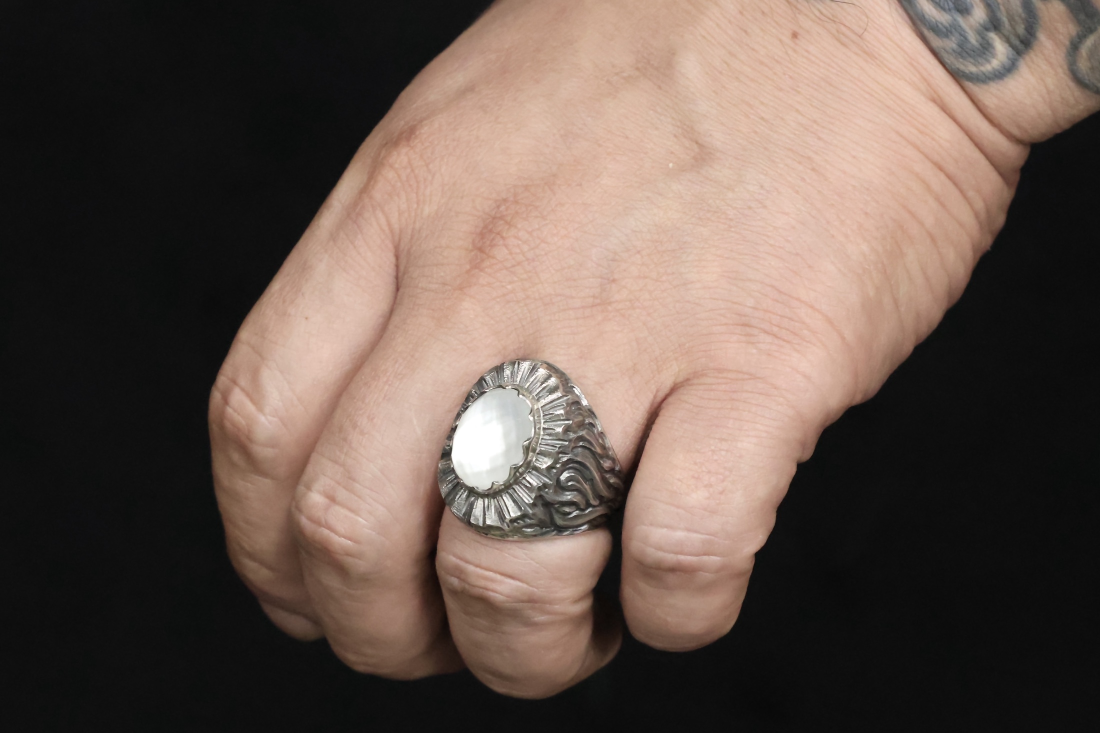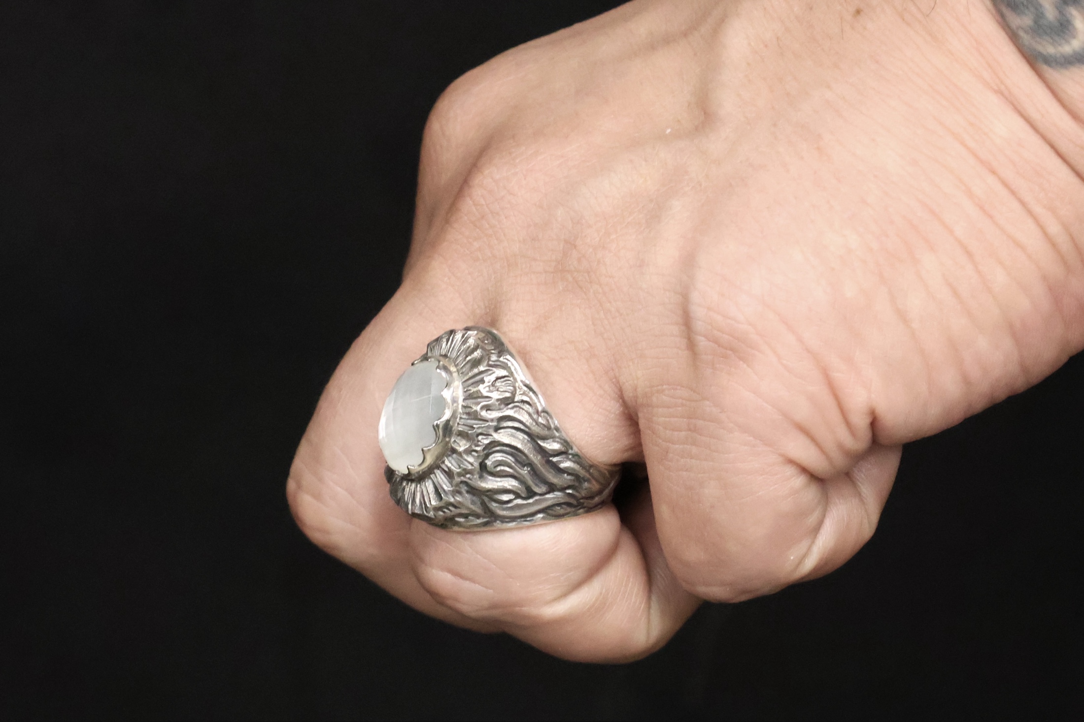 16×12mmの大きな石を主役に、エンジェルラダー(後光)のような彫刻がされ