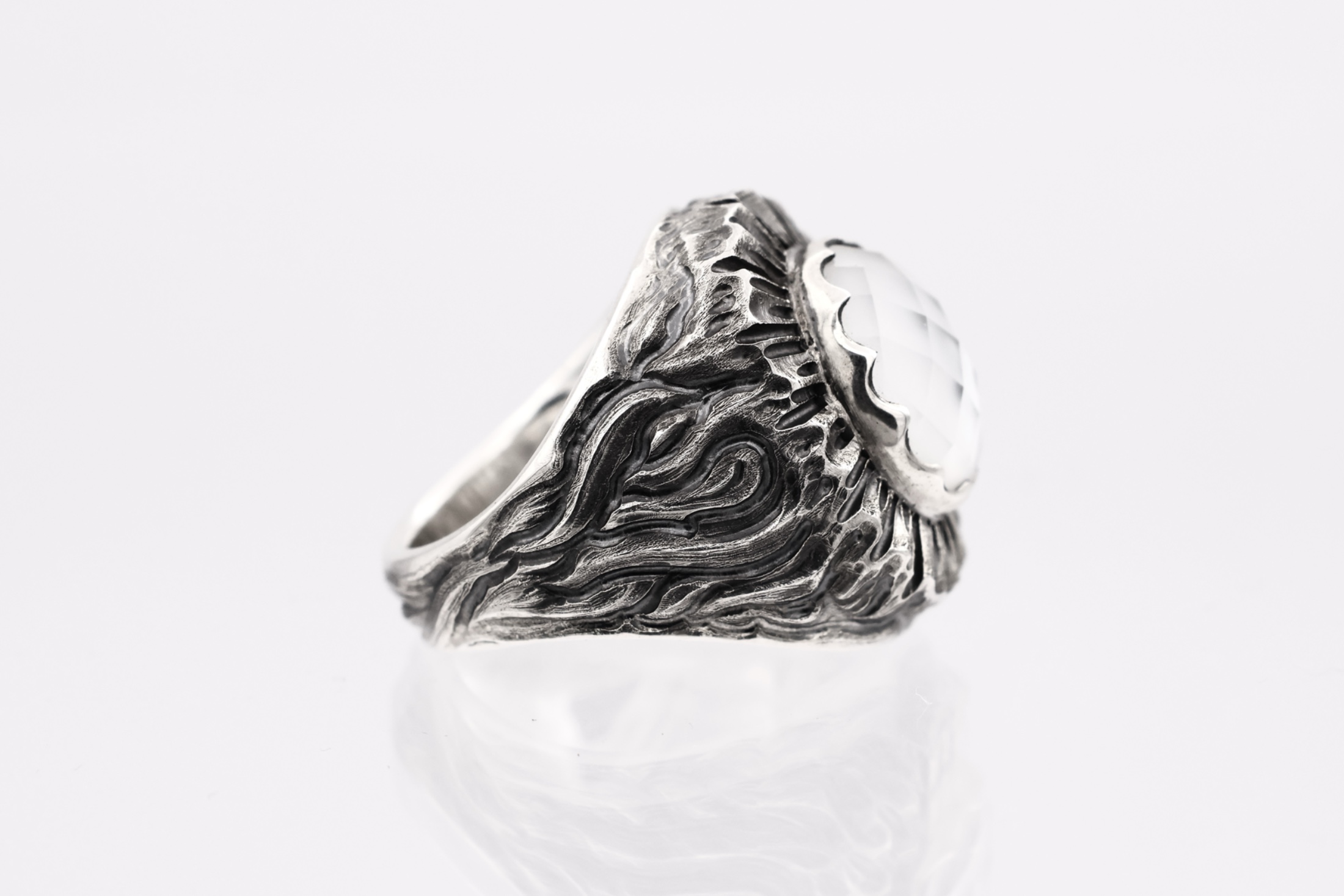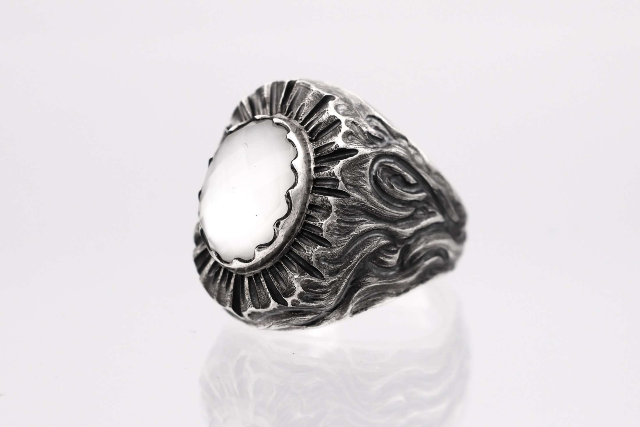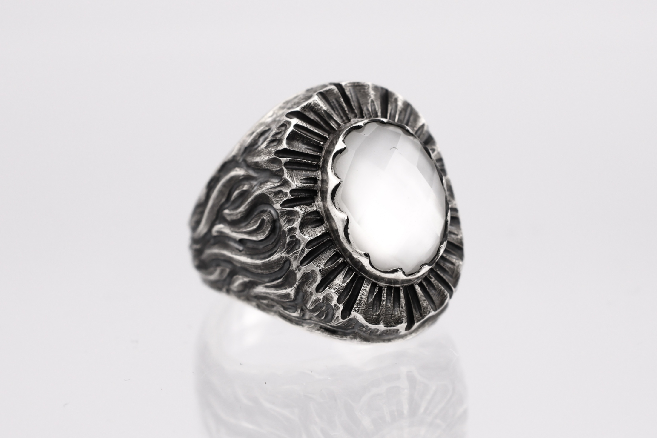 白蝶貝をトップにセッティングした印台型のリング。オーバルチェッカーカットで