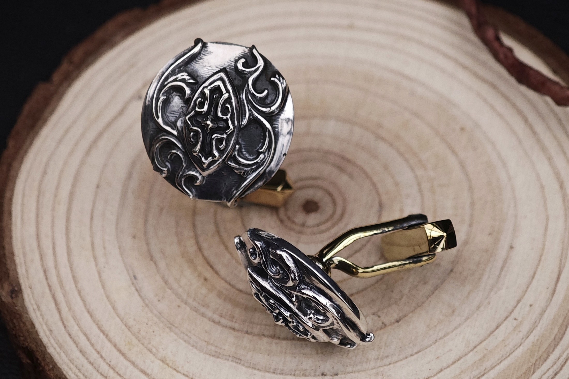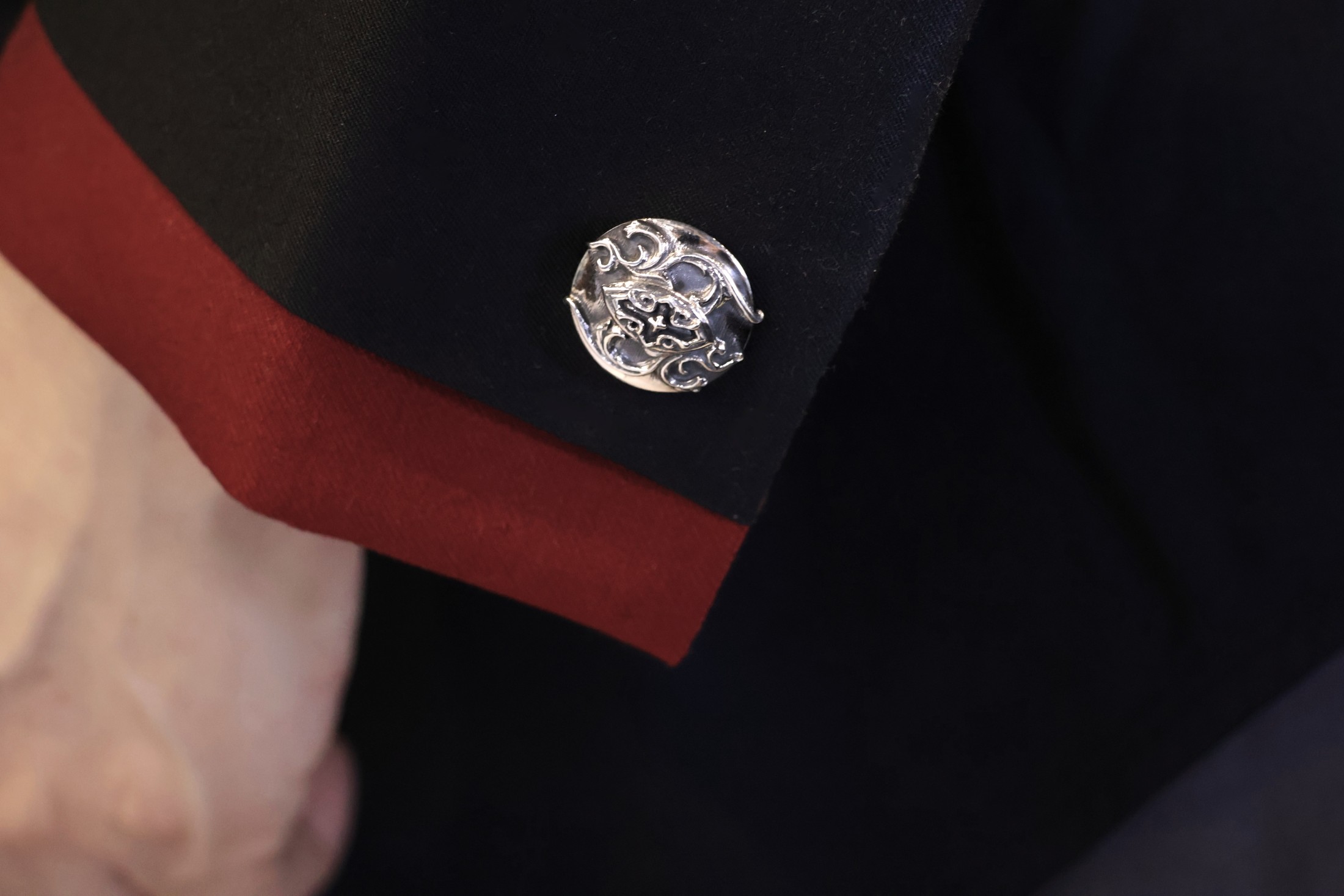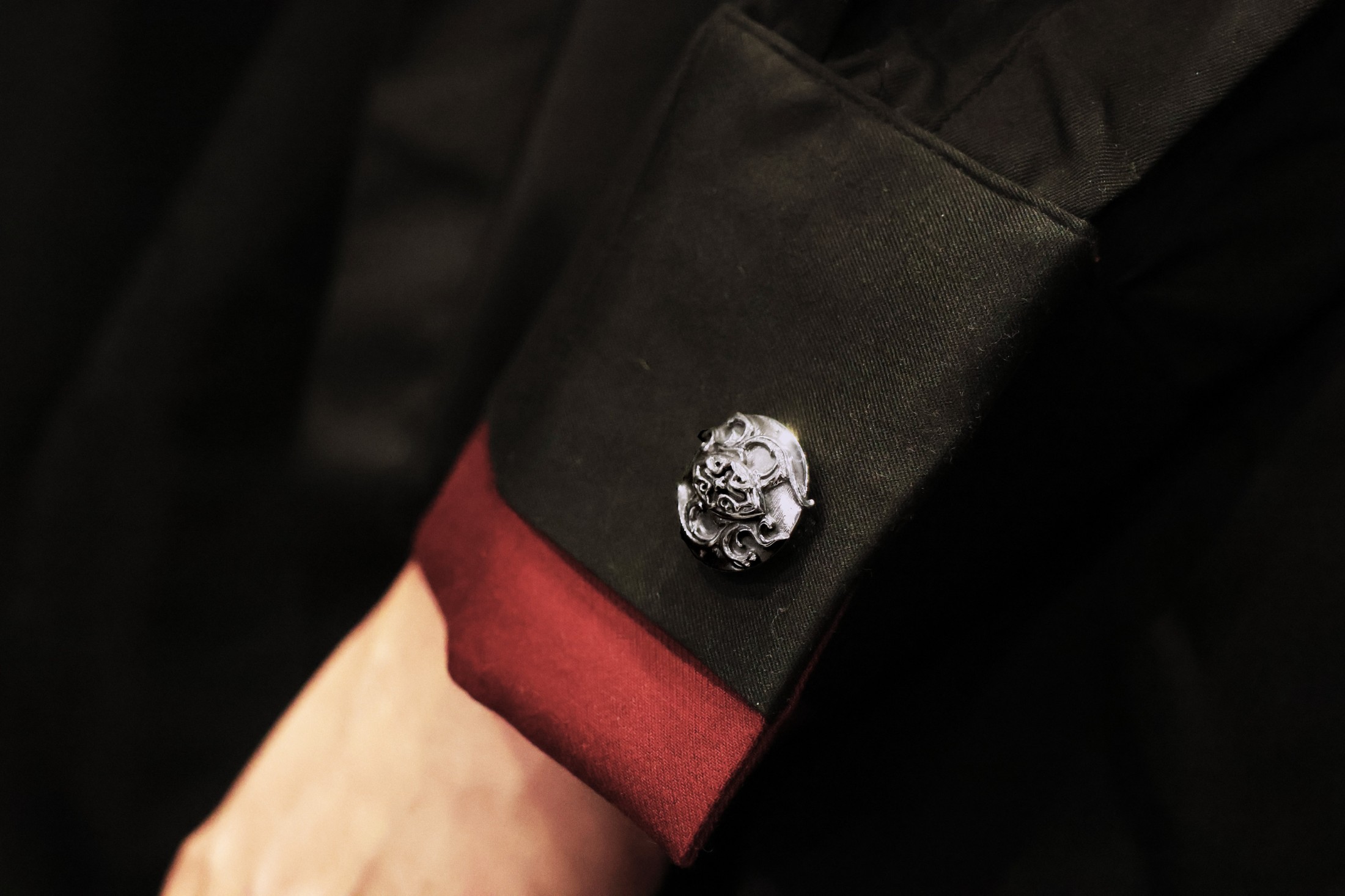 「女王の墓」のイメージで紋章調のデザインを施されたカフス。中央のアンダー