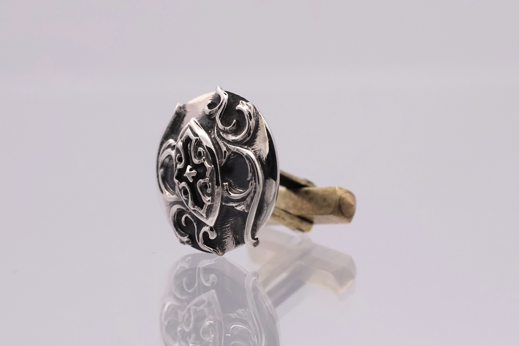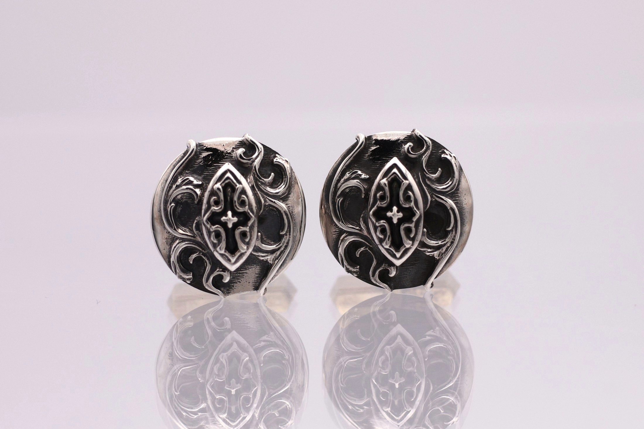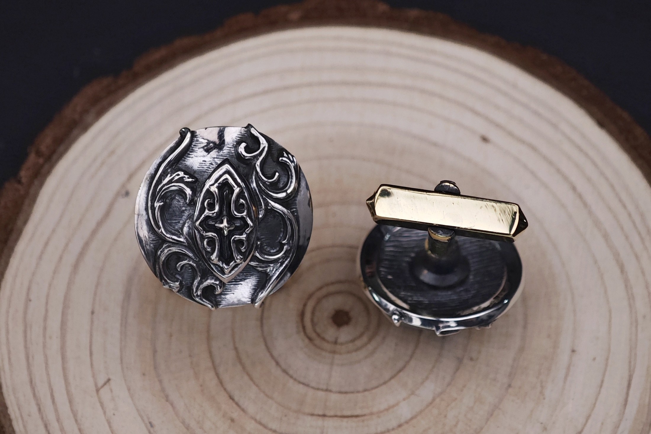 「女王の墓」のイメージで紋章調のデザインを施されたカフス。中央のアンダー