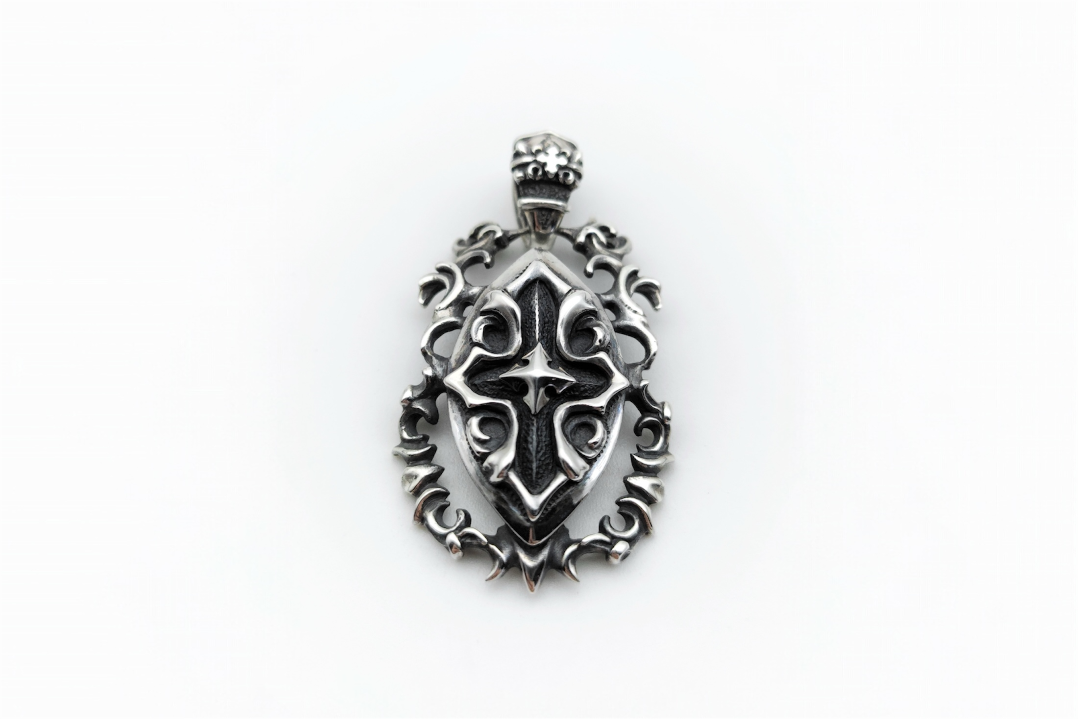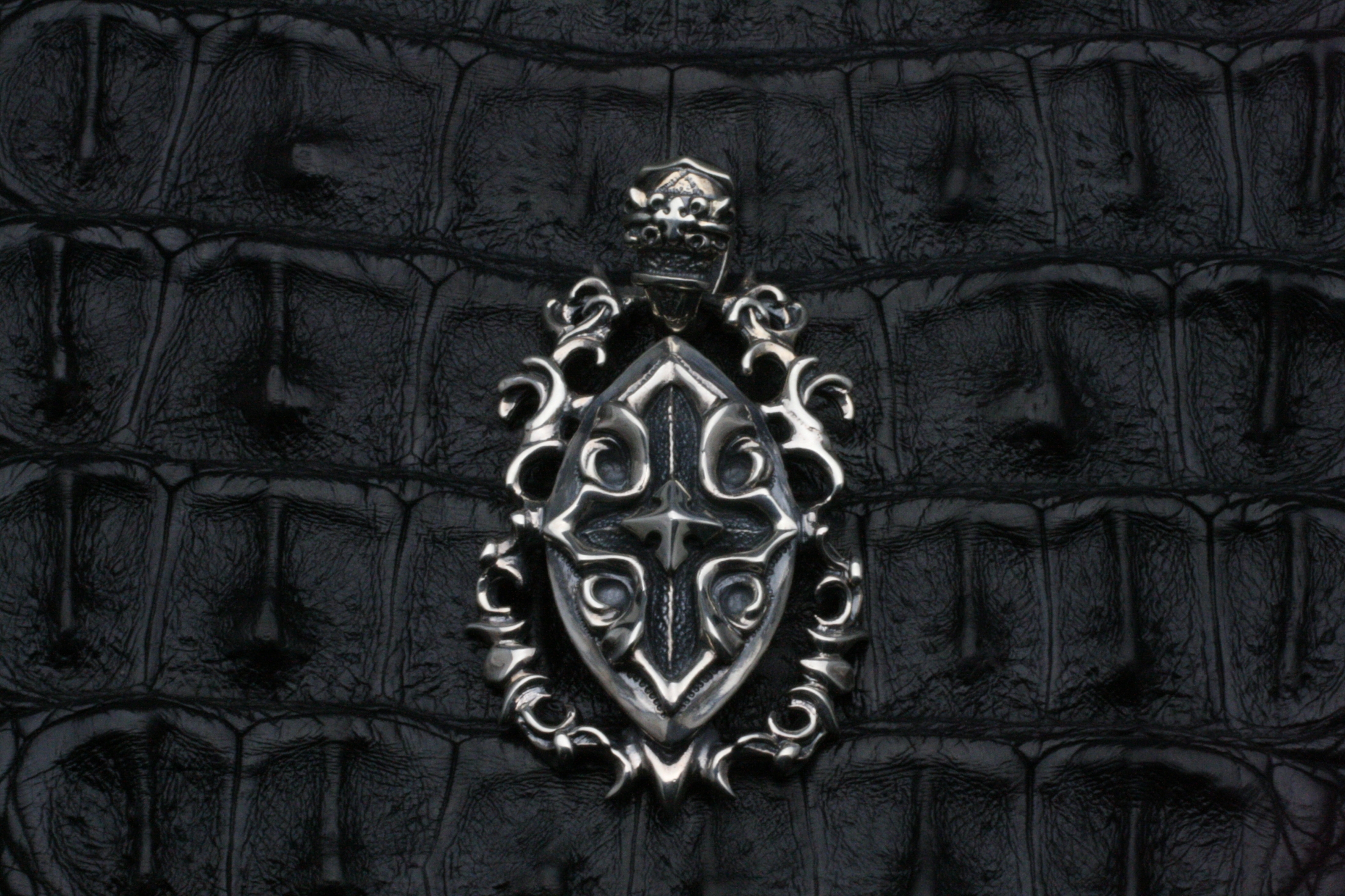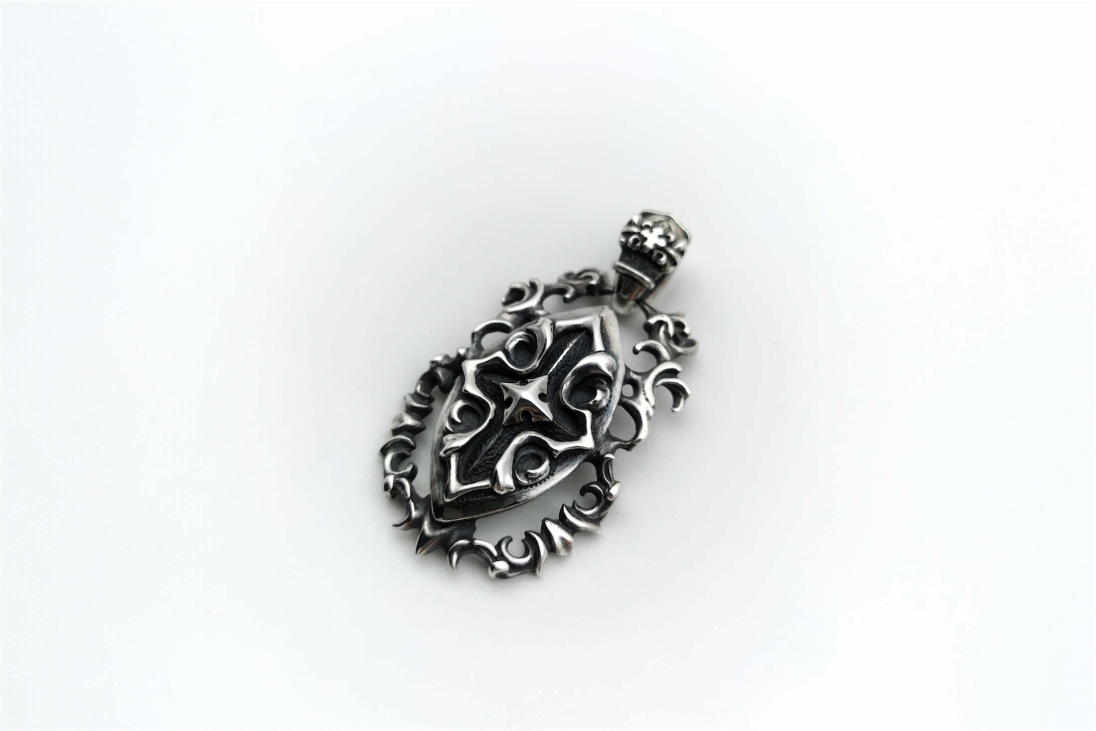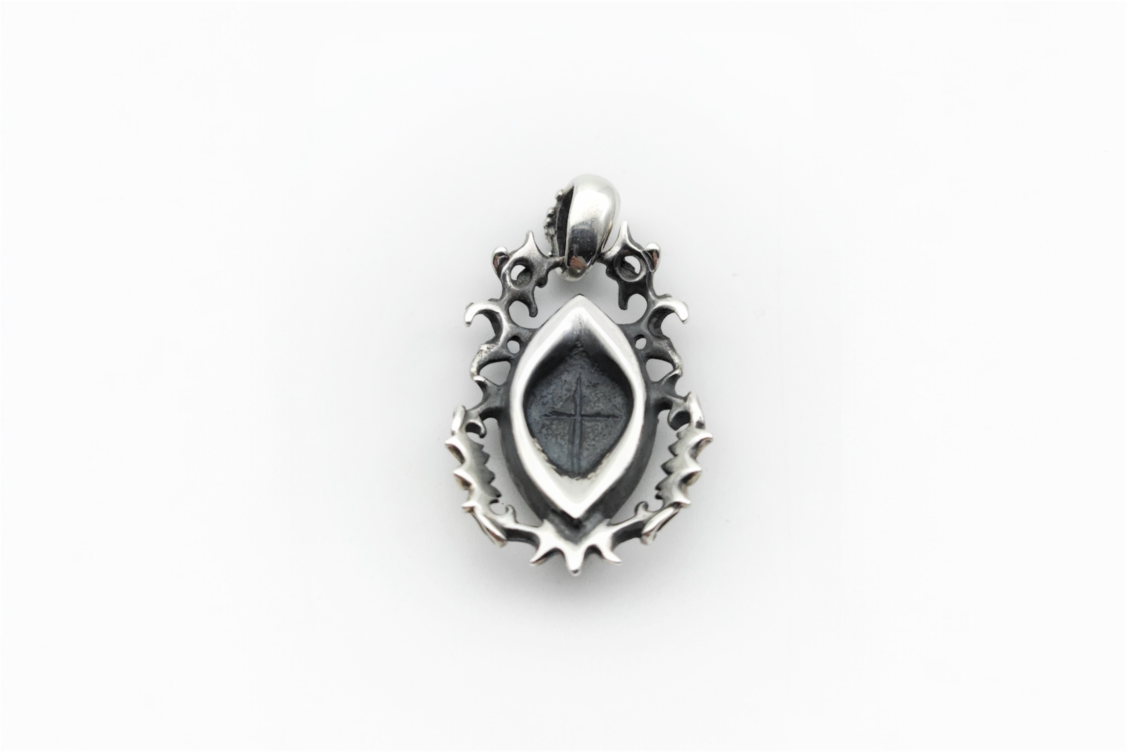 大きなクロスの上に小さいクロスを乗せたマーキス型のペンダント。周りには