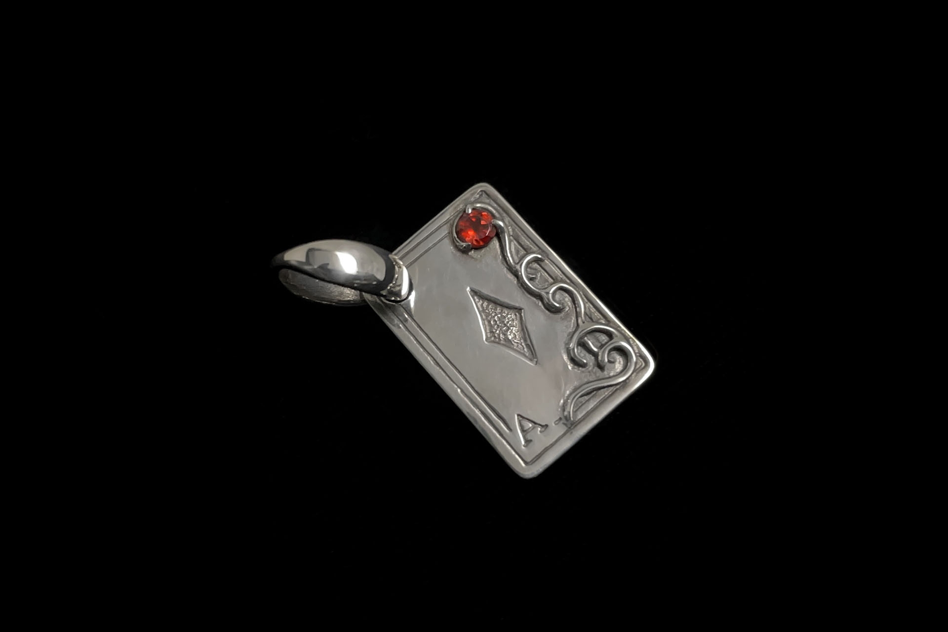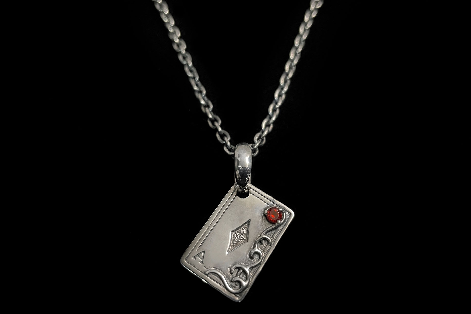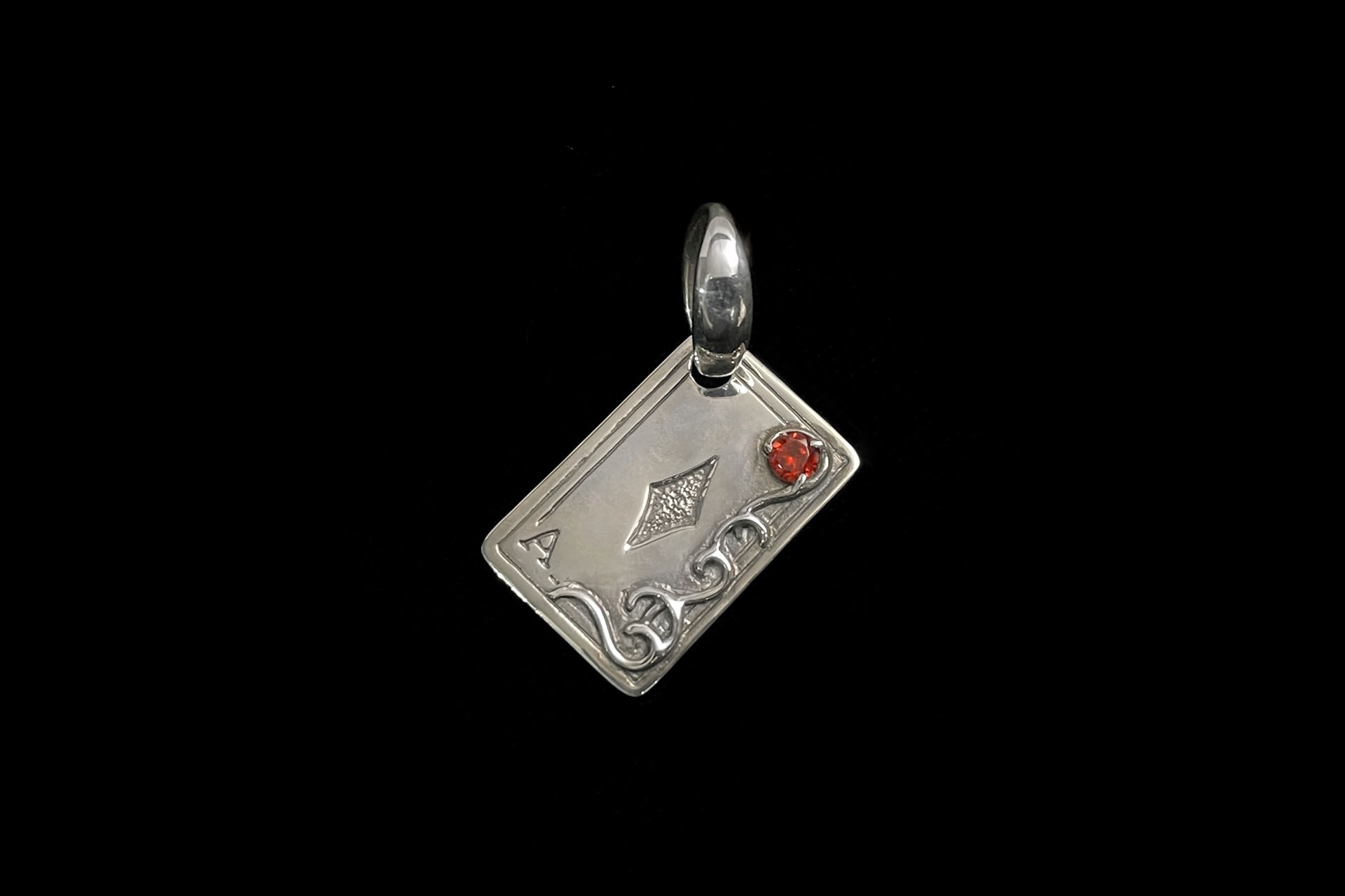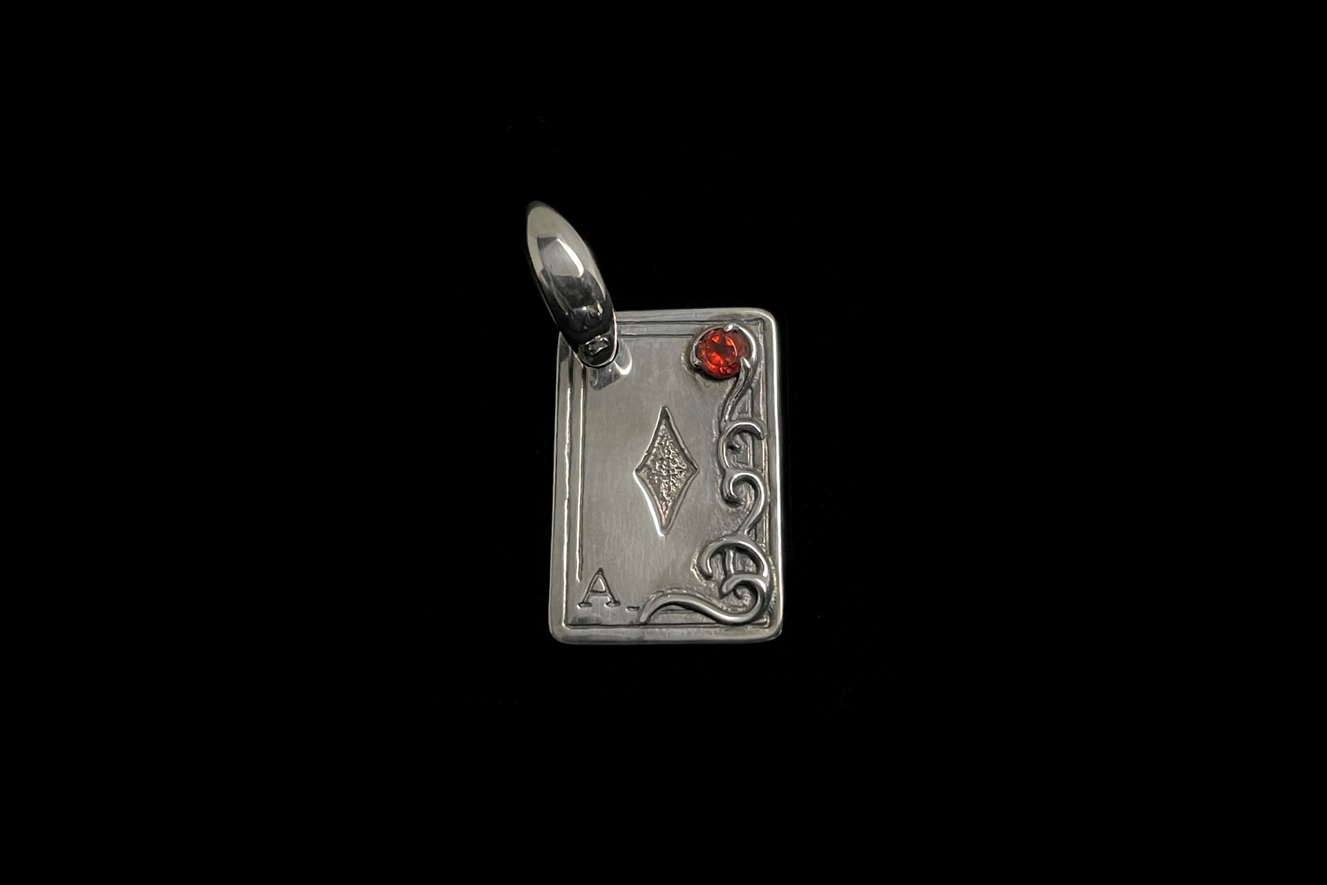 るペンダント。右上にはスートのカラーに合わせたストーンをセッティング。バチ