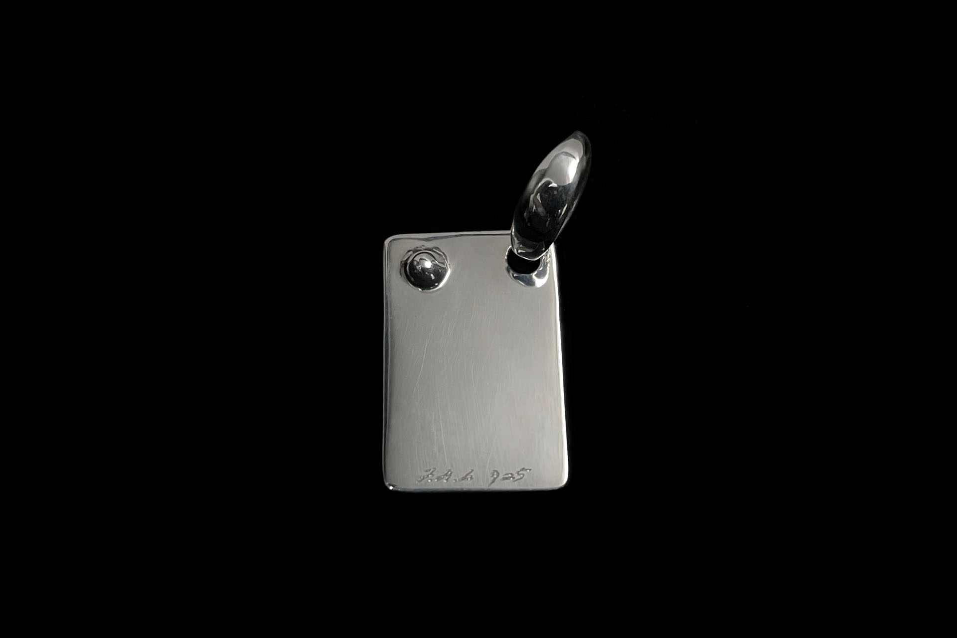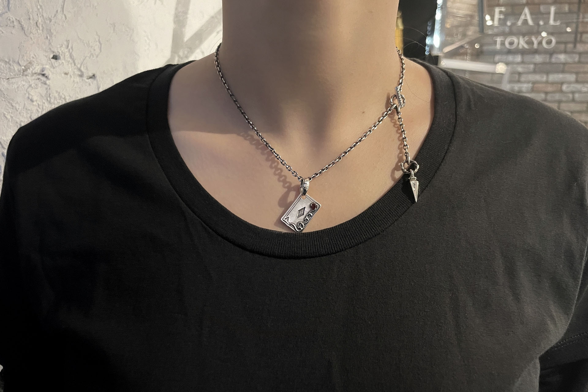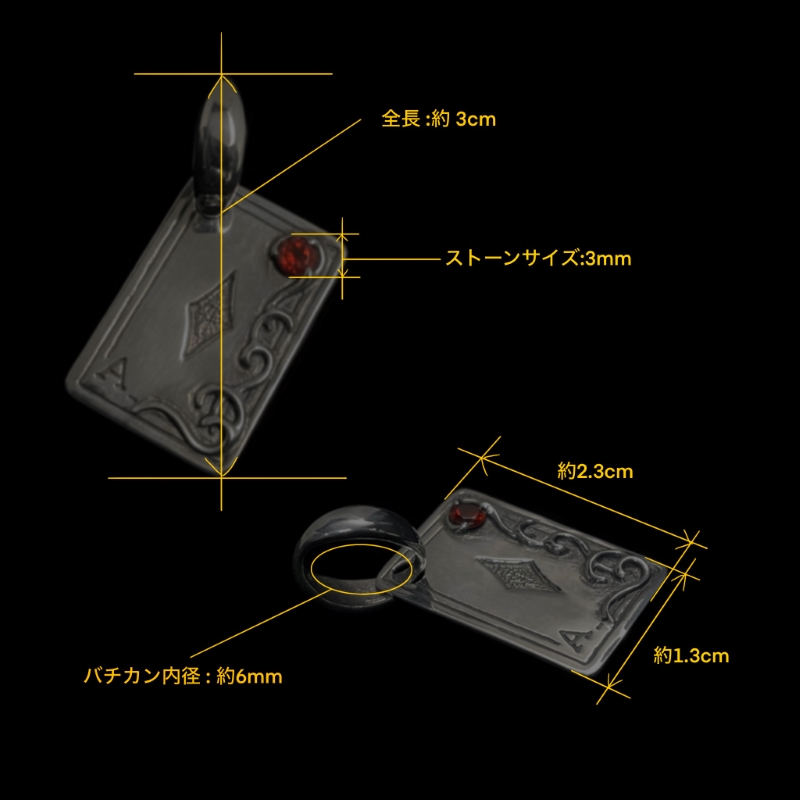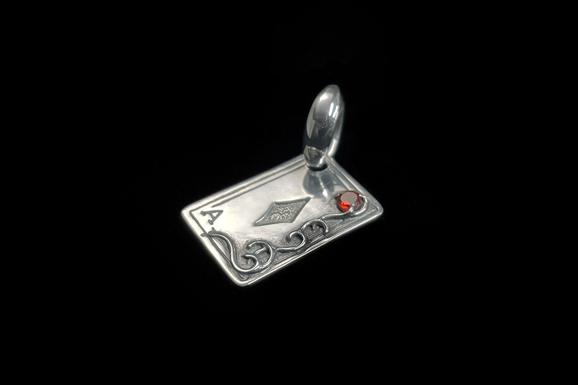 るペンダント。右上にはスートのカラーに合わせたストーンをセッティング。バチ