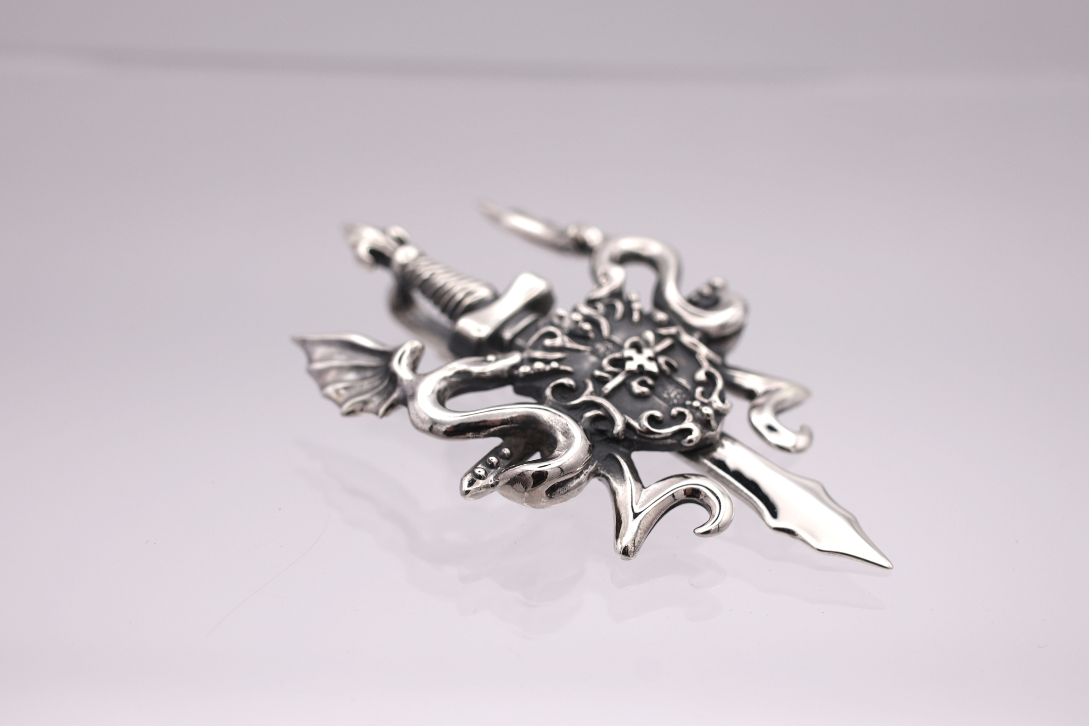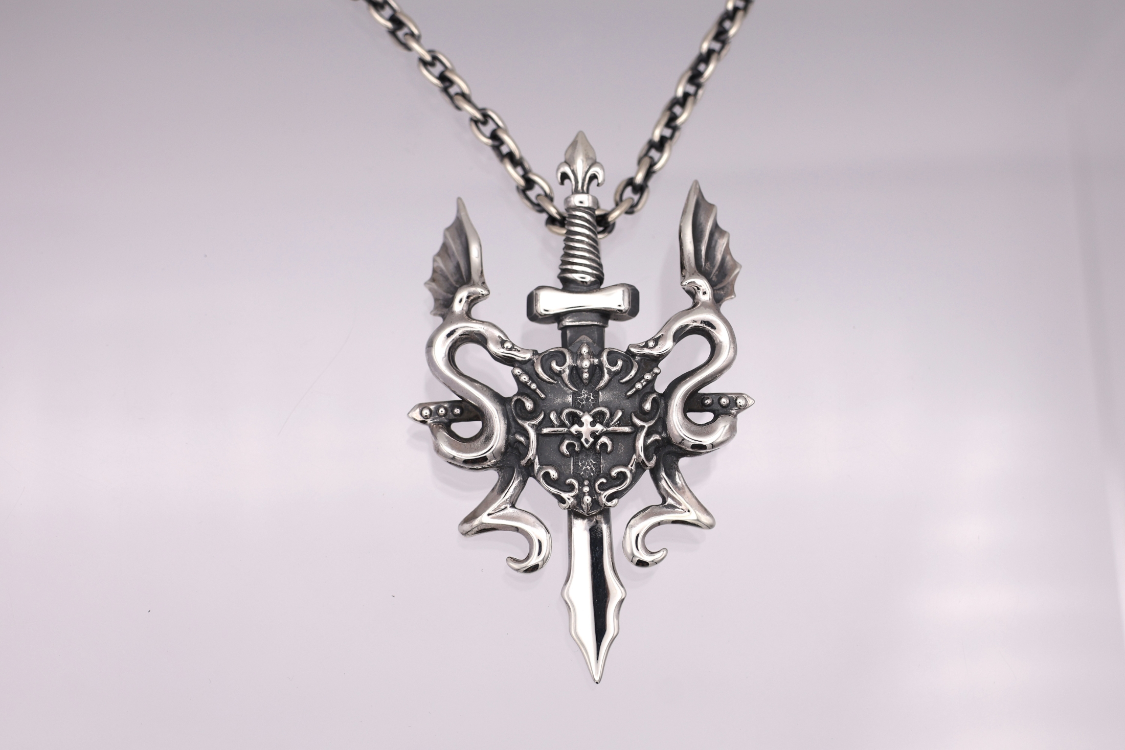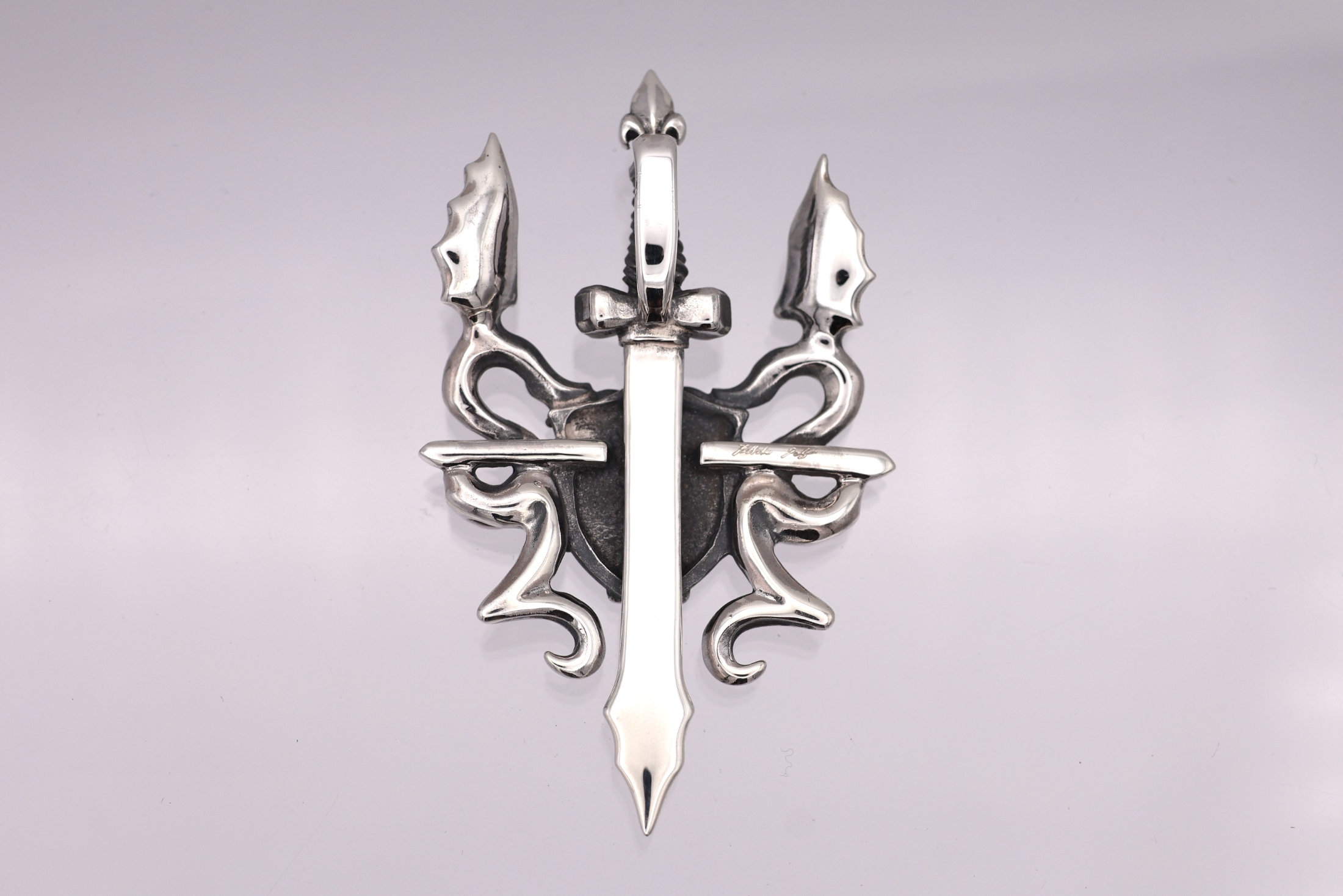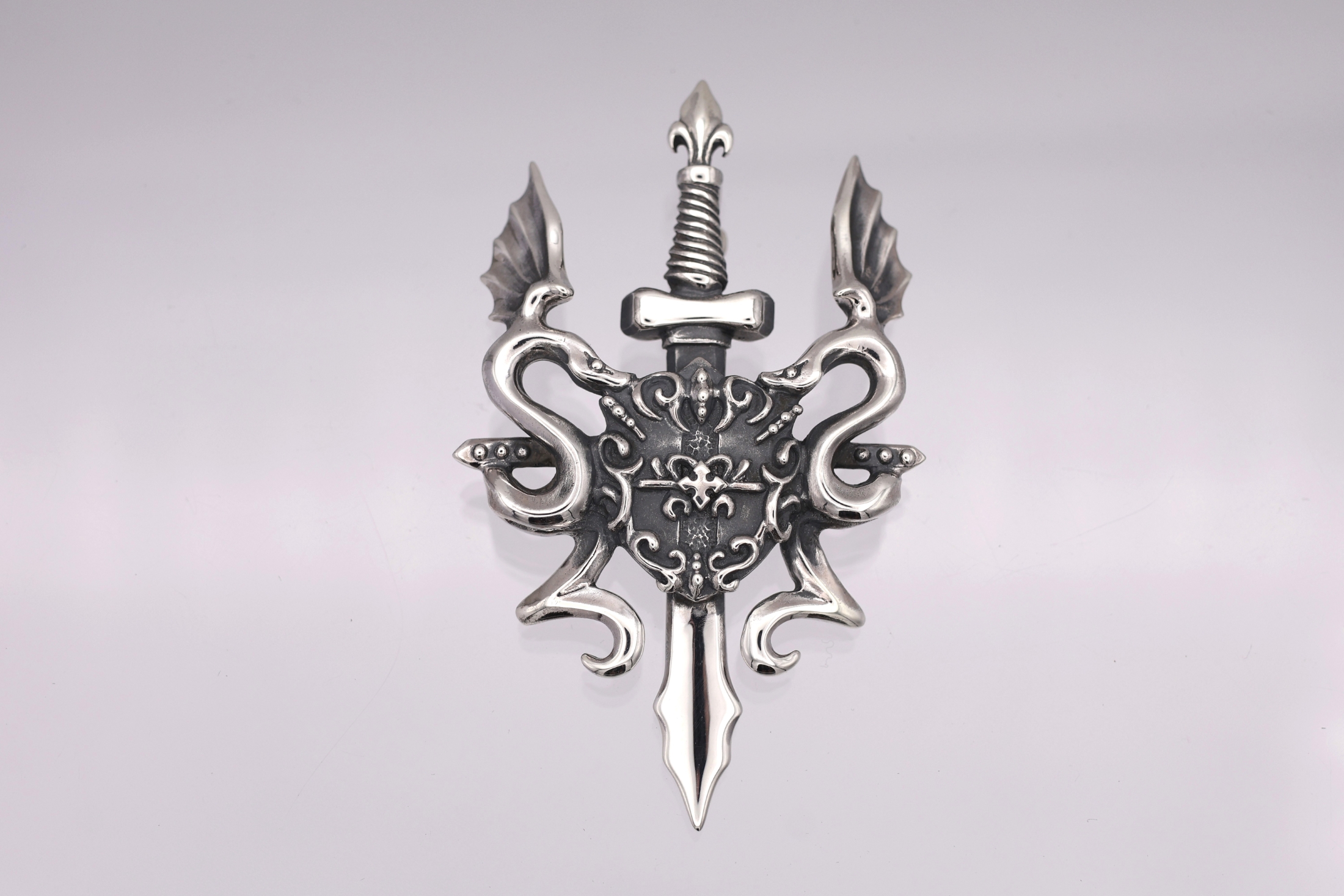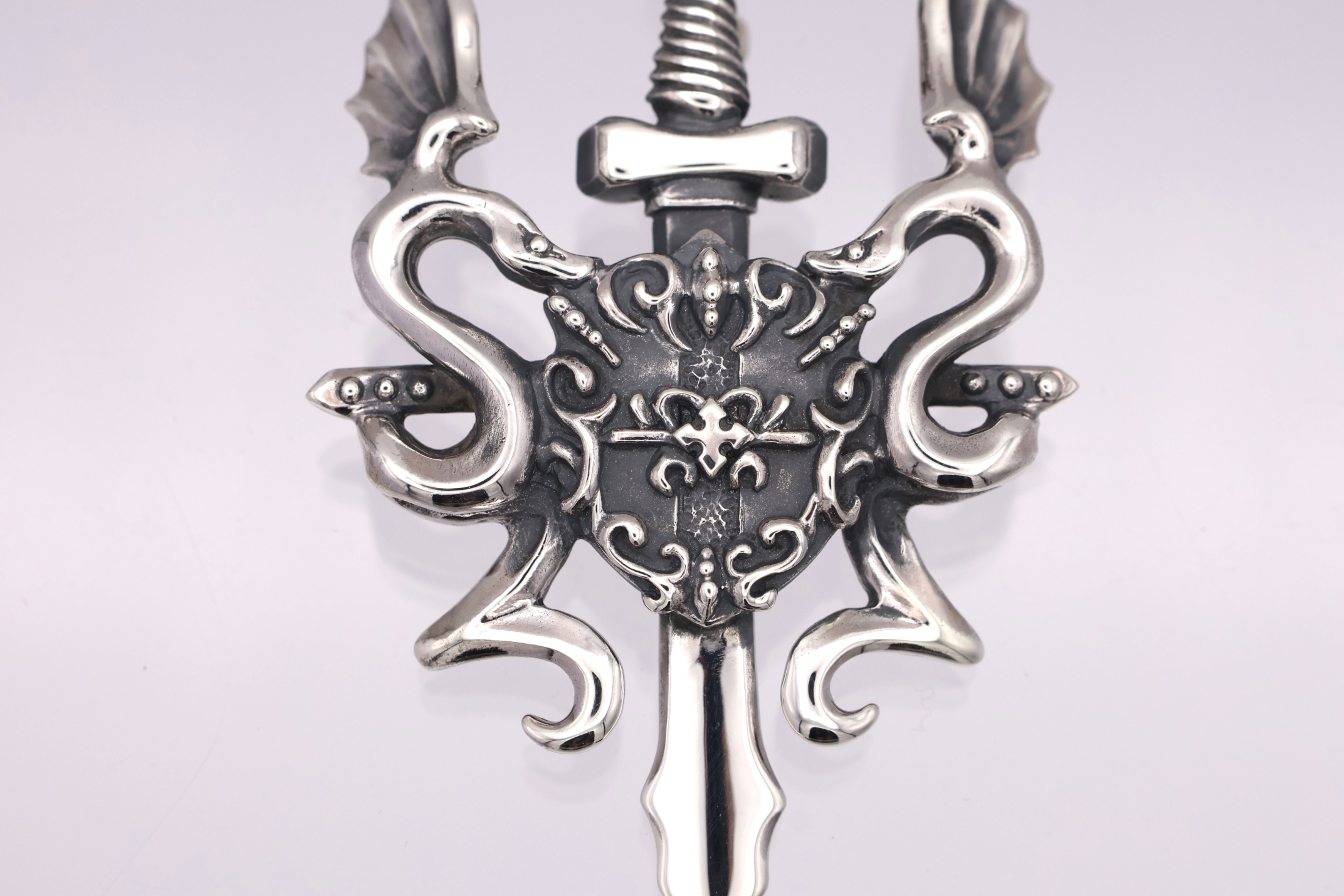 剣と盾を中心に、壁画のようにデザインされた二匹のリビアル(翼をもつ蛇)が