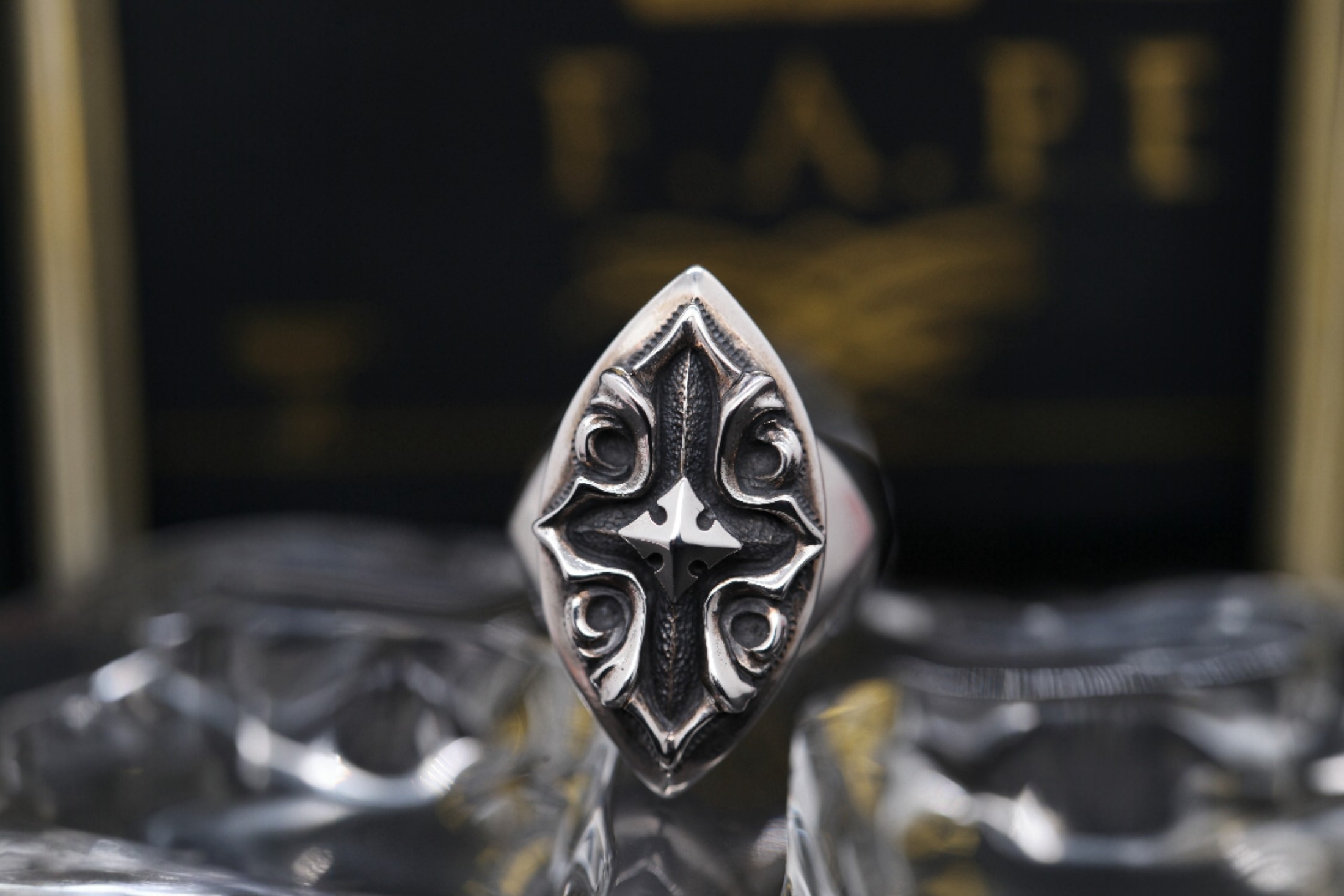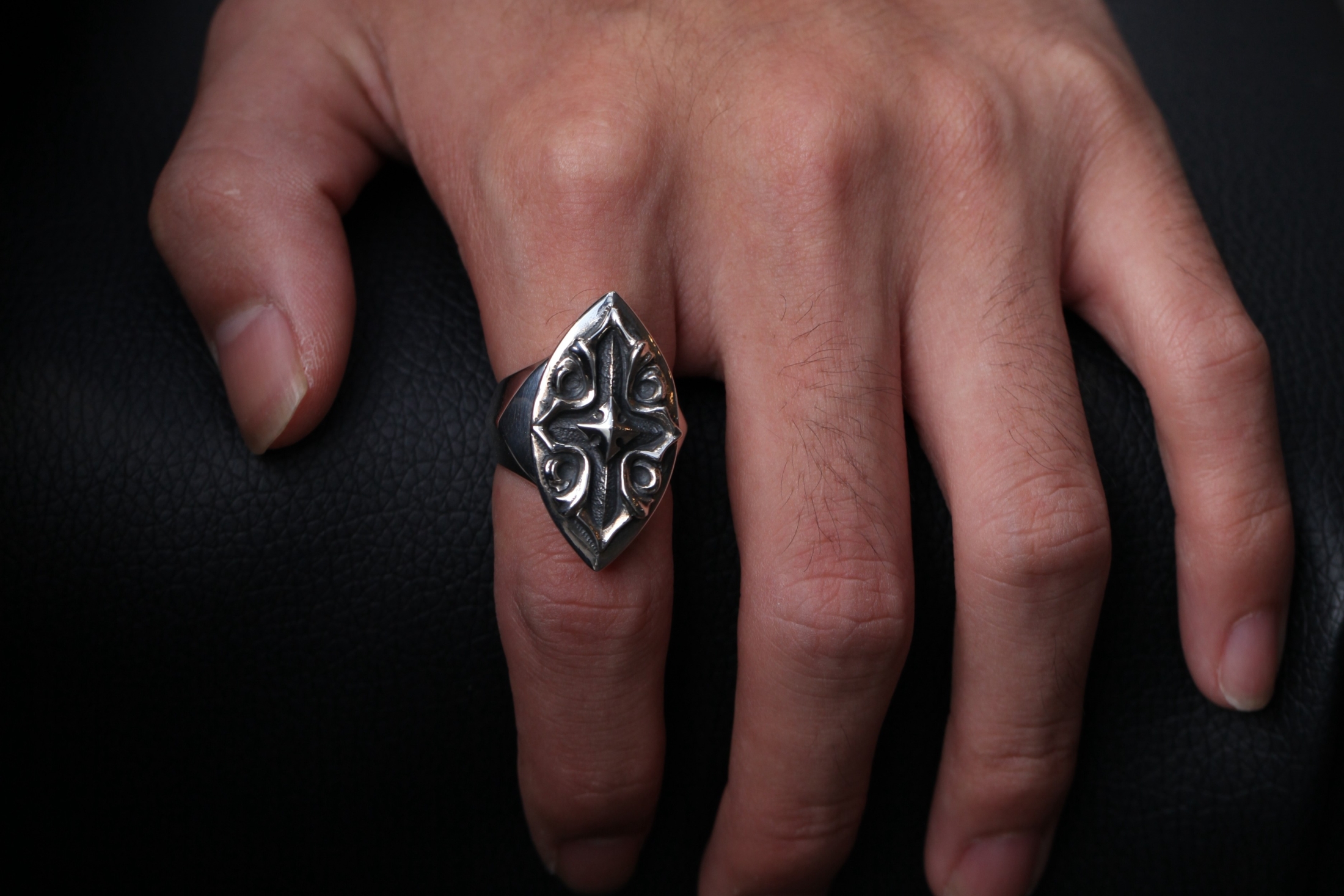 クロスモチーフを配置し、彫り込みと立体ラインを重ねることで奥行きのある表
