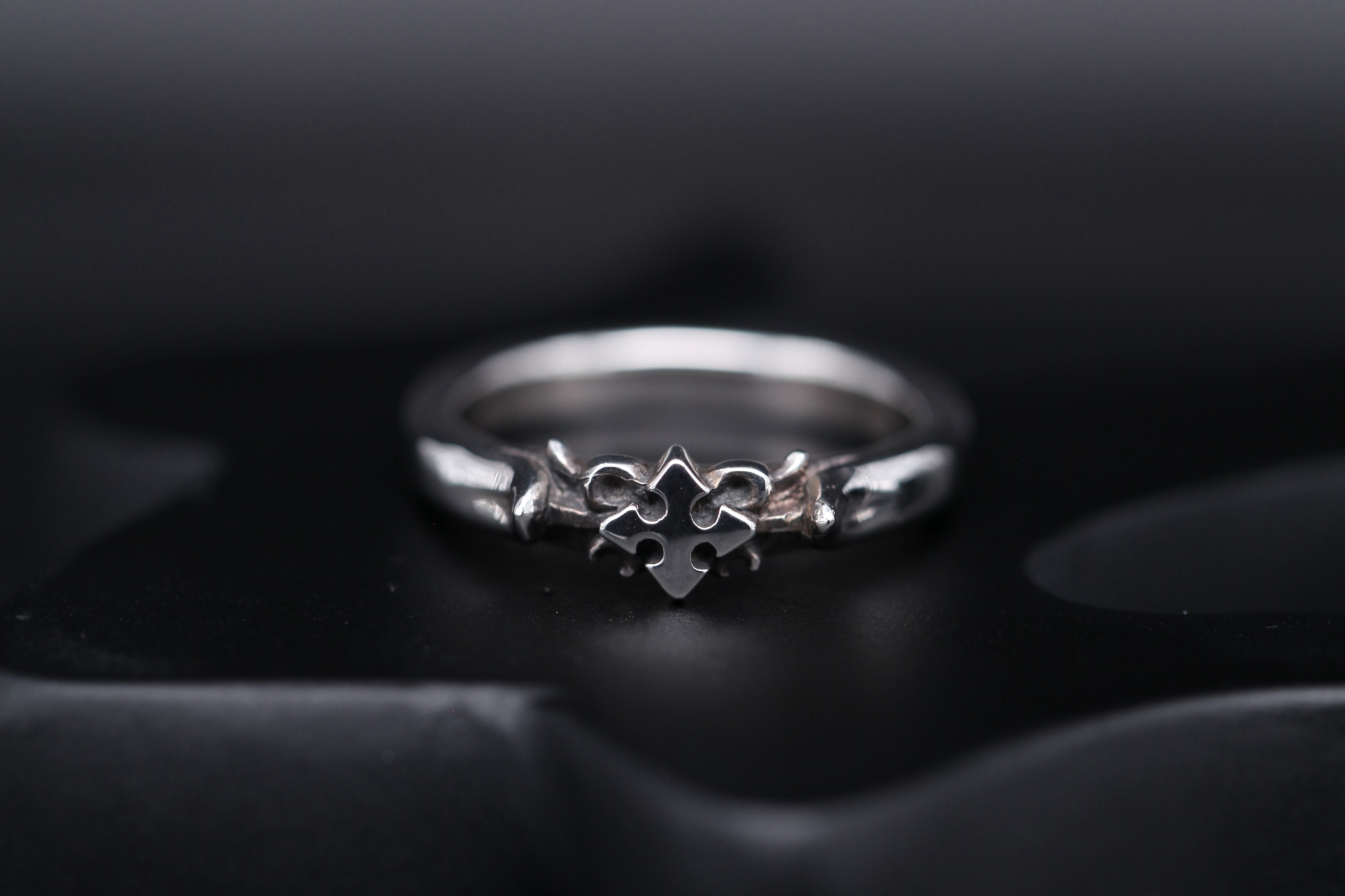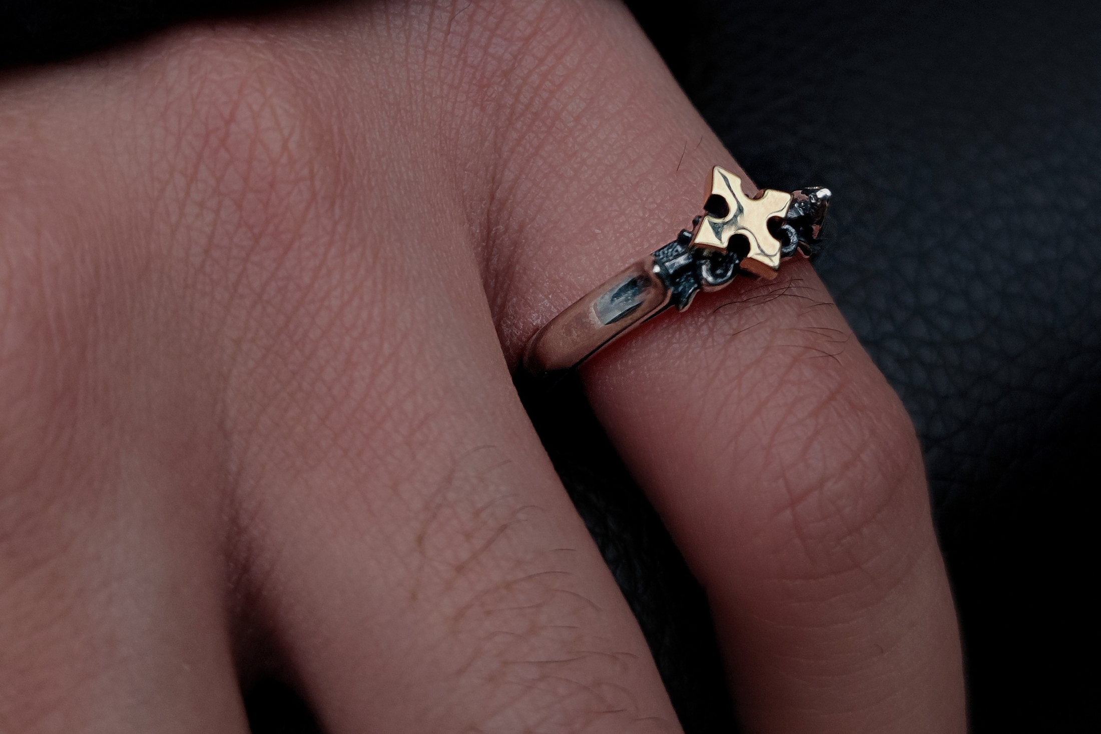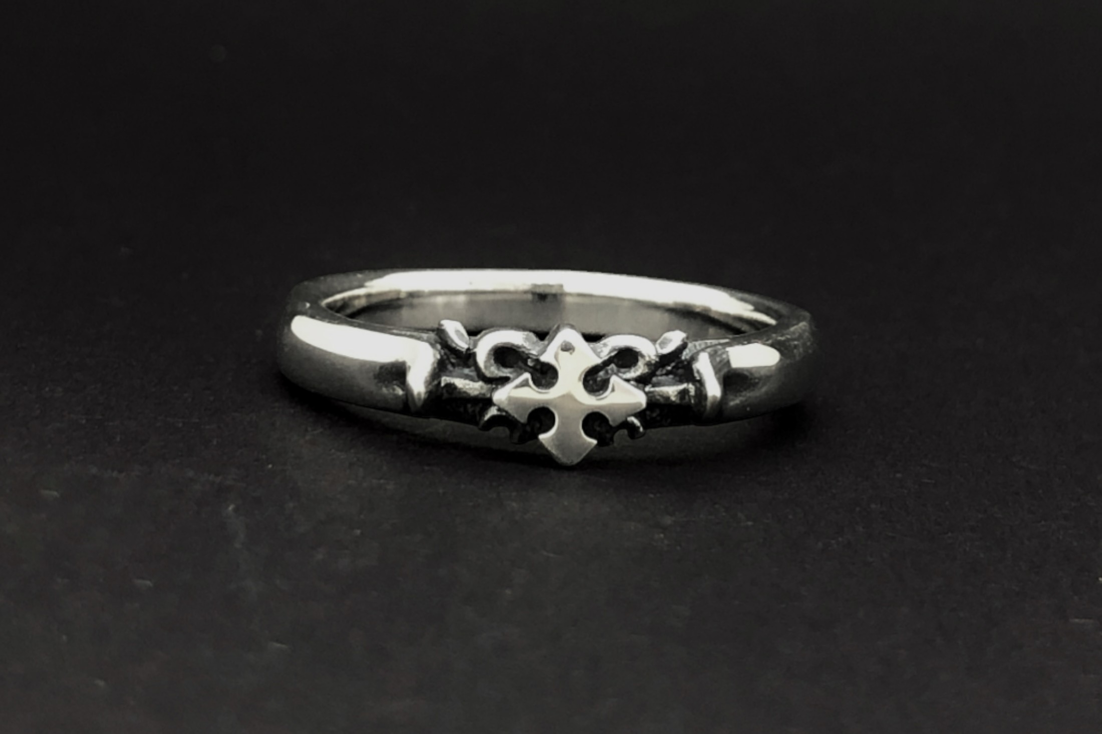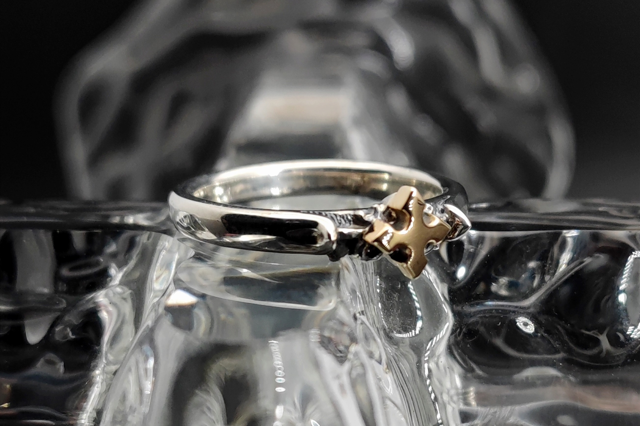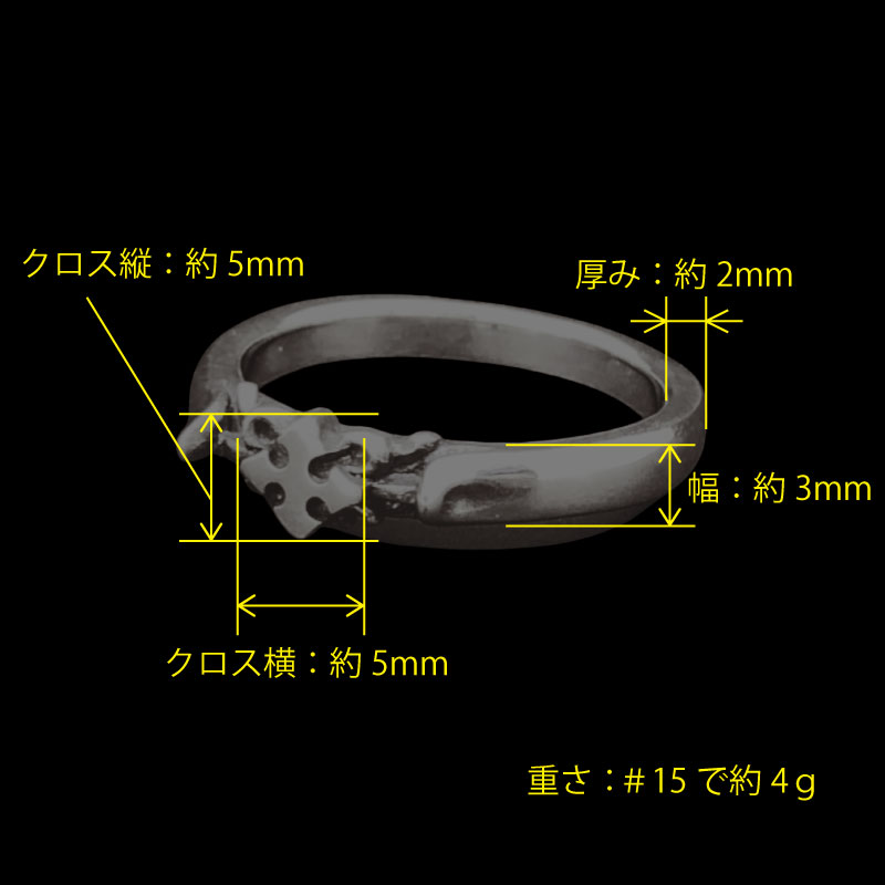 細身のリングに、クロスモチーフと細かな装飾を施したデザイン。中央のクロス