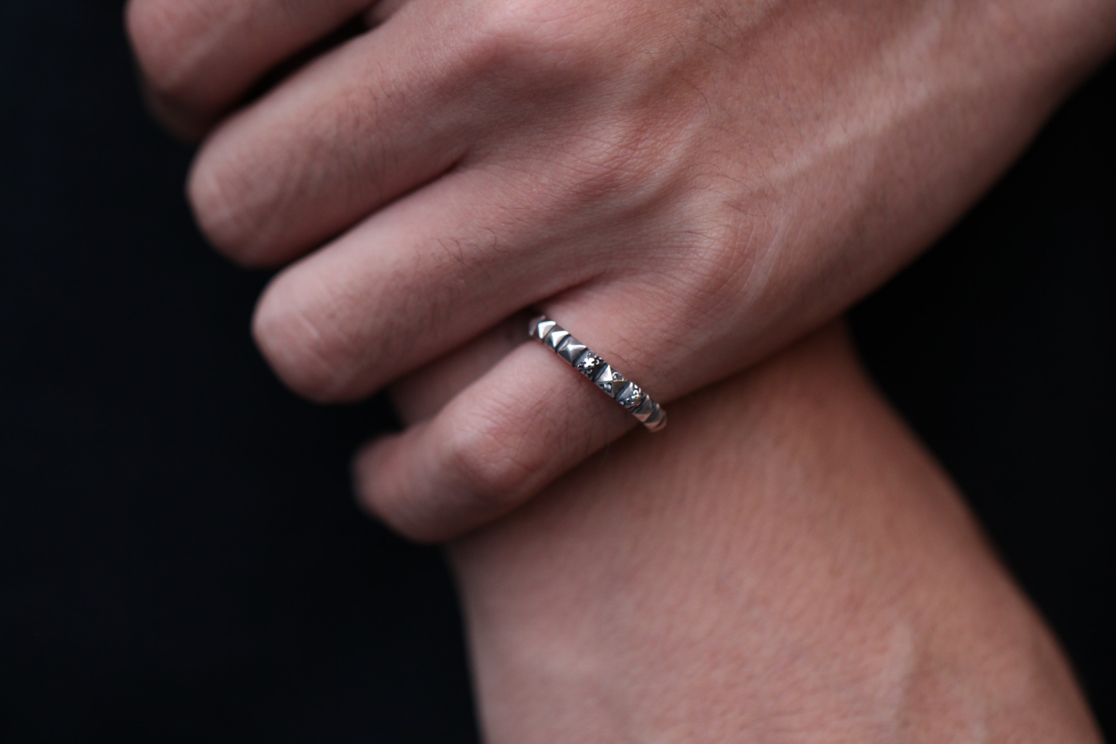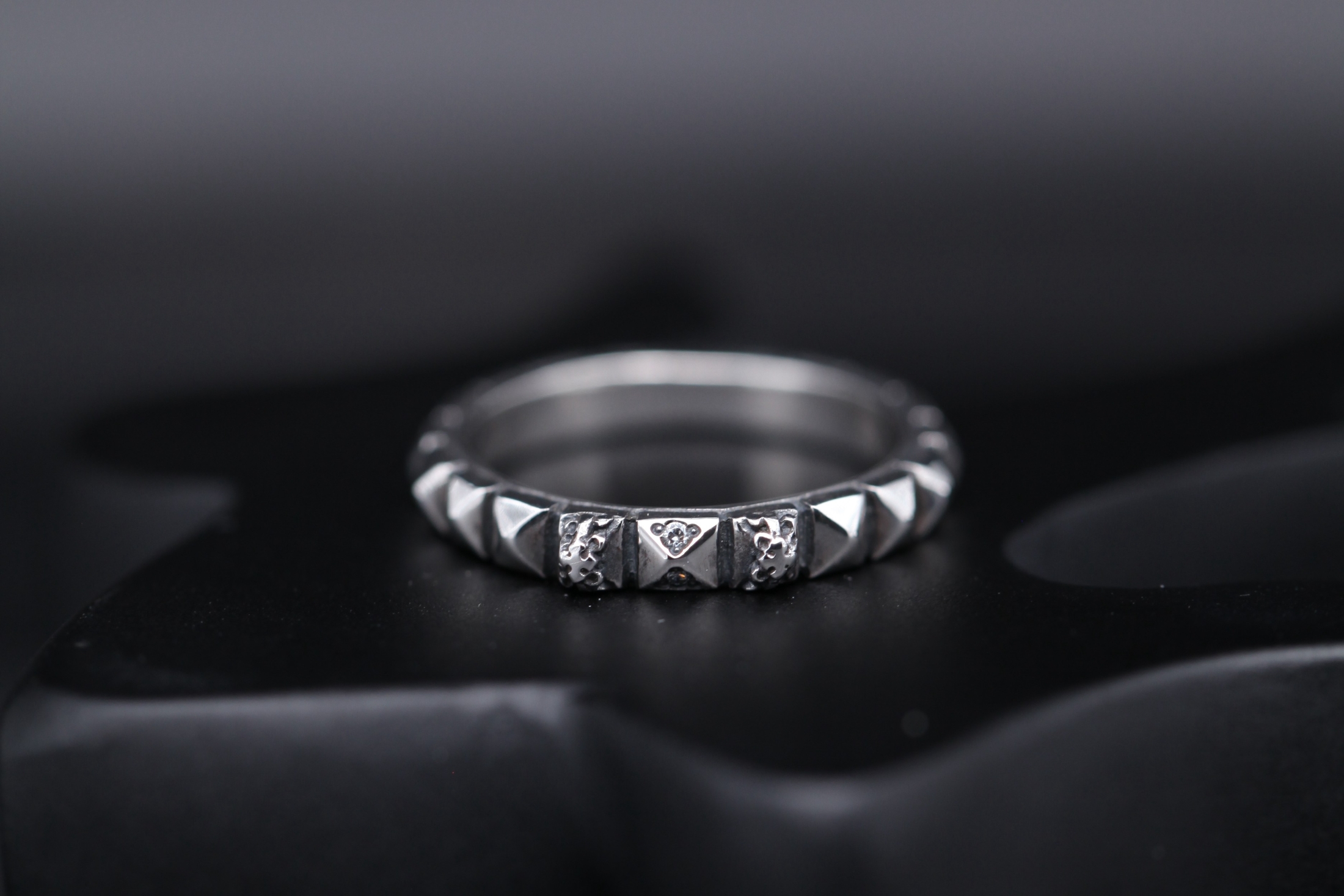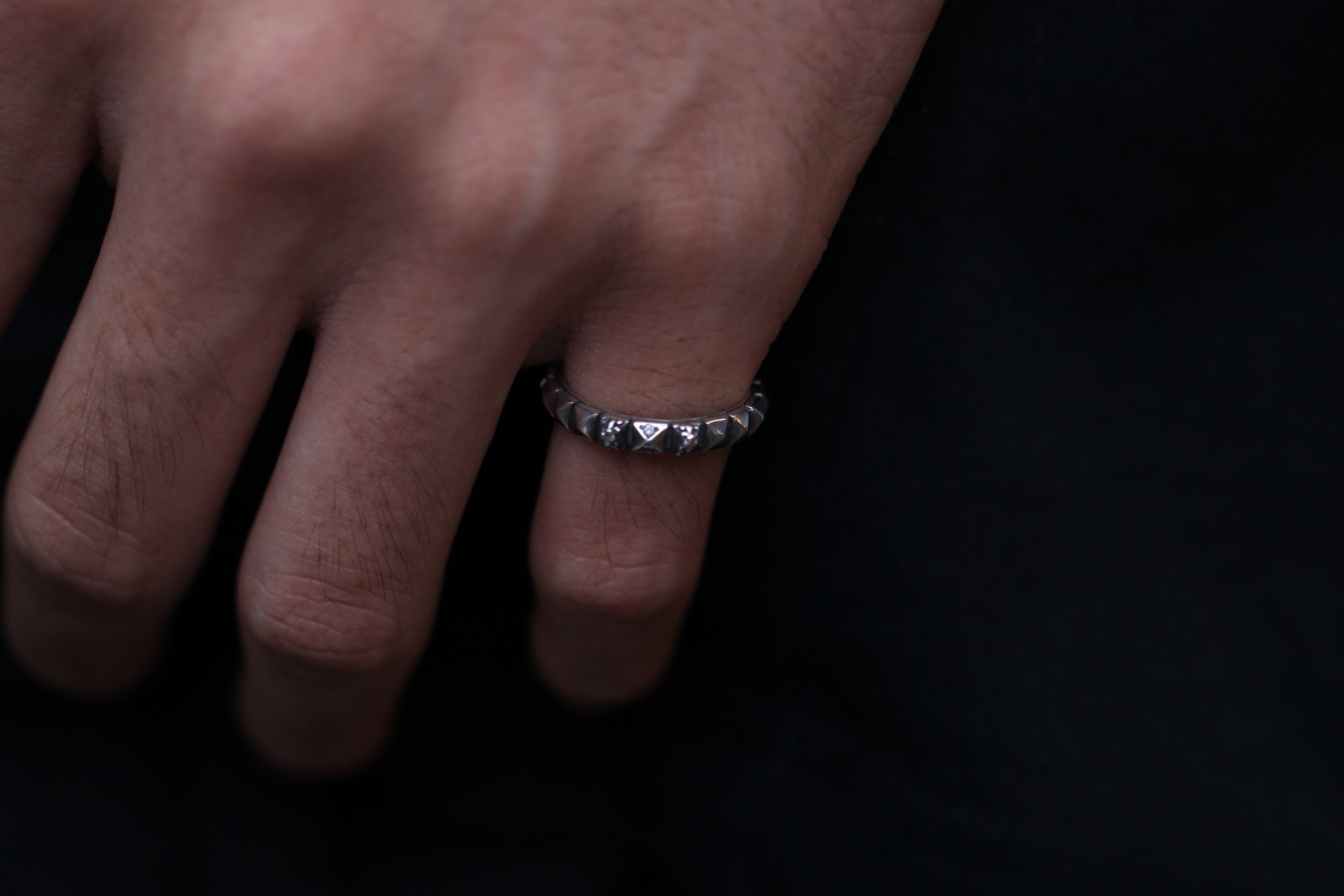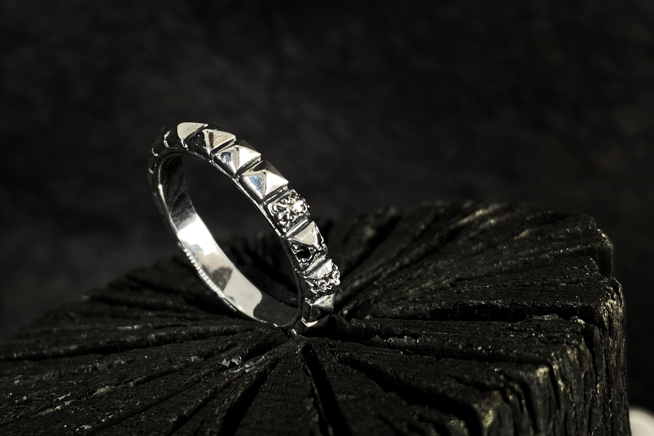 造形されたリング。中央のピラミッドには上下2面にストーンをセッティングして