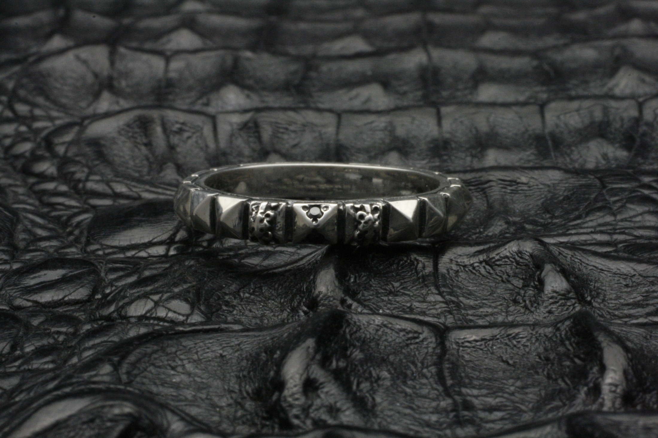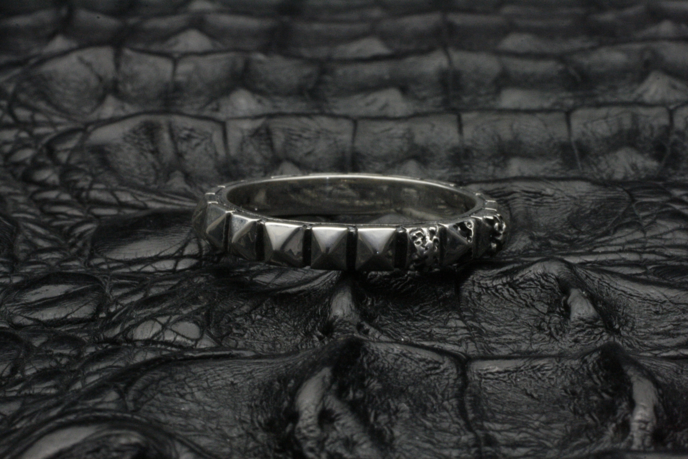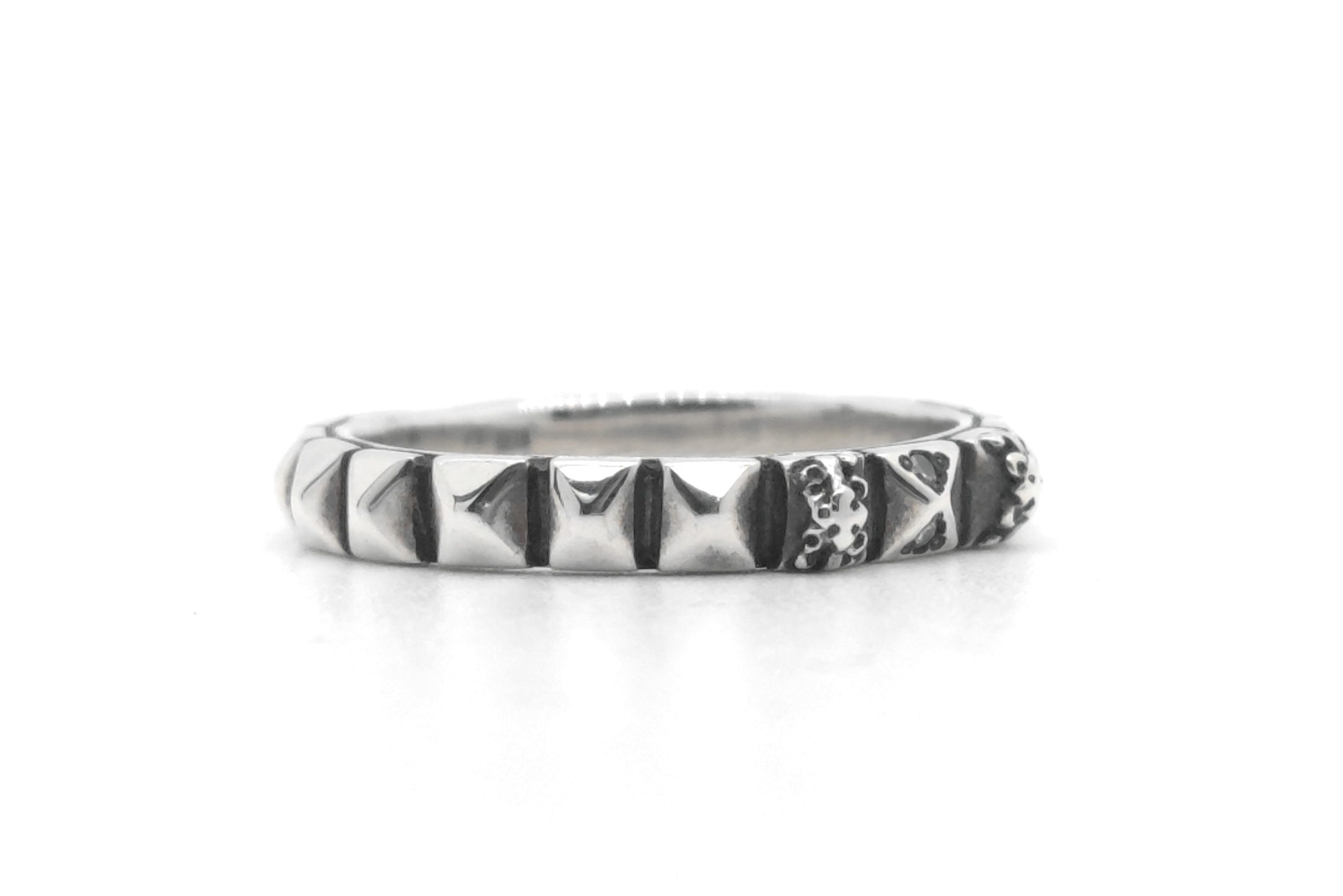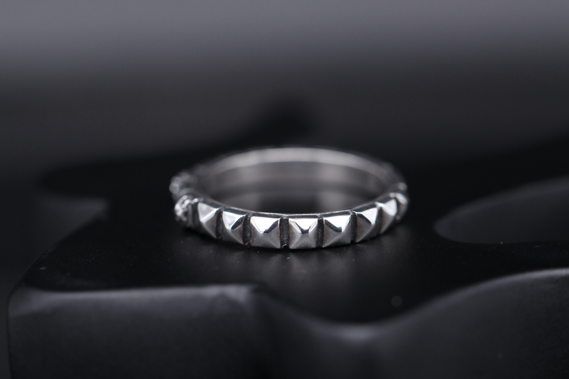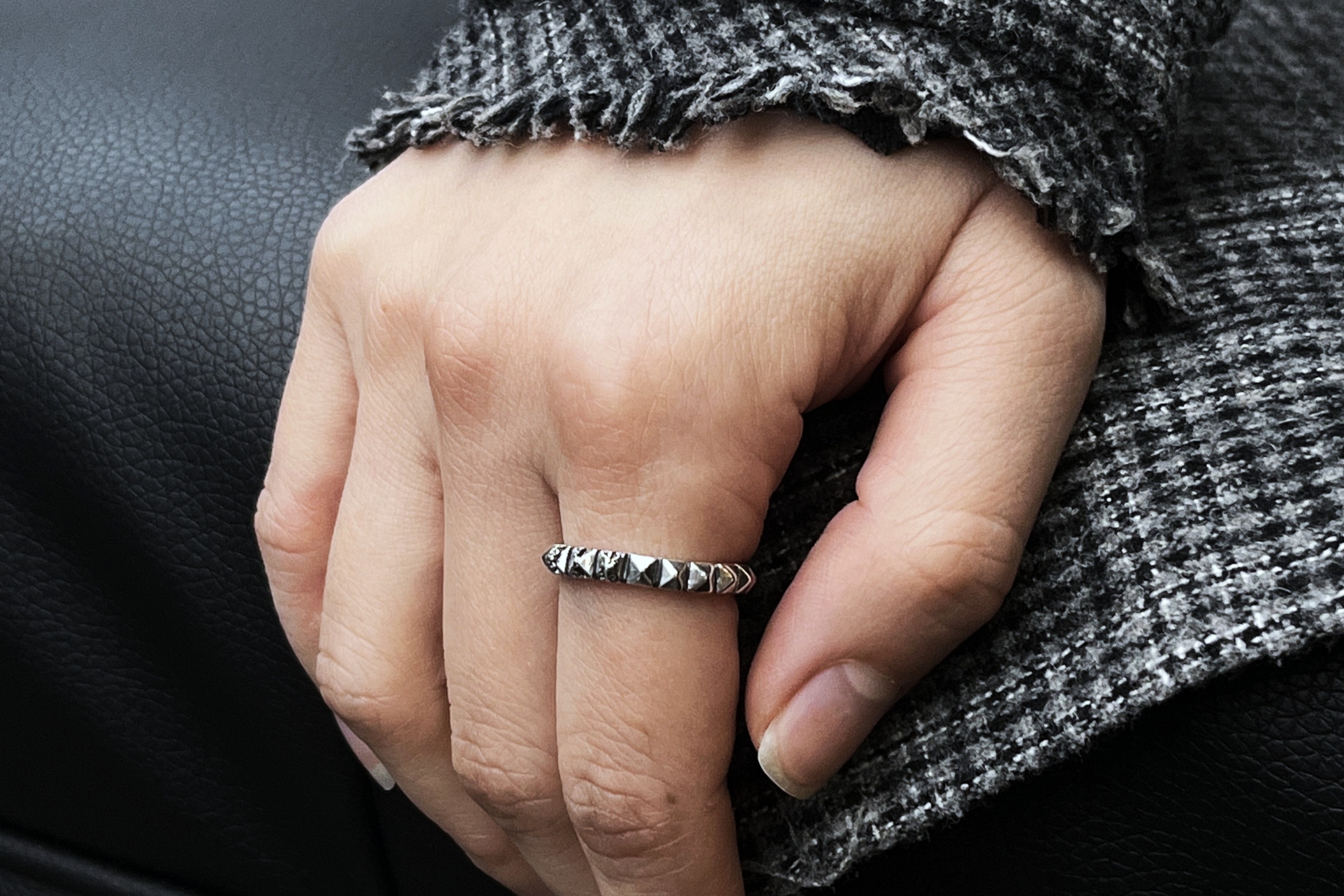 造形されたリング。中央のピラミッドには上下2面にストーンをセッティングして