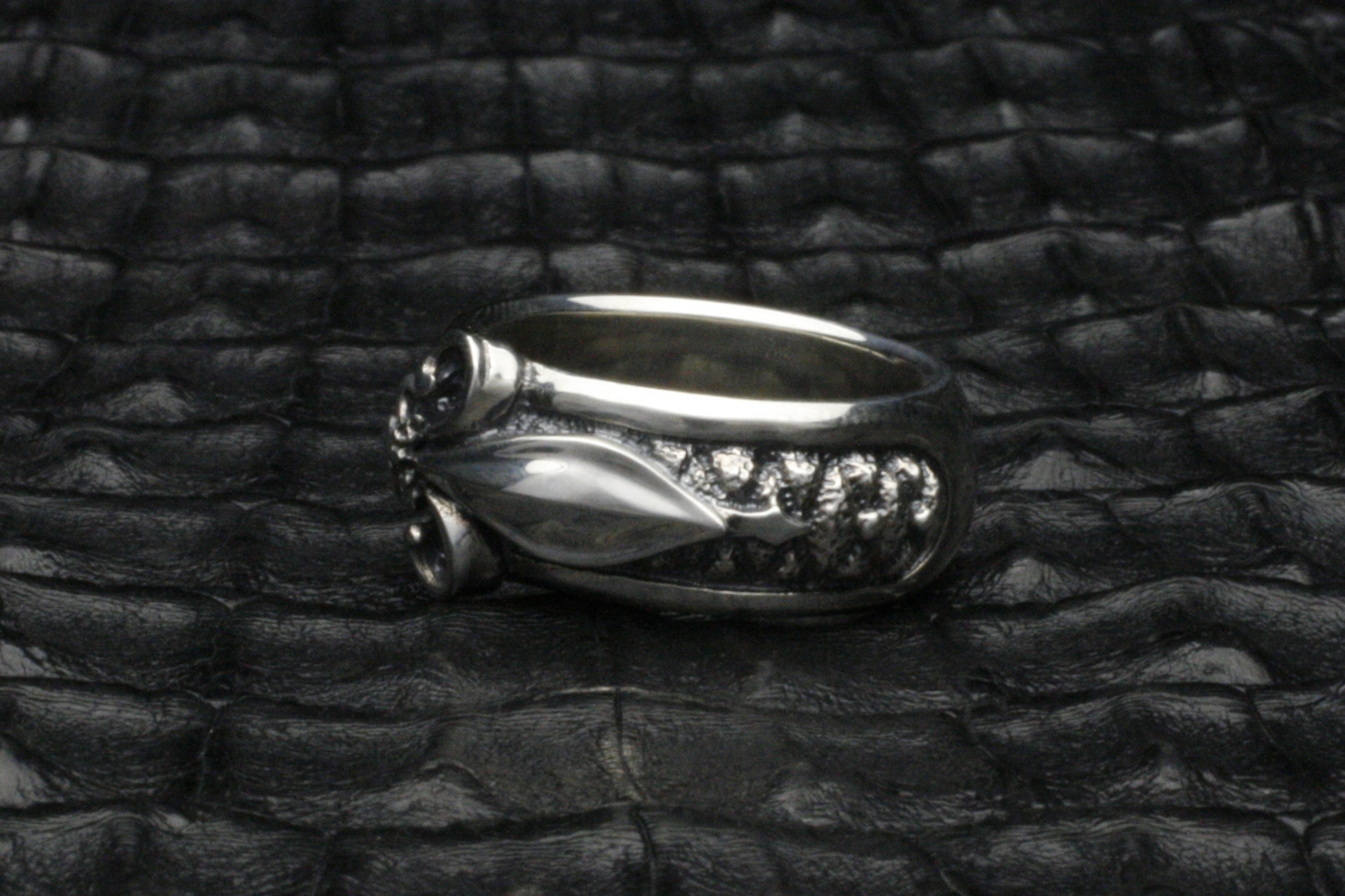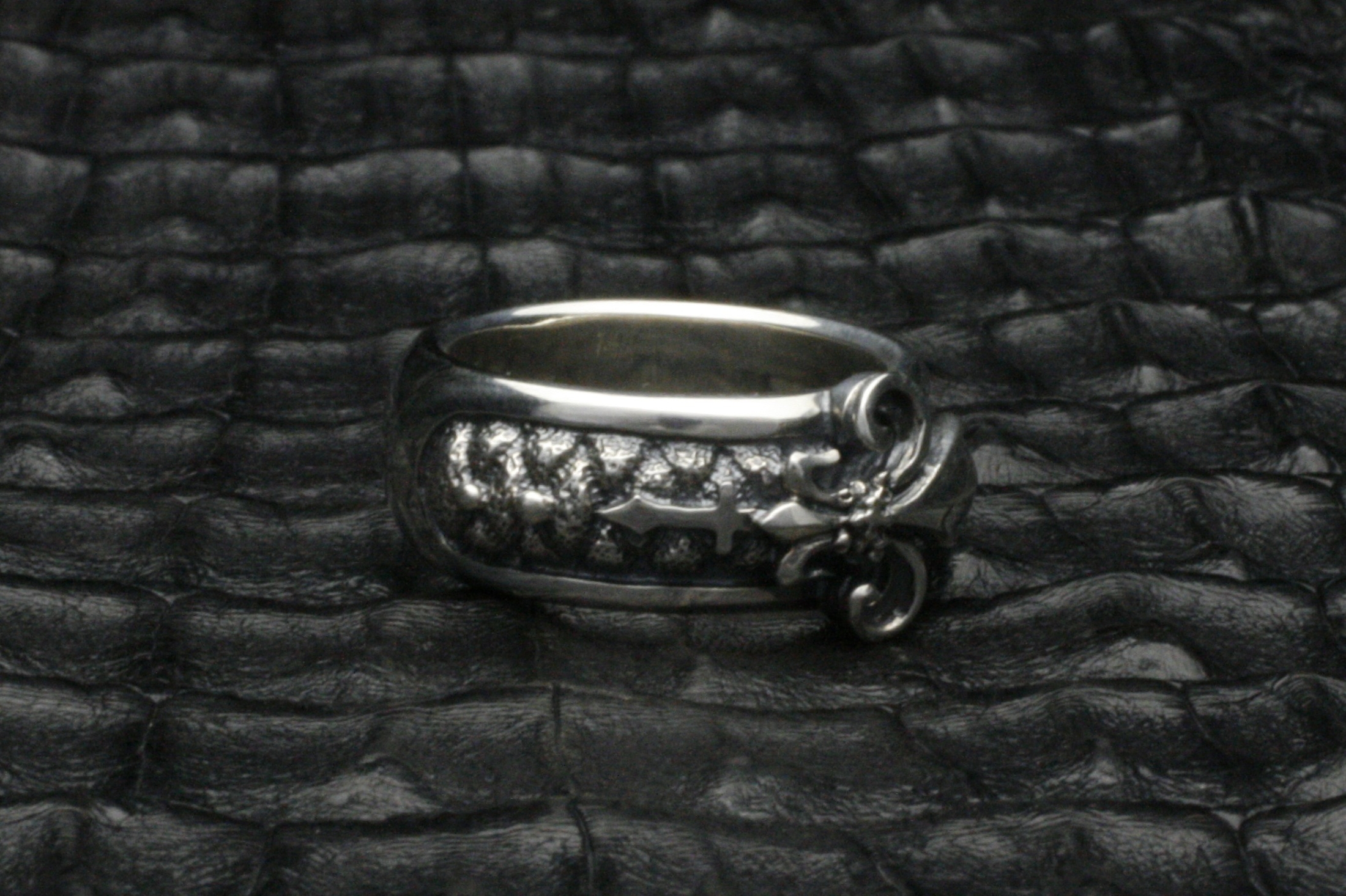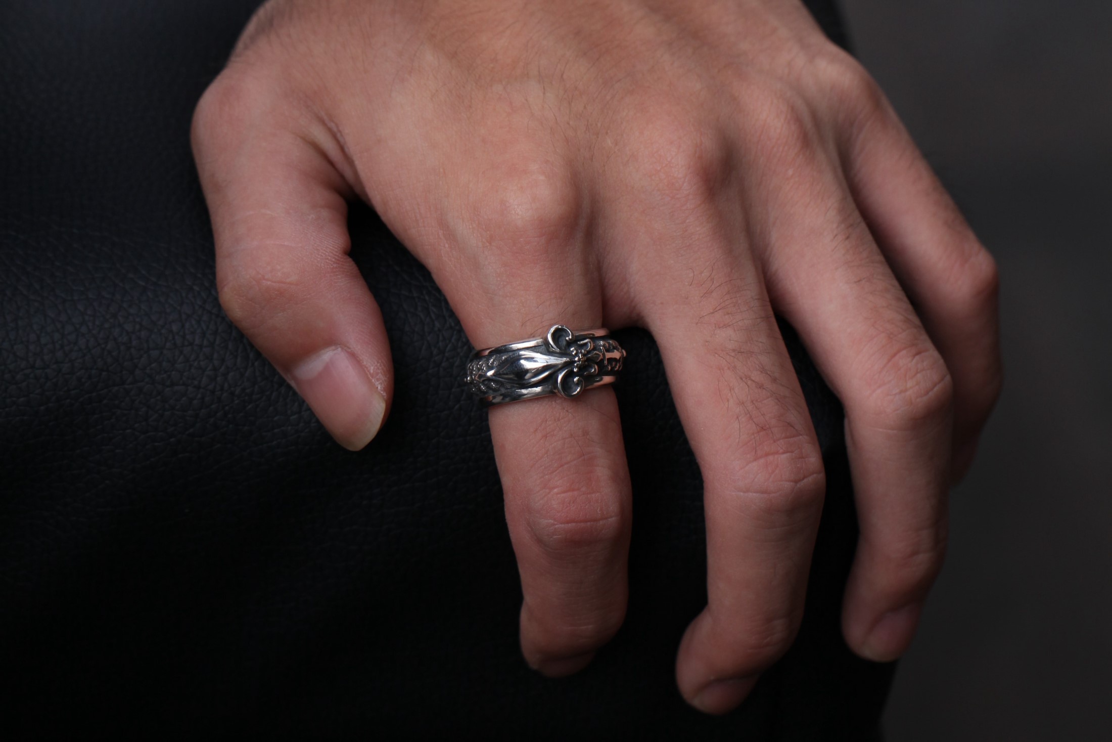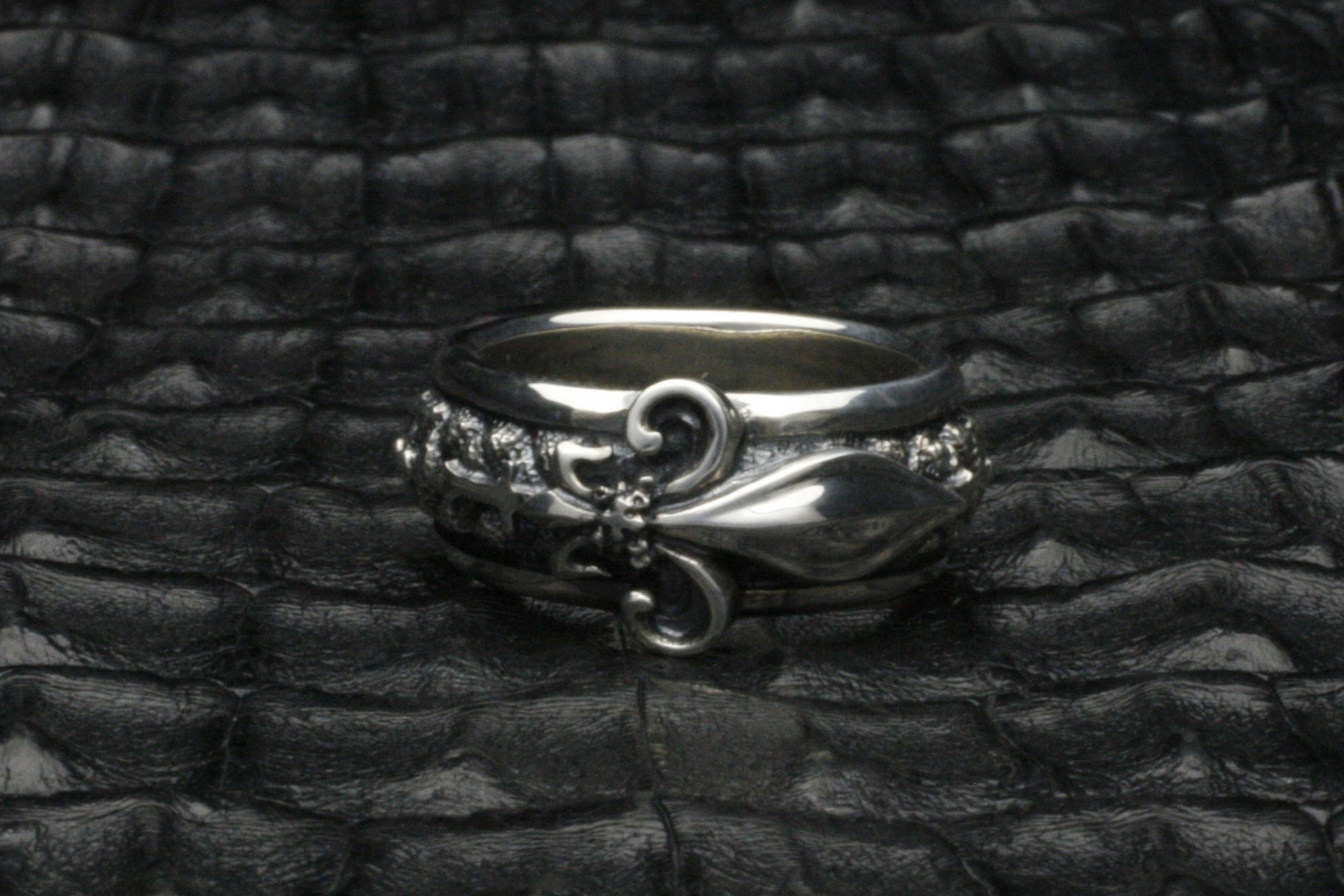 ユリのモチーフをリングに立体的に造形したデザイン。ユリの紋章の中央の花