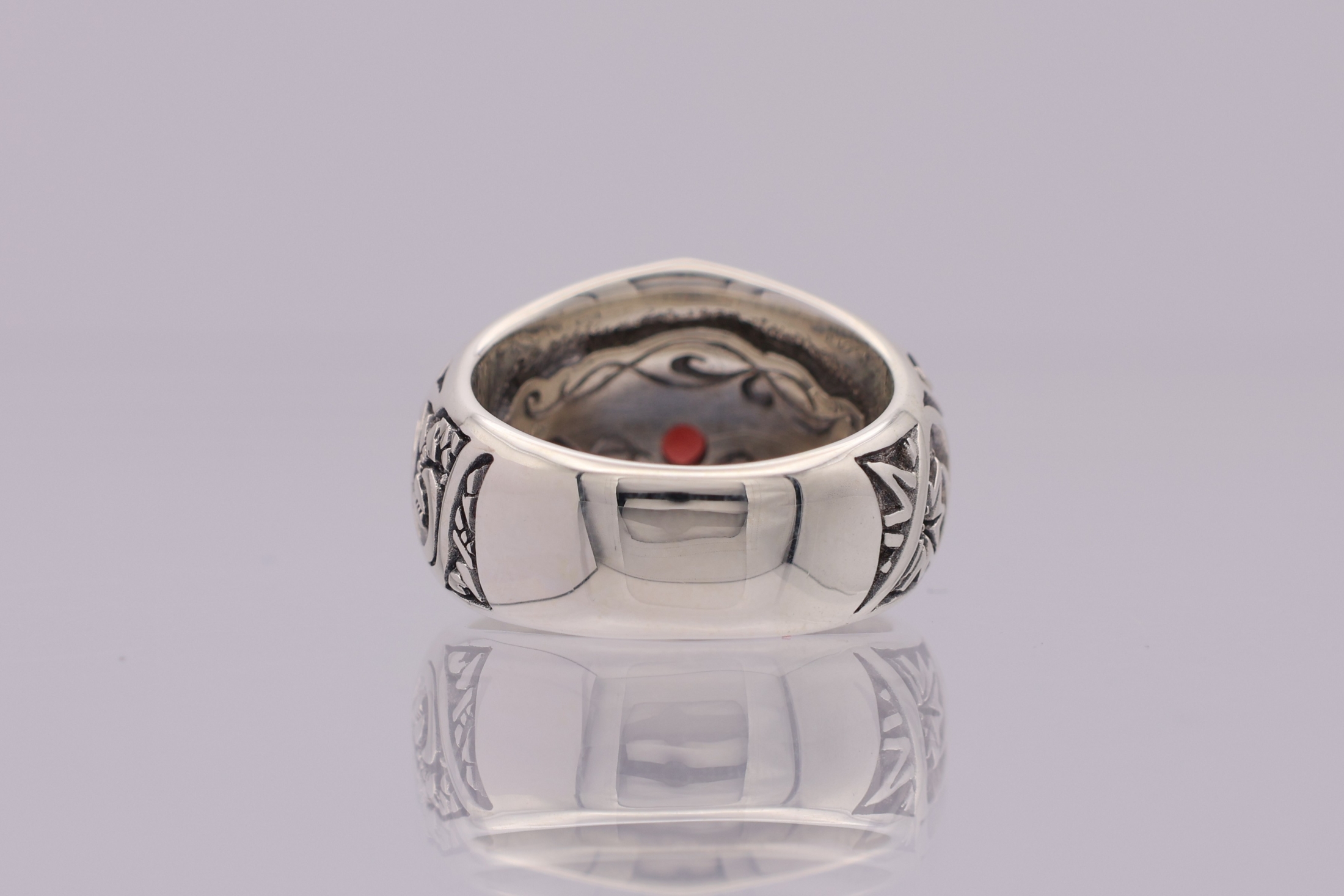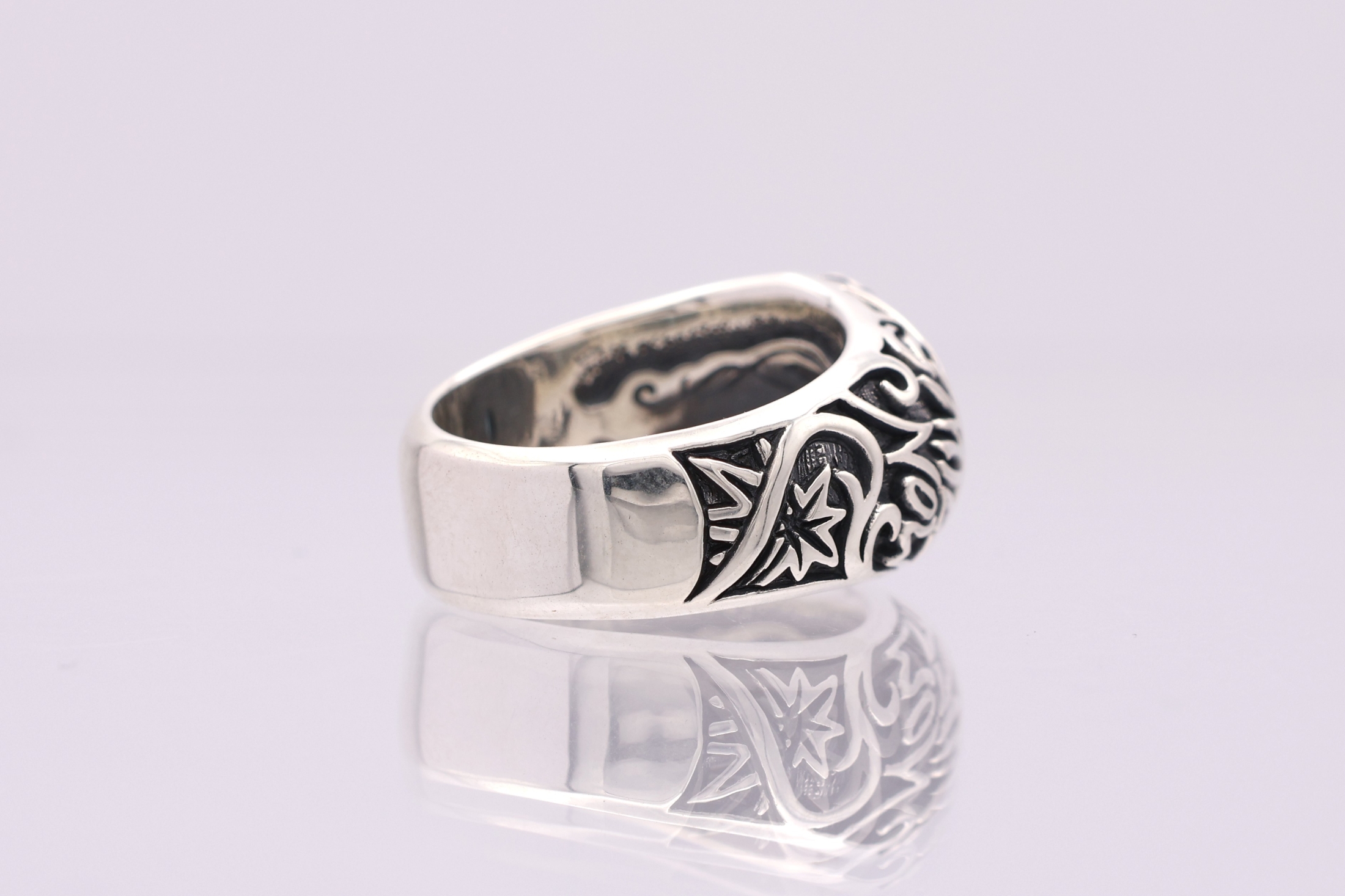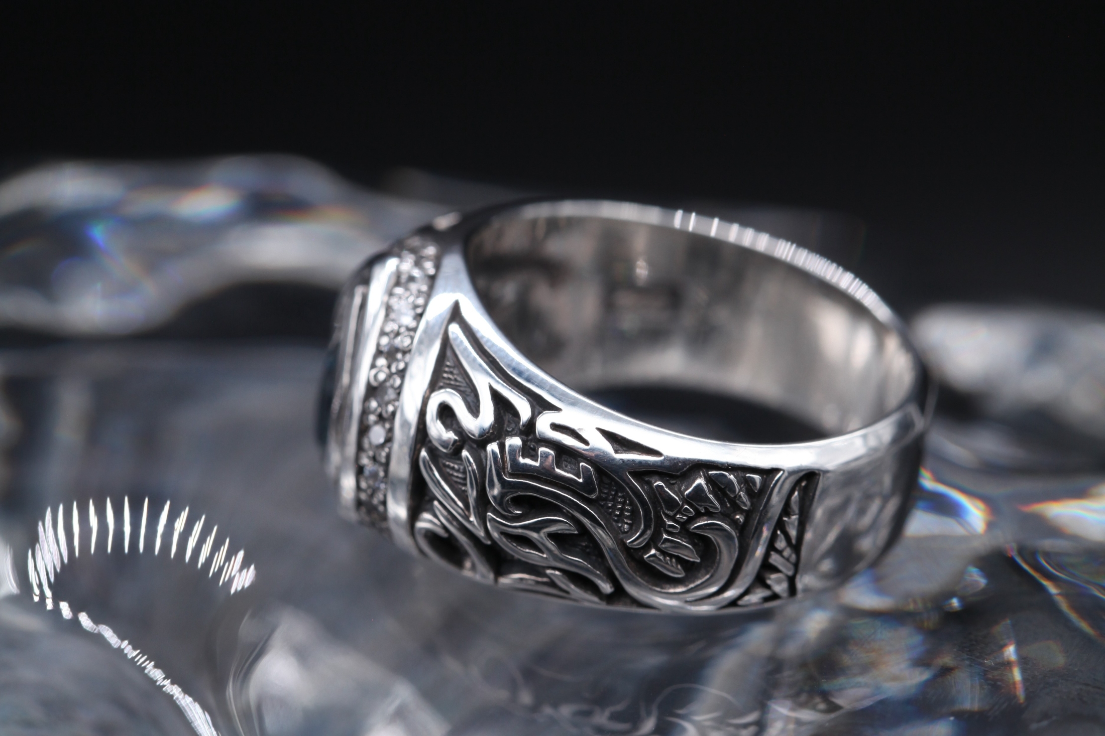 している。リングの正面内側は緩やかに裏抜きし、内側の面にもデザインを彫