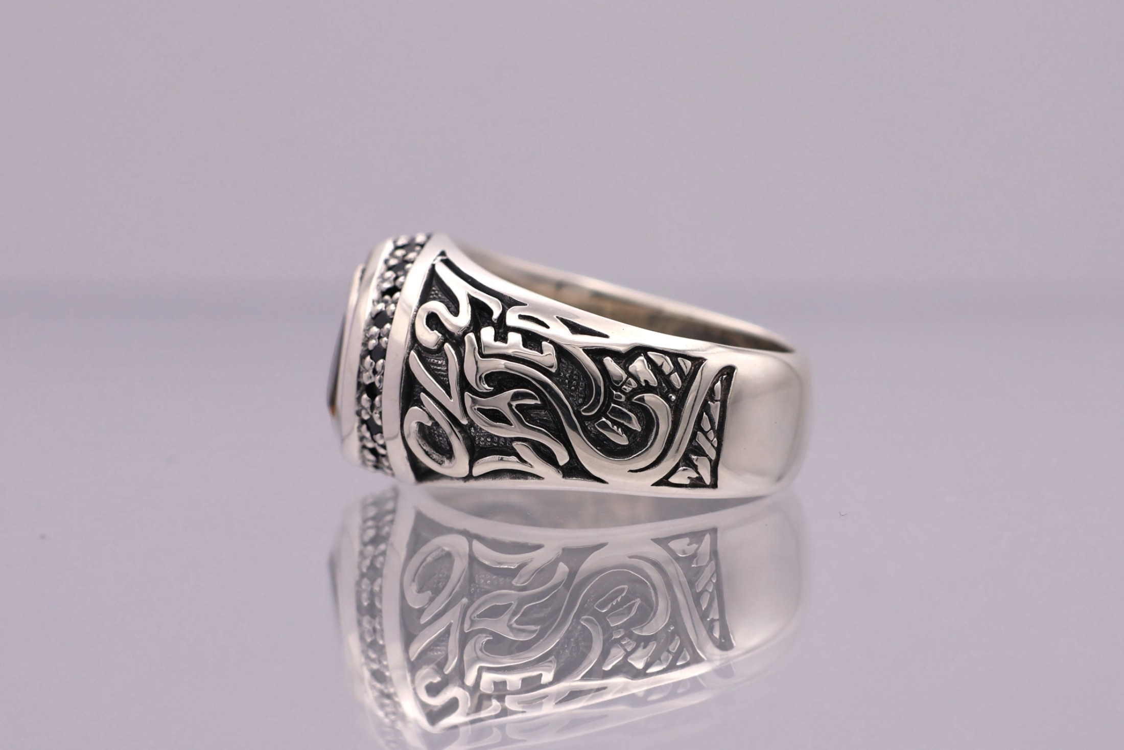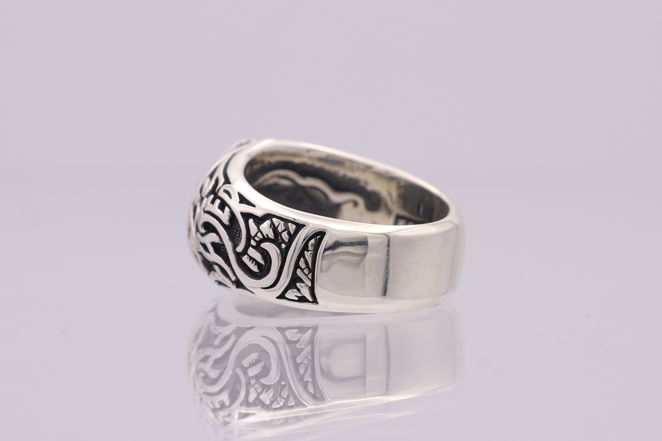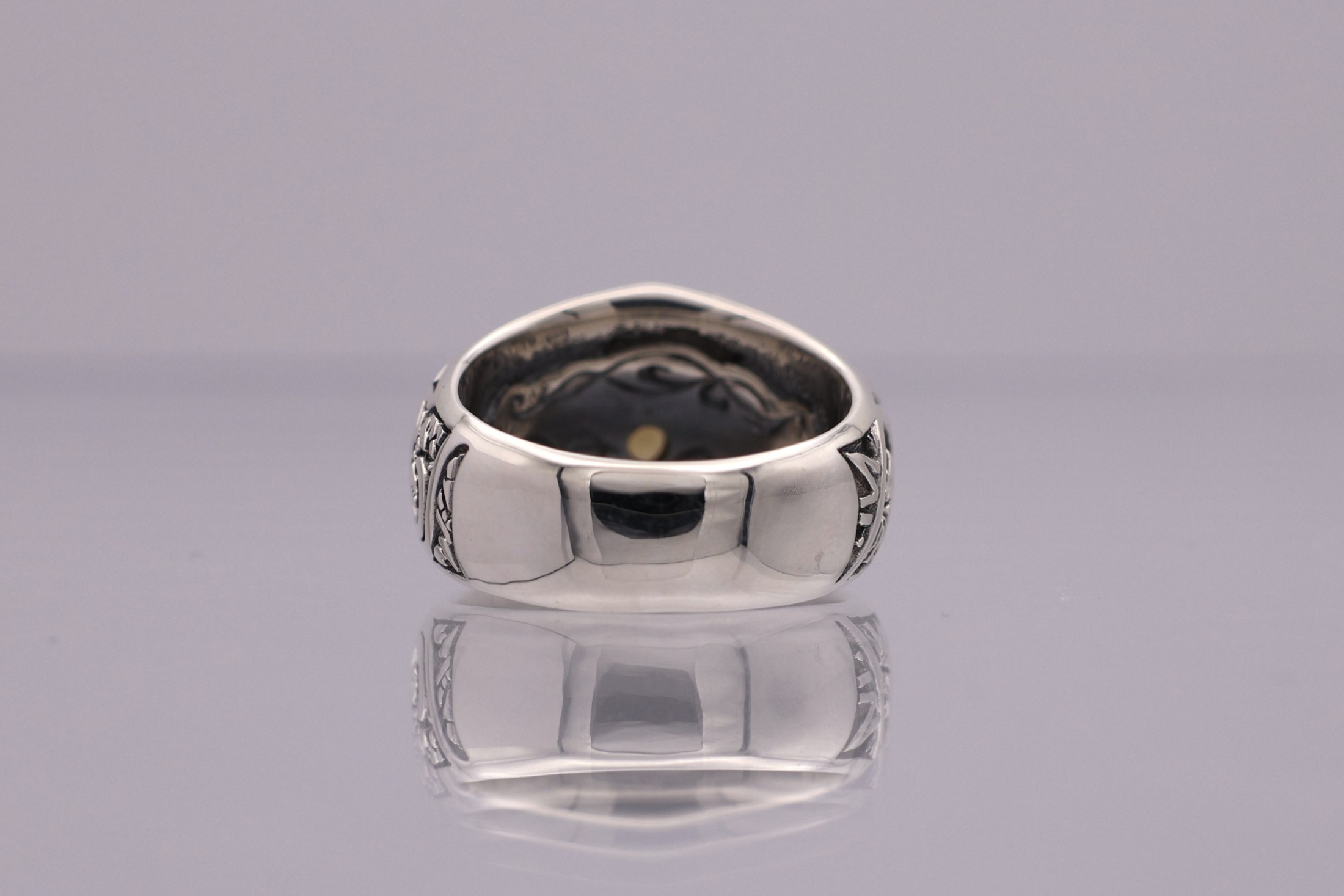 している。リングの正面内側は緩やかに裏抜きし、内側の面にもデザインを彫