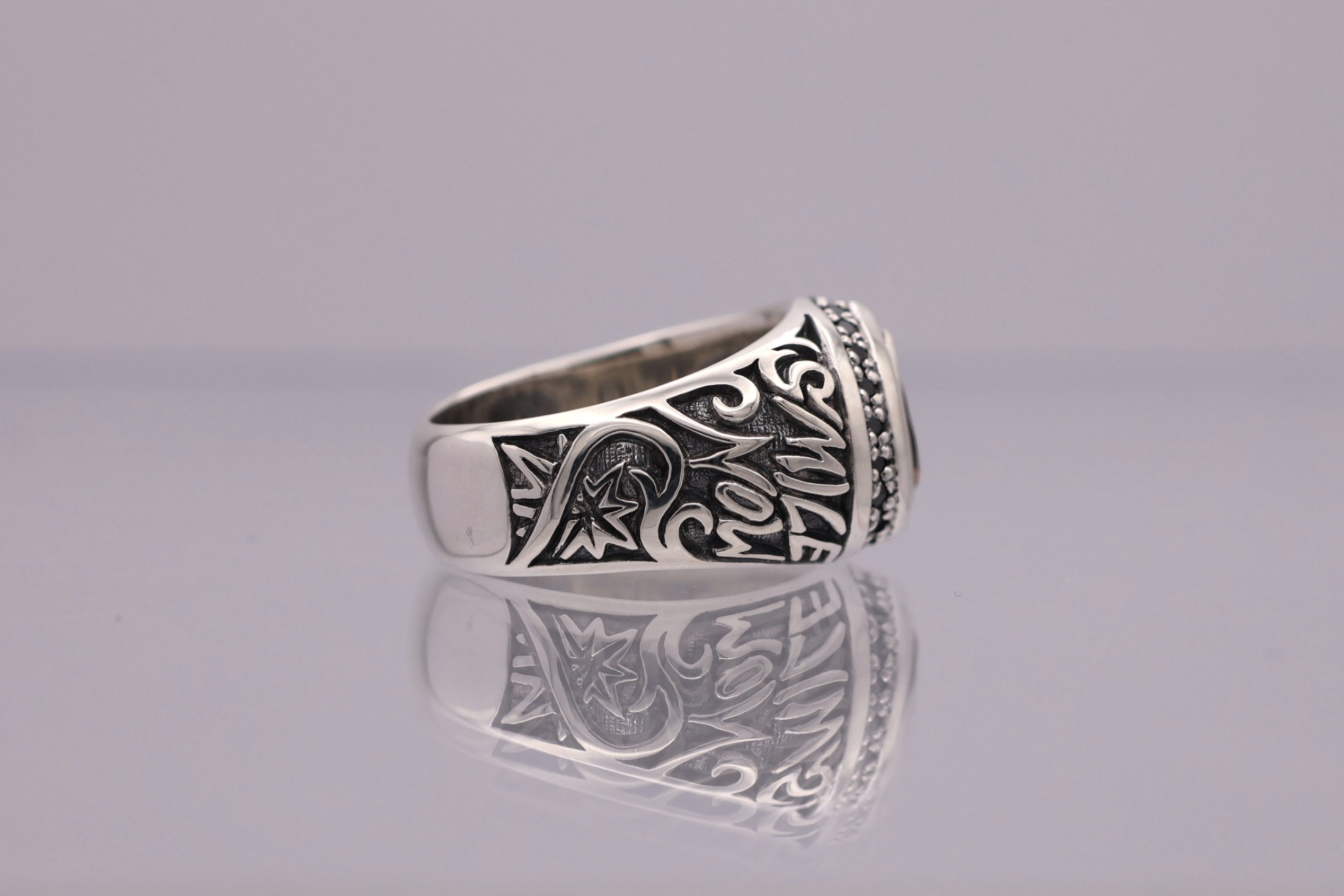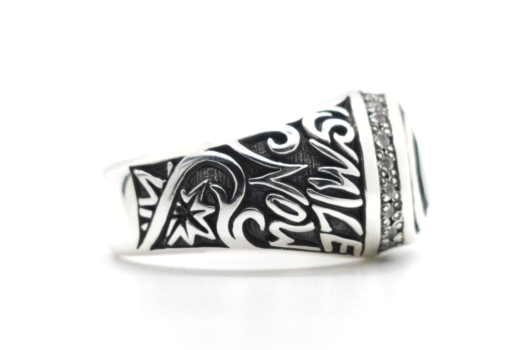 正面に向かって左側に”SMILE NOW、向かって右側に”CLY LATER“のワード