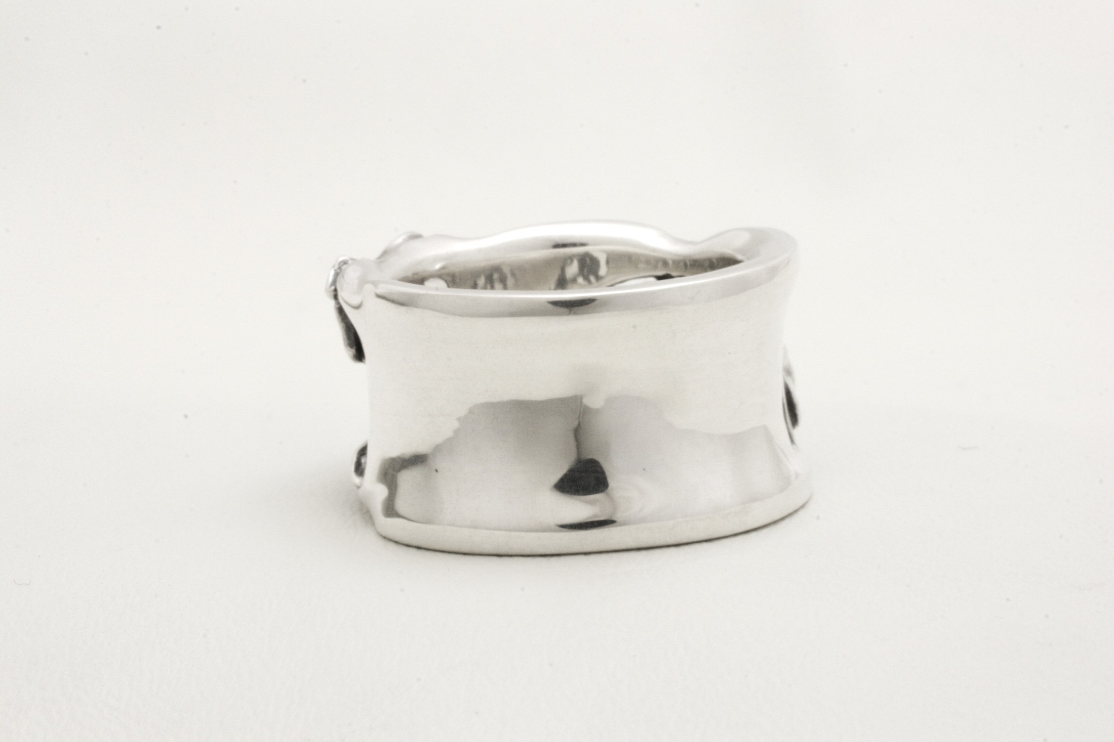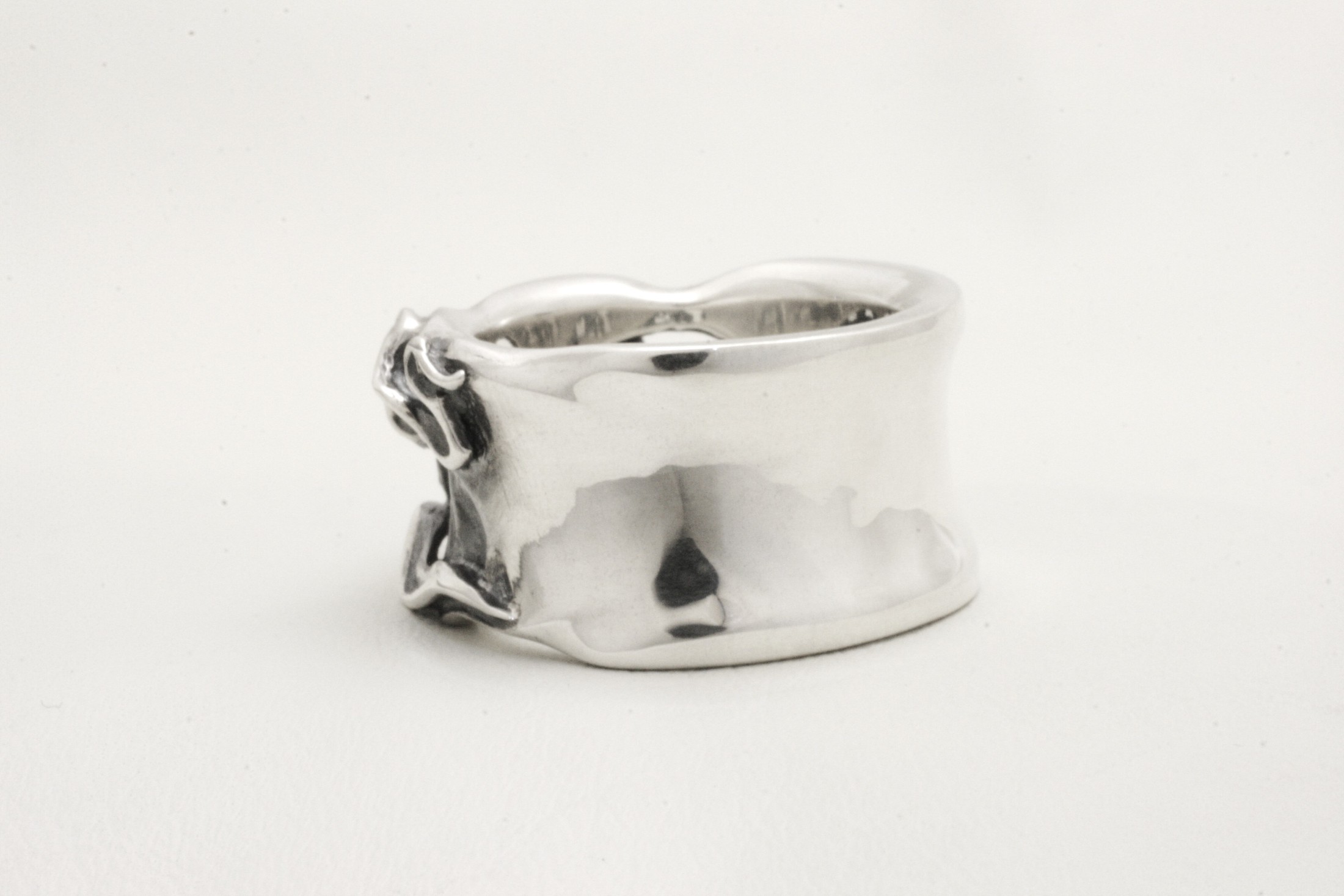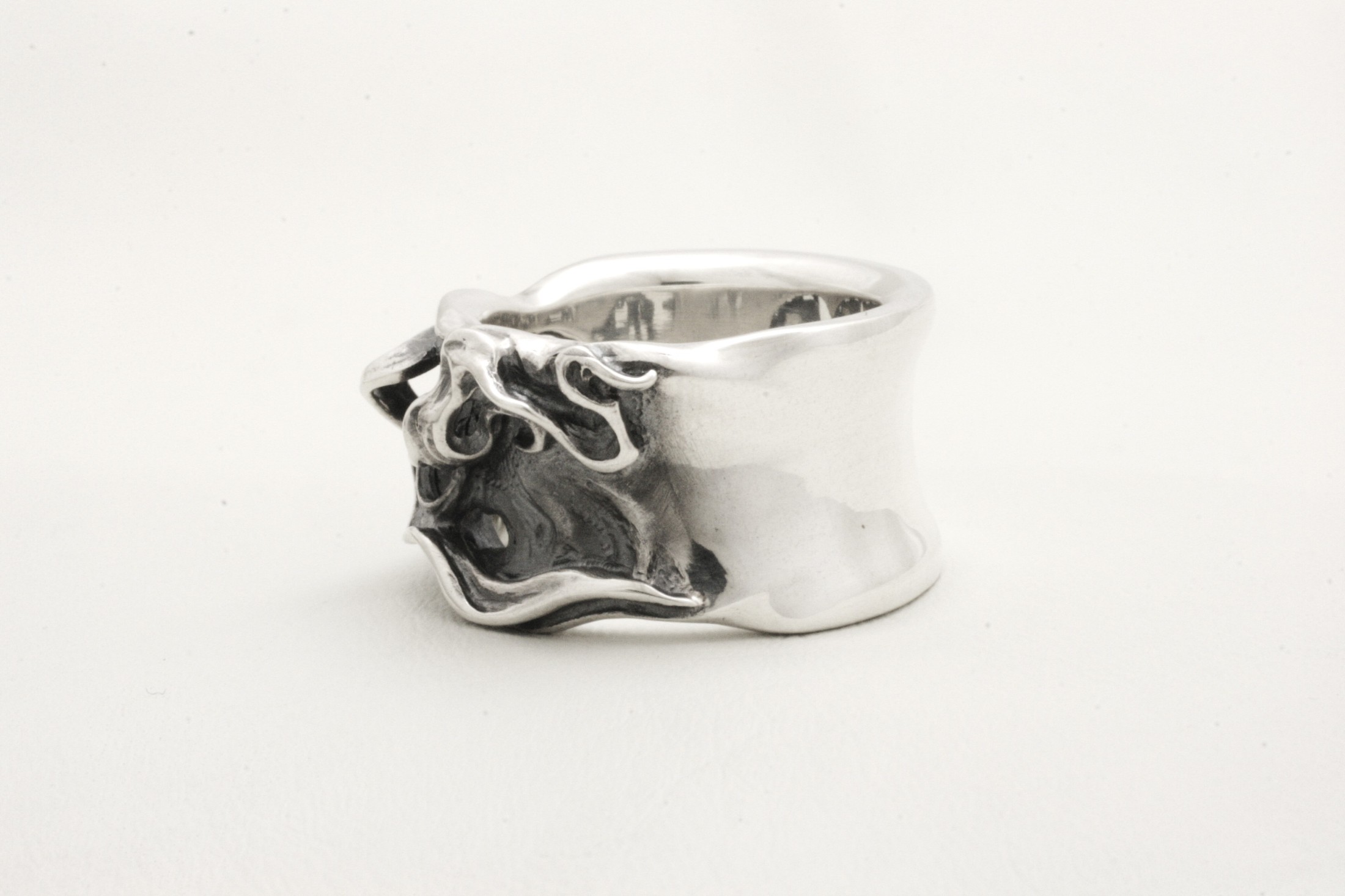 逆甲丸の幅広なリングの一面に燃えさかる炎が広がる様子を造形したデザイ