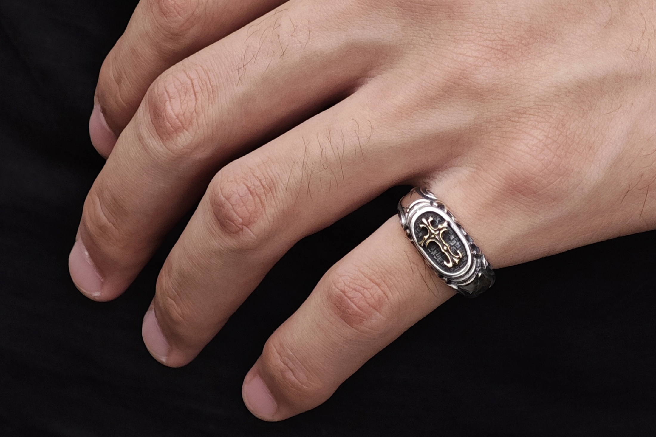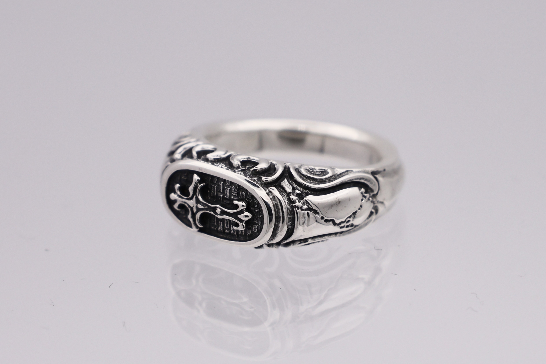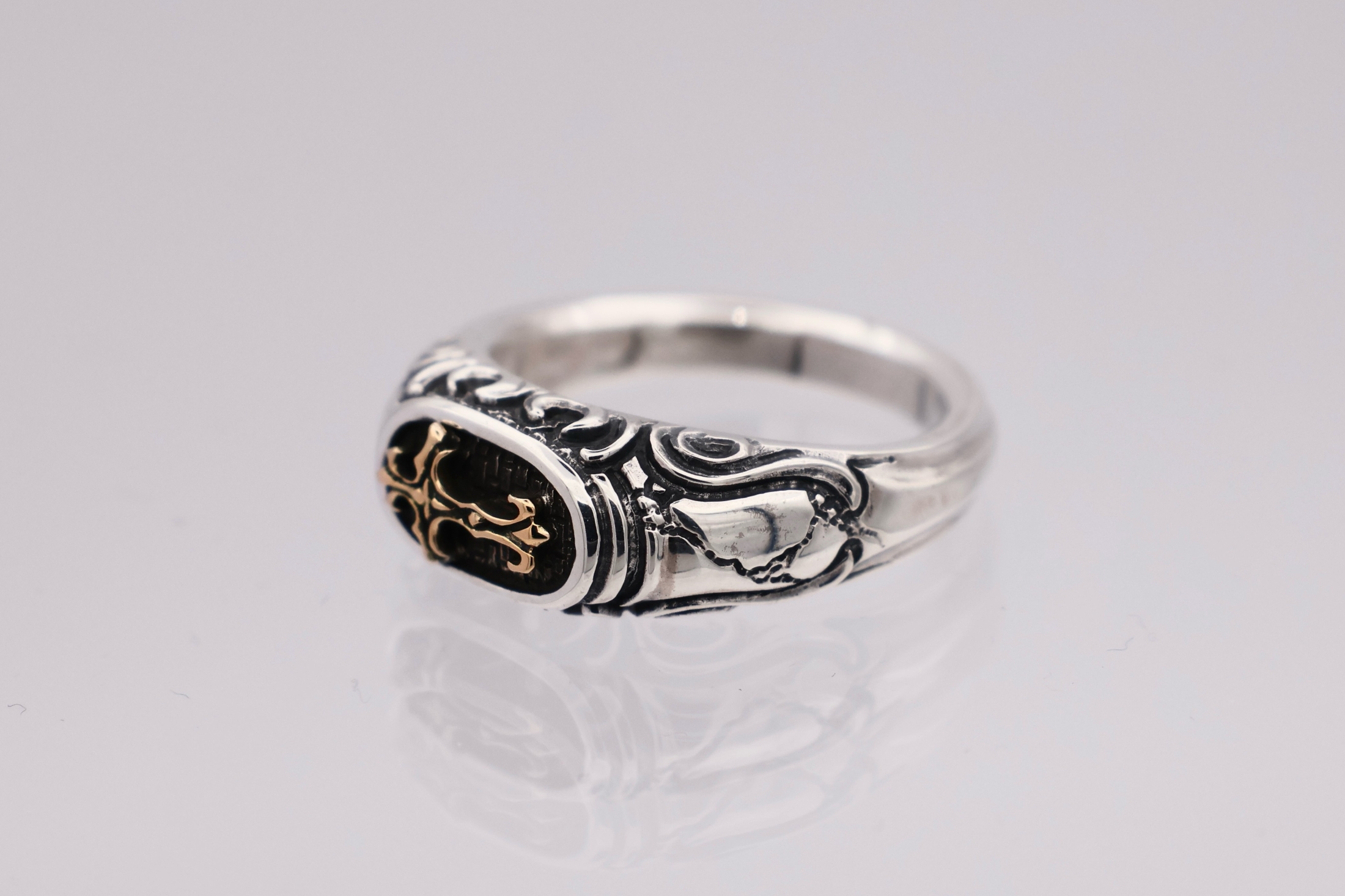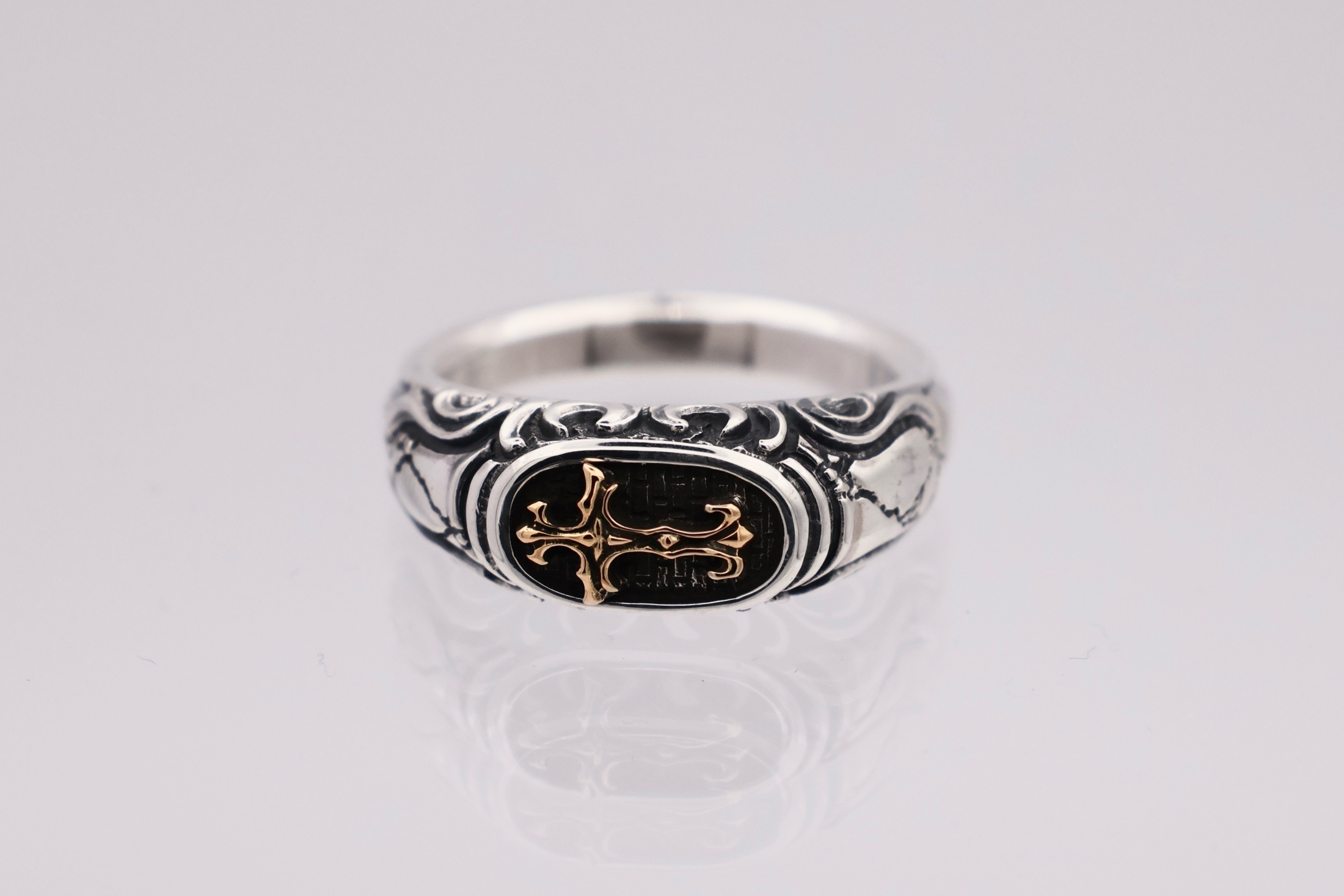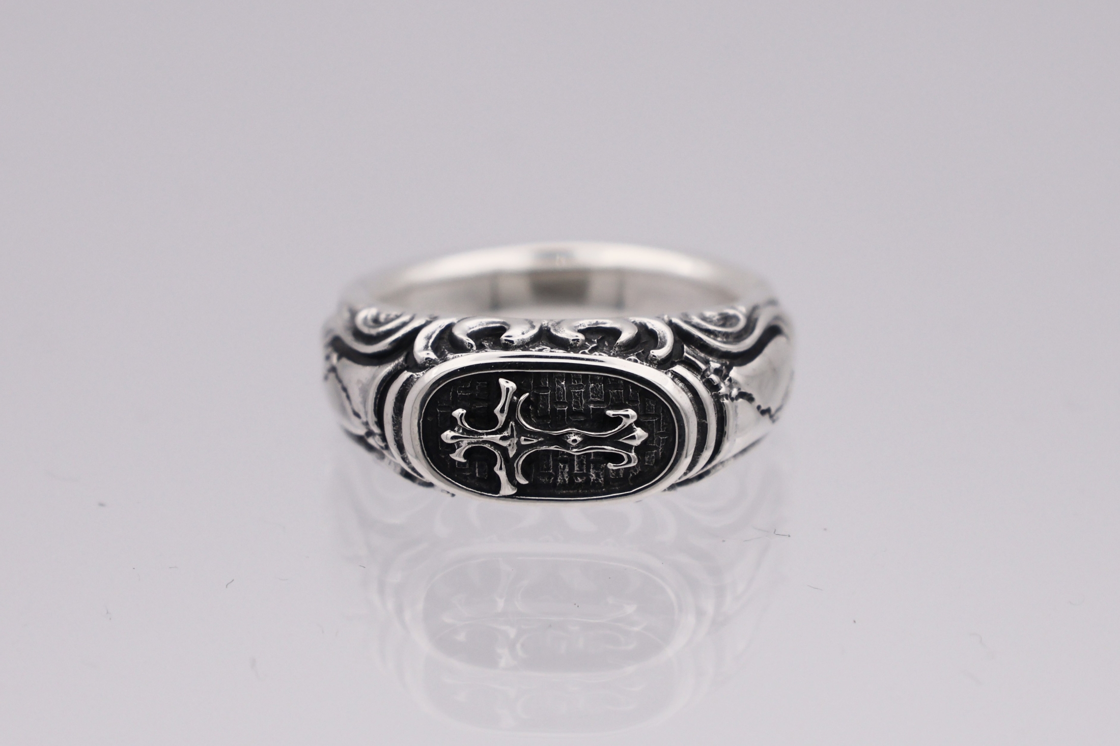 リングの中央にブラッドレスクロスモチーフを配置した印台型リング。「トゥーム