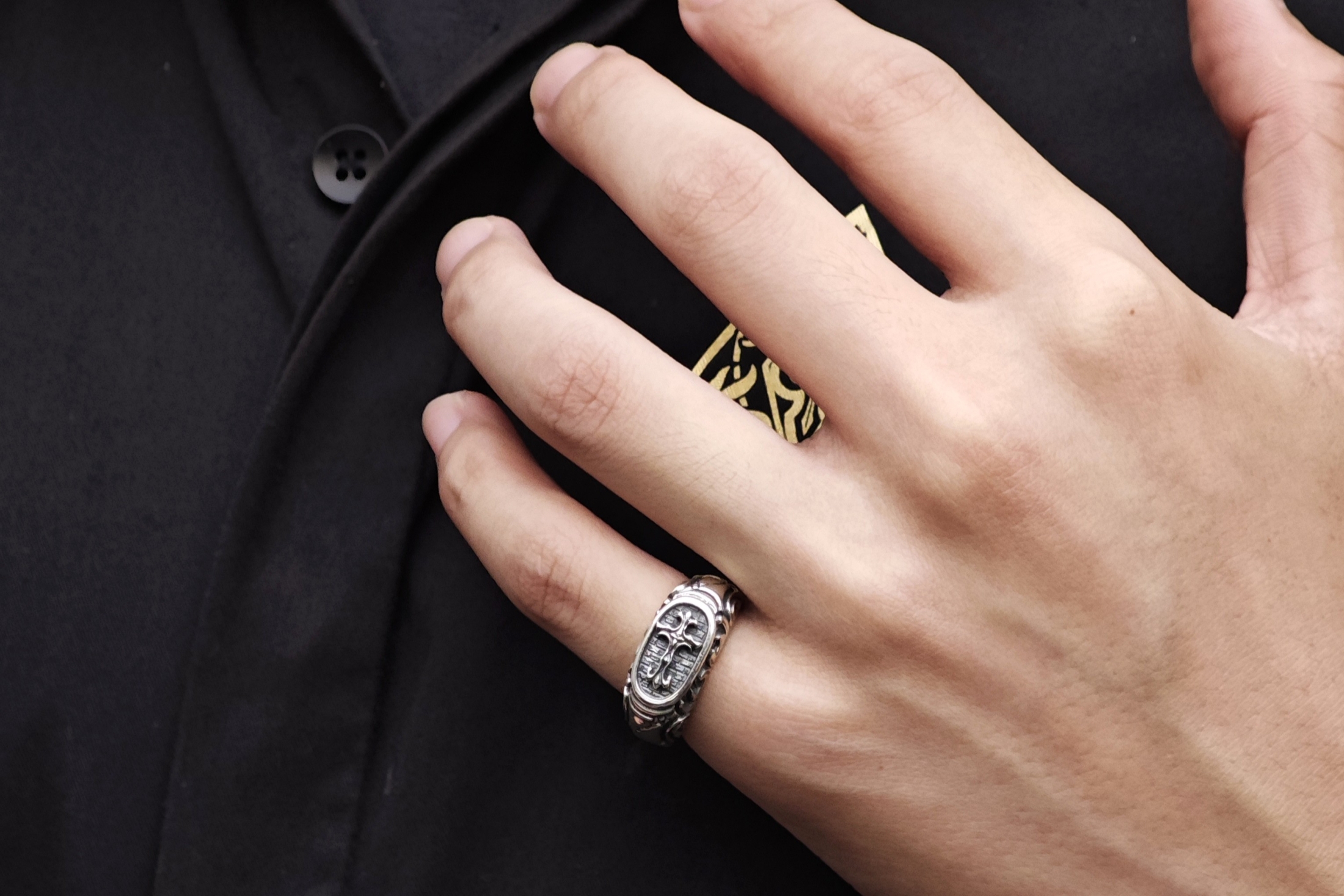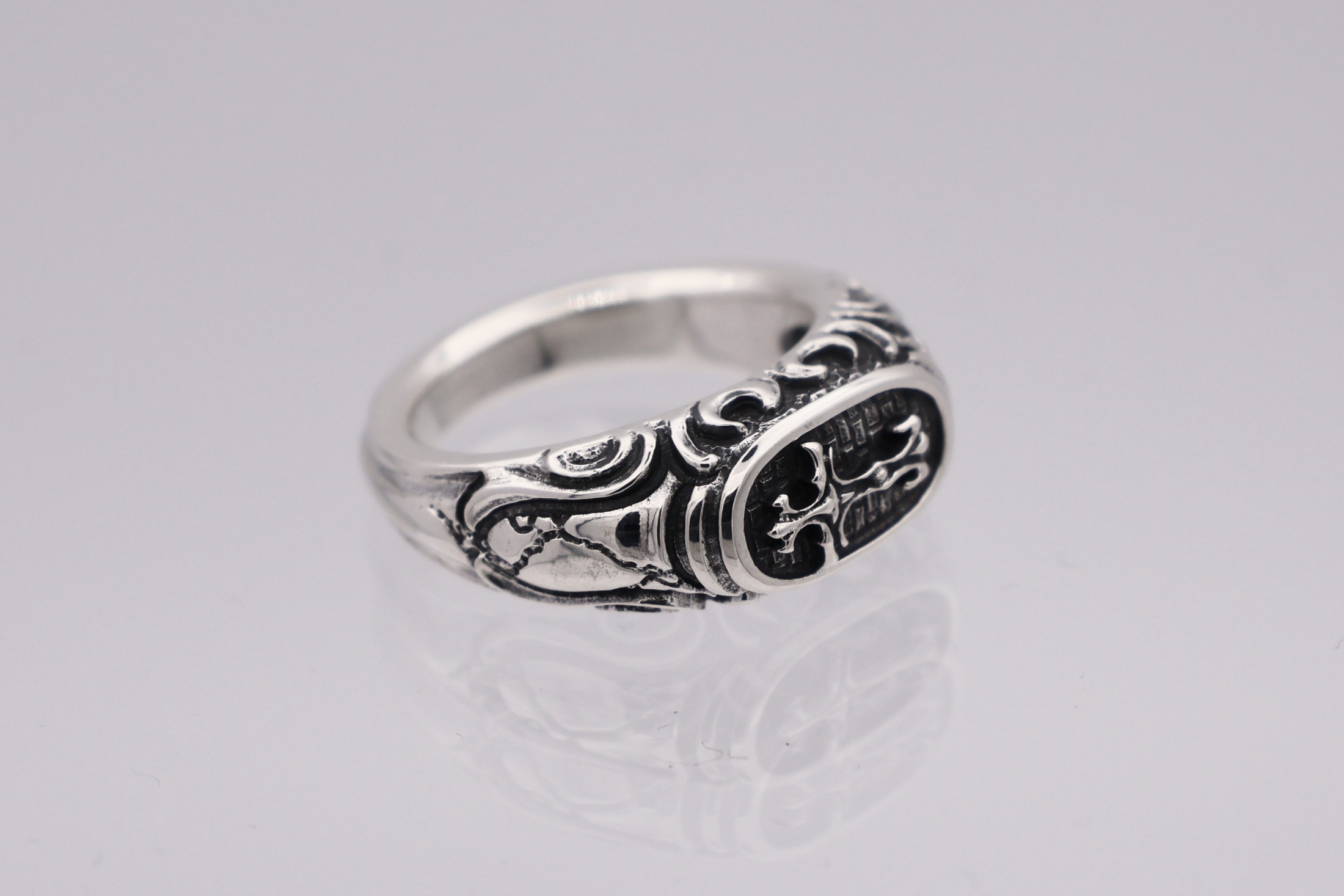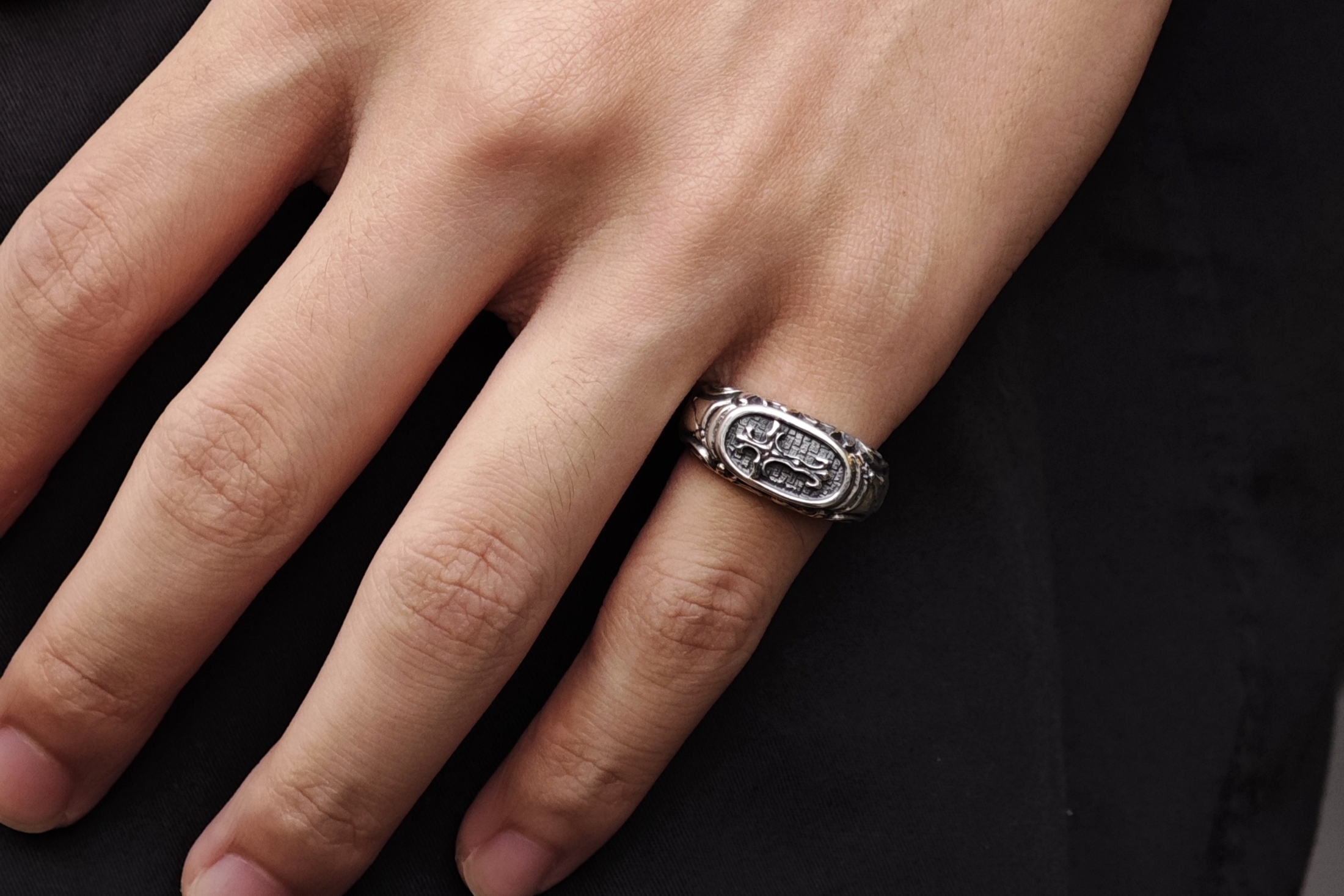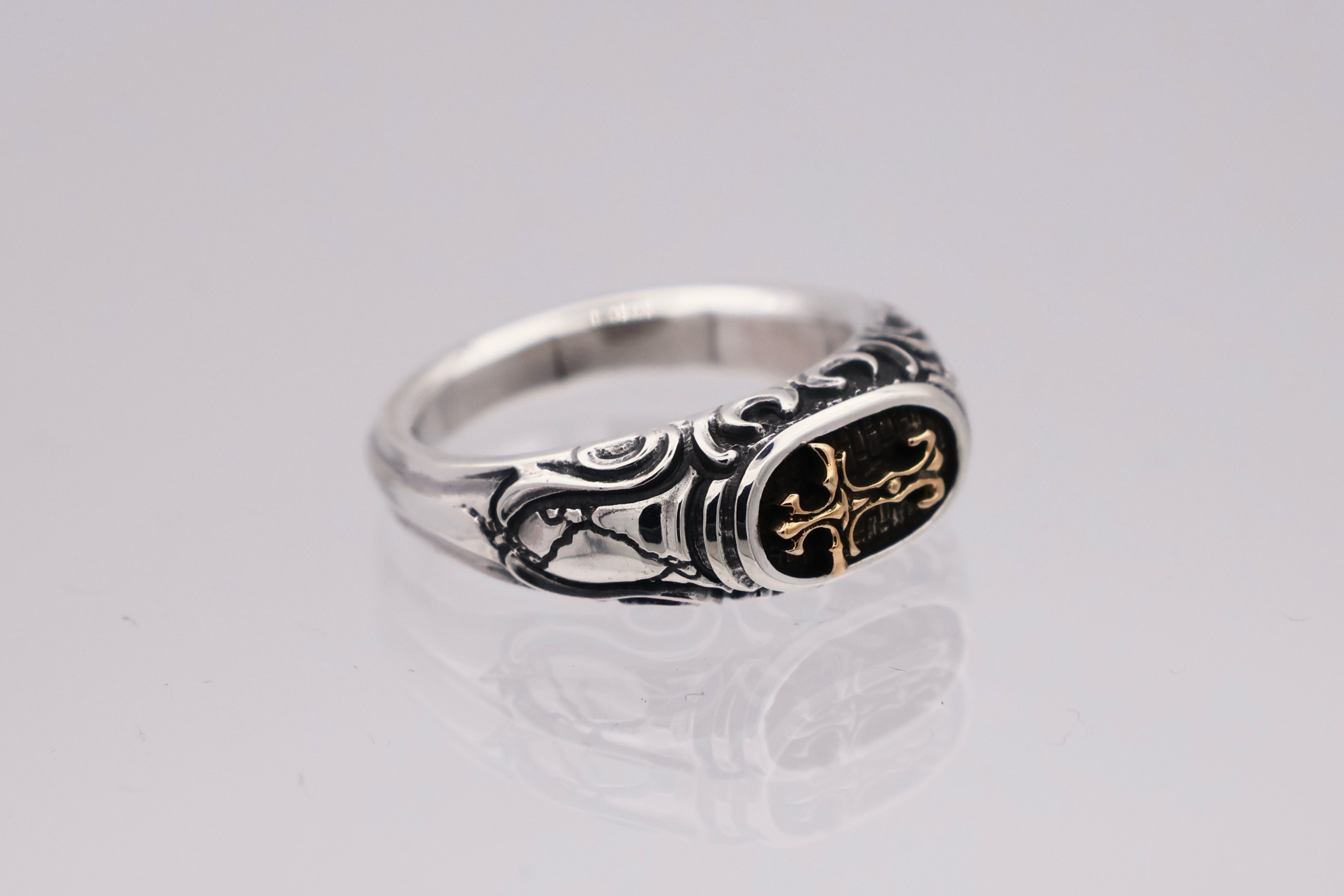 リングの中央にブラッドレスクロスモチーフを配置した印台型リング。「トゥーム