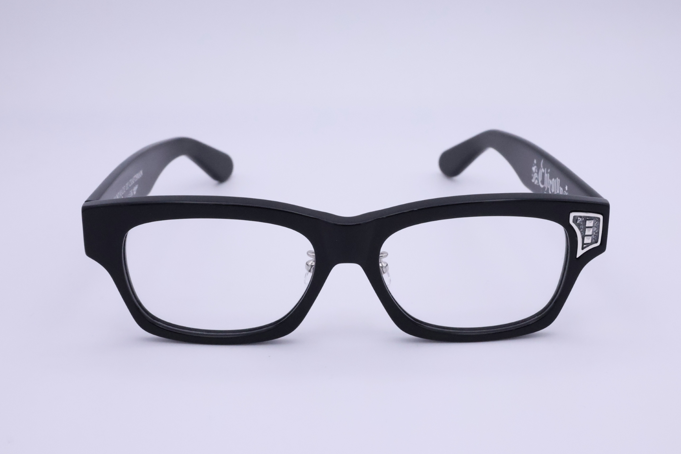 メガネのリムのシェイプに合わせてスタッズ