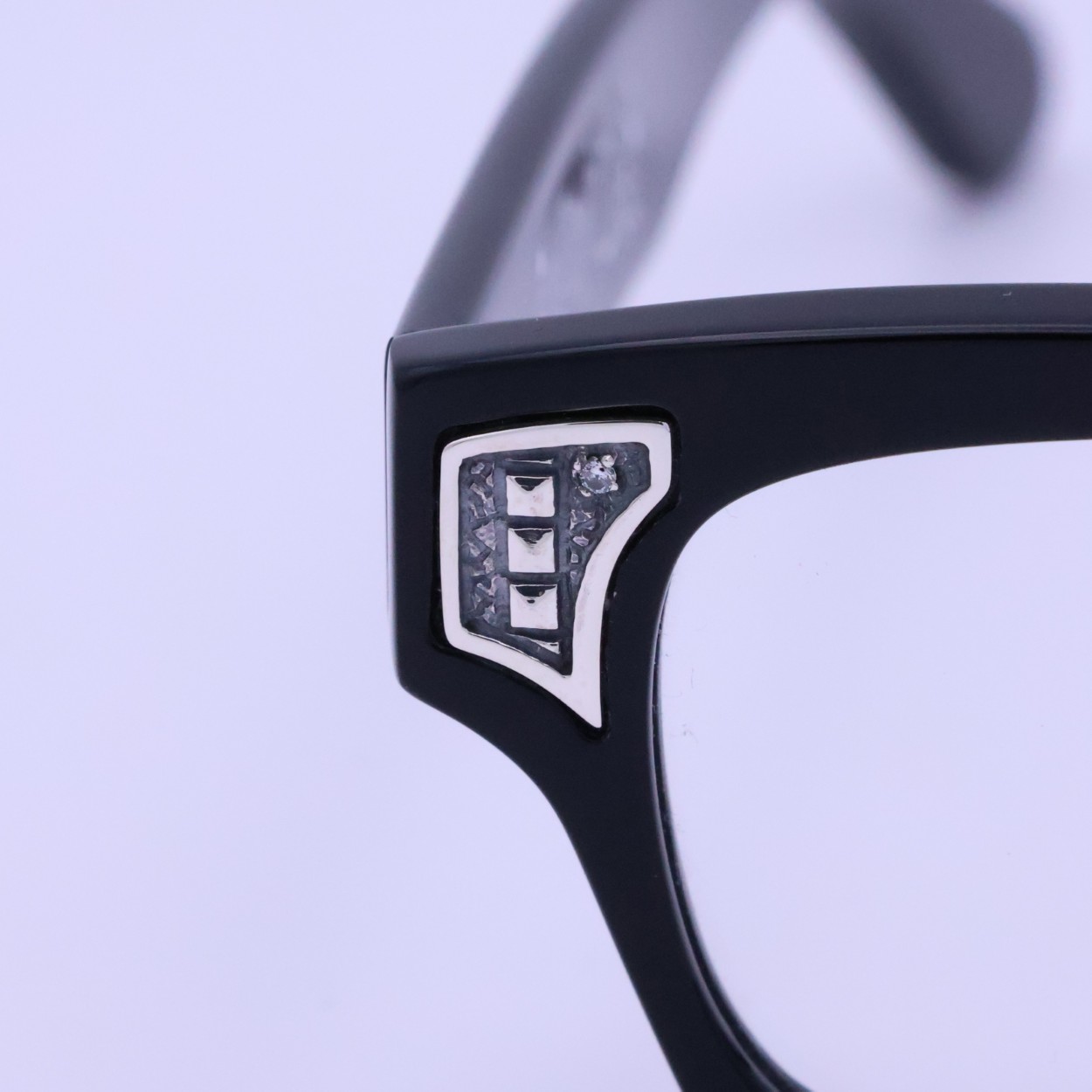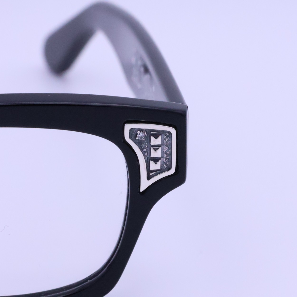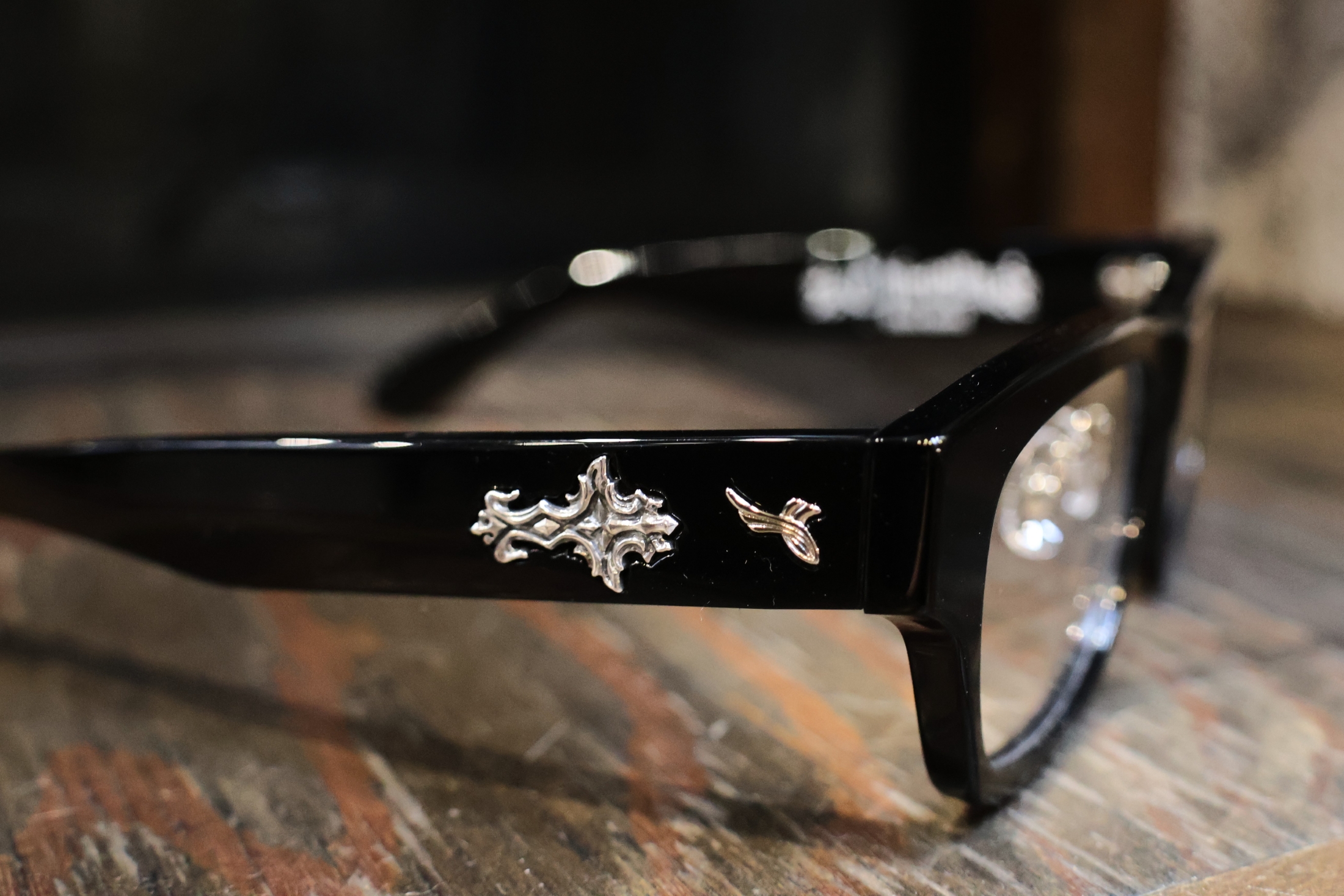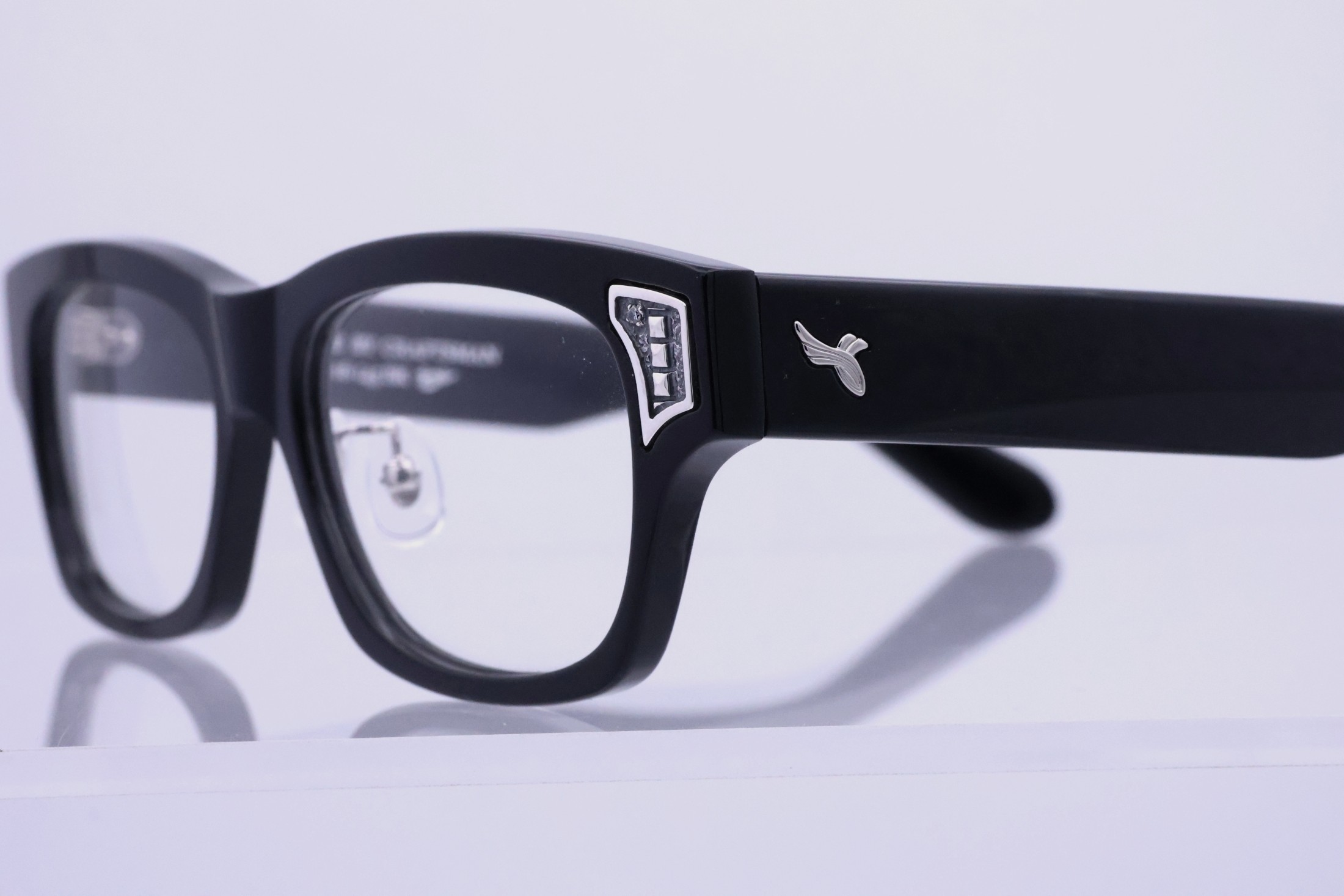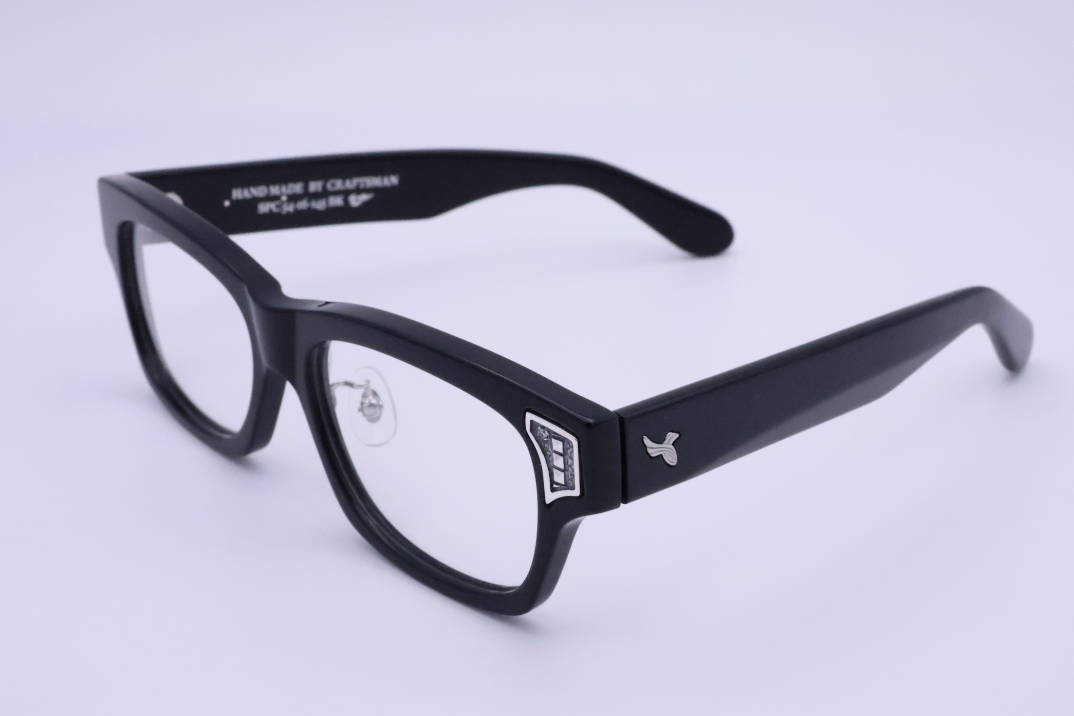 SILVER925製のパーツはプラ製のメガネのボディに手彫りでインレイ加工