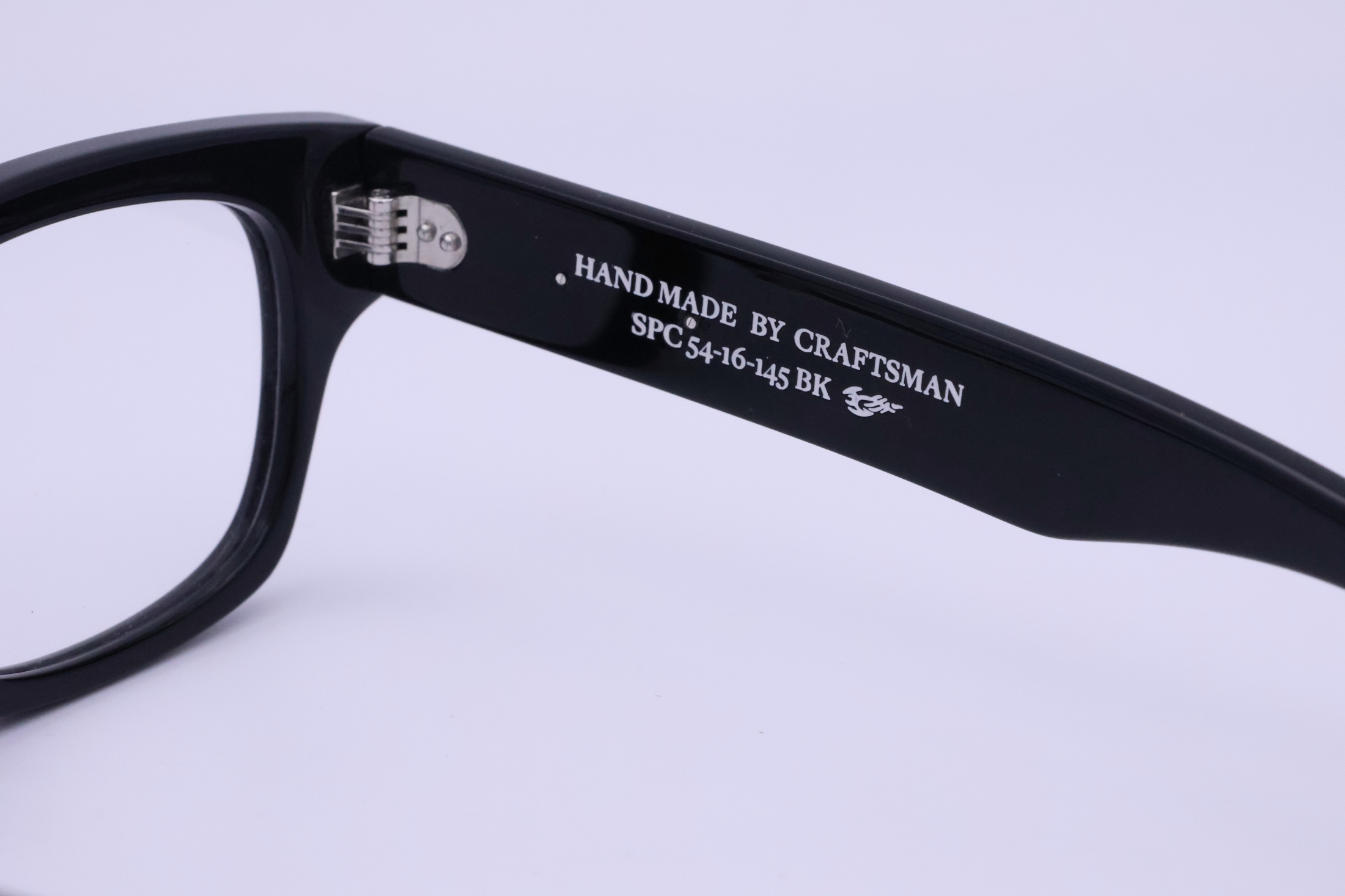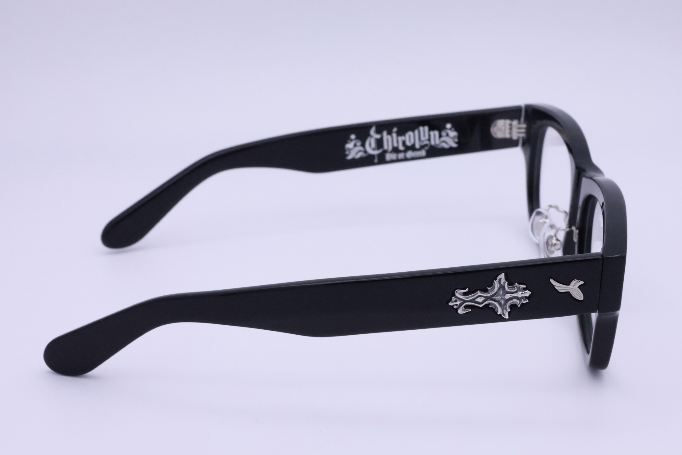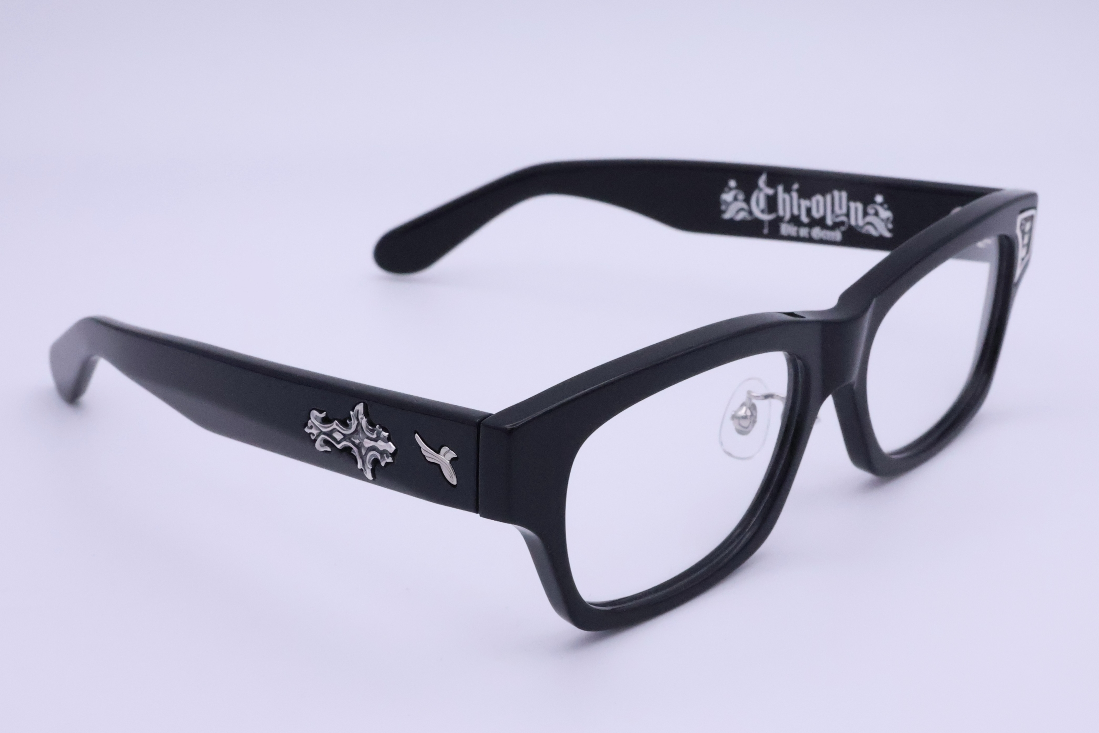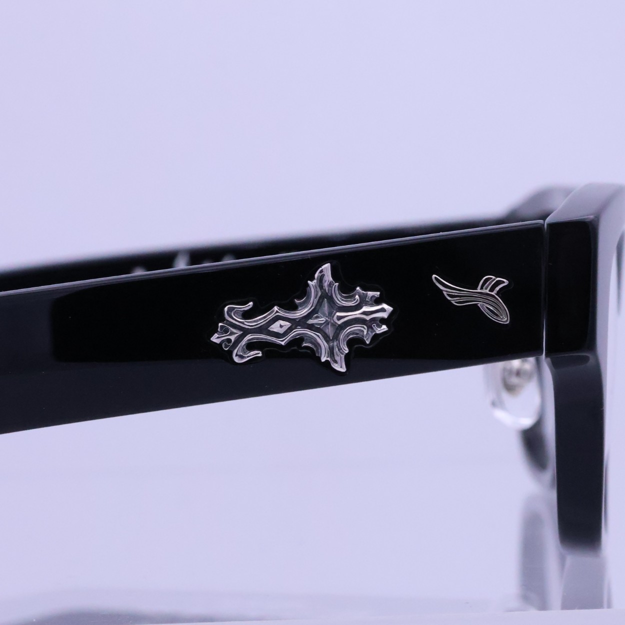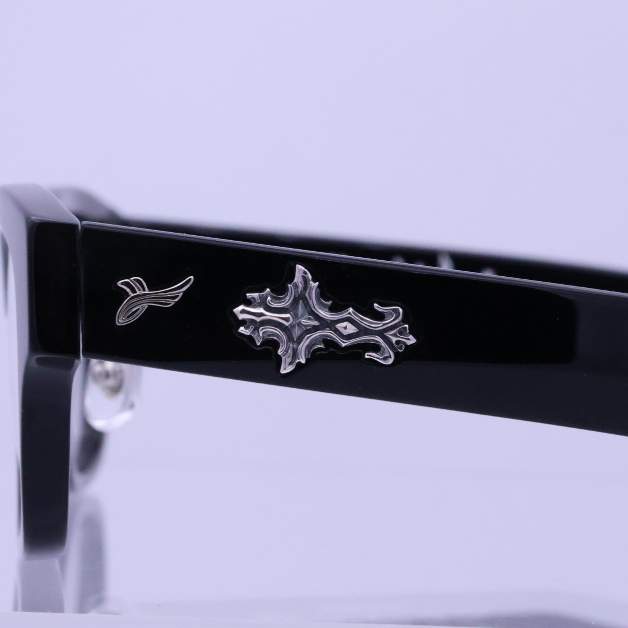 SILVER925製のパーツはプラ製のメガネのボディに手彫りでインレイ加工